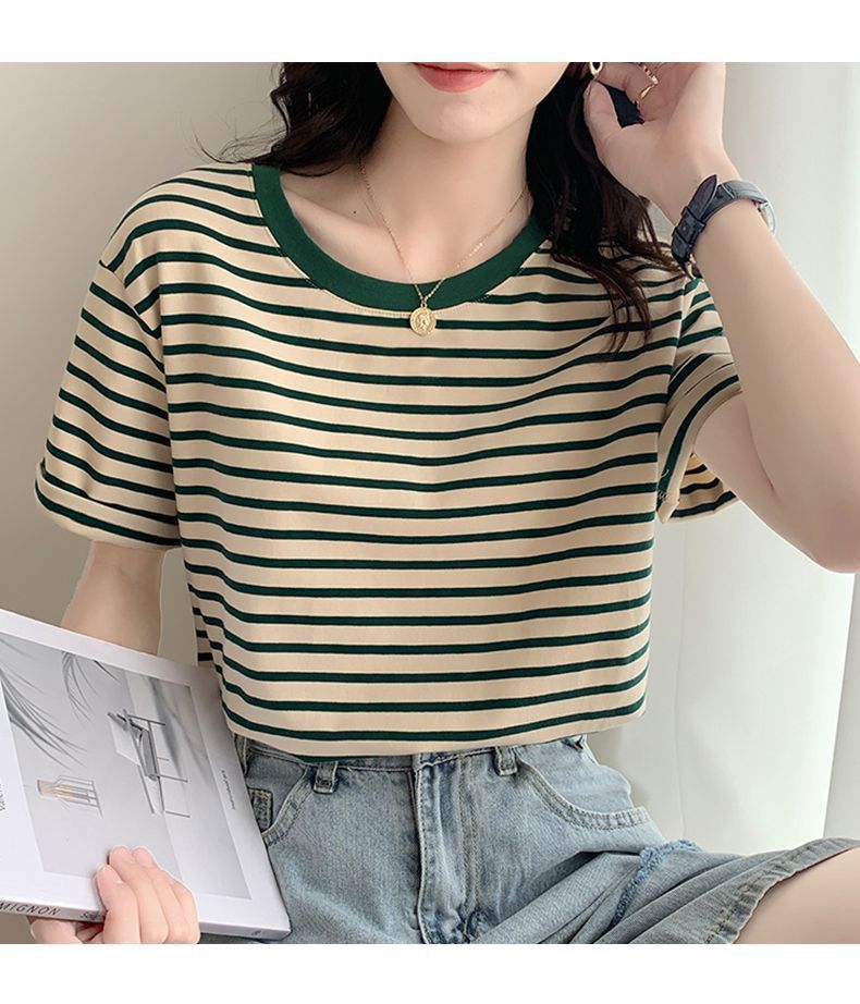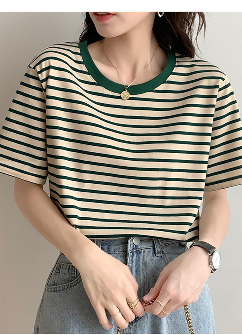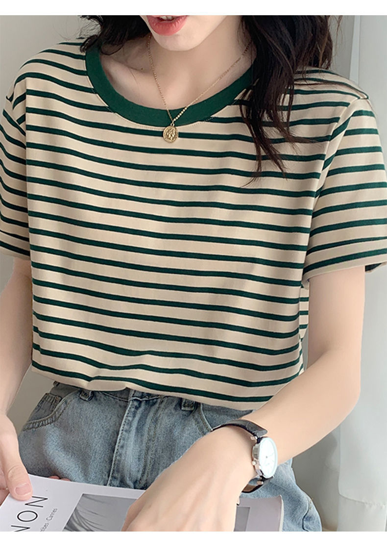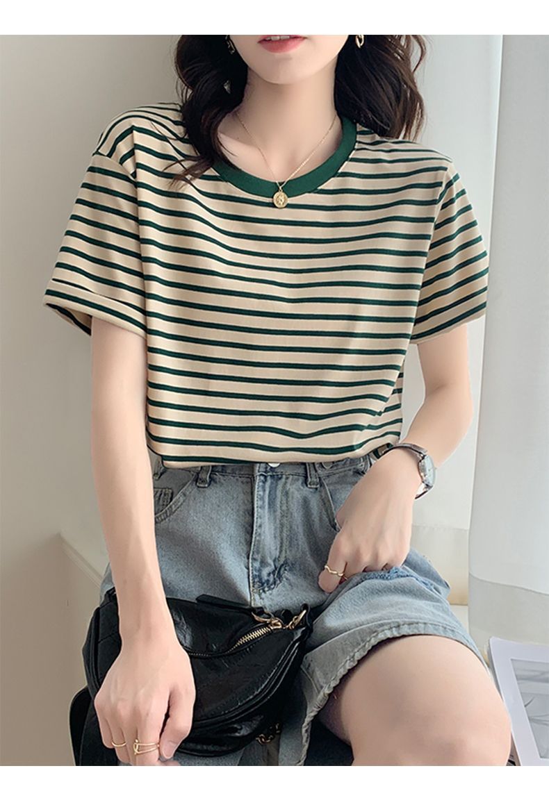크루넥 반팔 티셔츠 여성용 여름 루즈한 모든 경기 학생 2023 새로운 디자인 센스 그린 스트라이프 티셔츠 탑스토어 가기