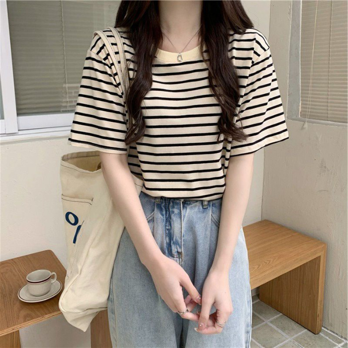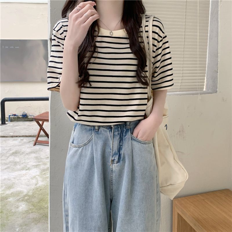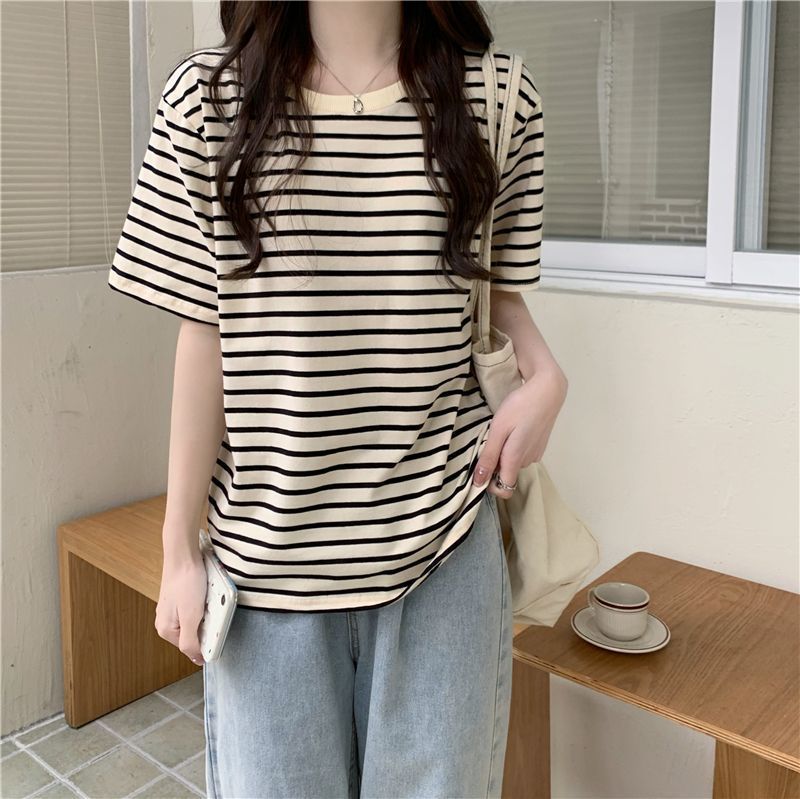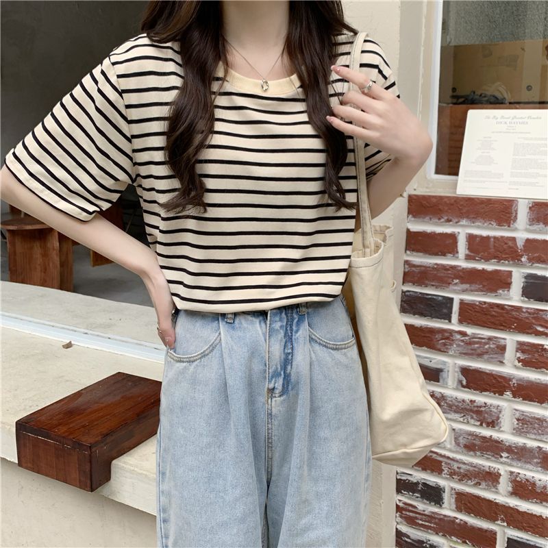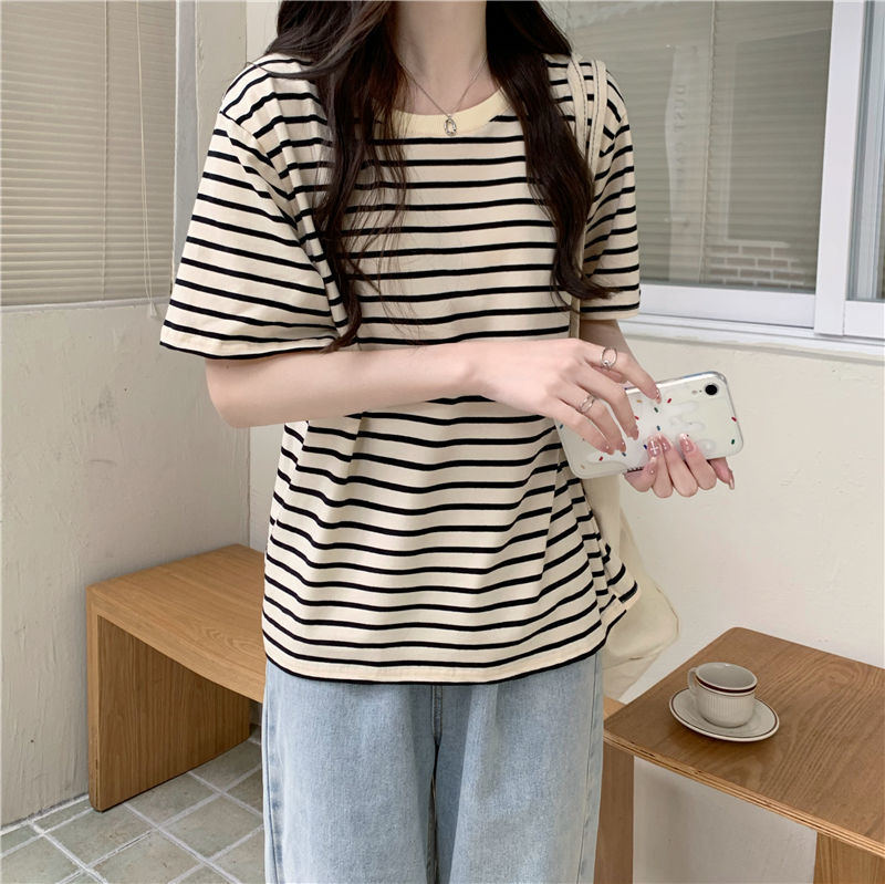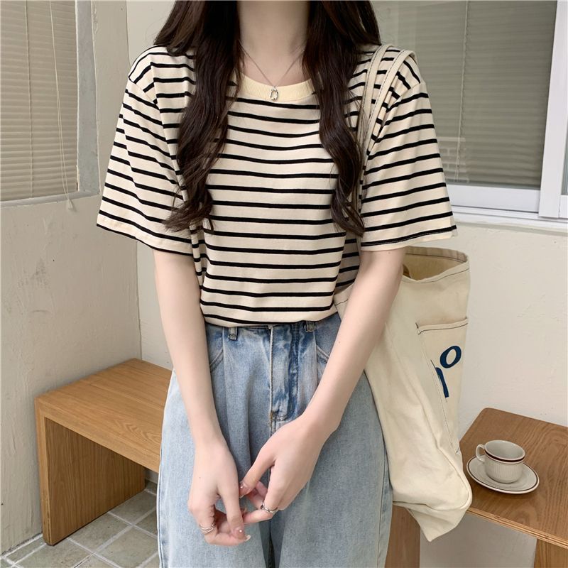 크루넥 반팔 티셔츠 여성용 여름 루즈한 모든 경기 학생 2023 새로운 디자인 센스 그린 스트라이프 티셔츠 탑스토어 가기