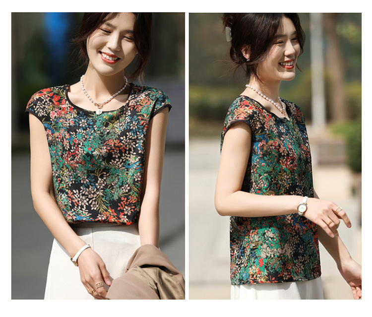2023 여름 새로운 중국 예술 크루넥 새틴 T 여자의 느슨한 에스닉 스타일 꽃 소매 아세트산 조끼 도매