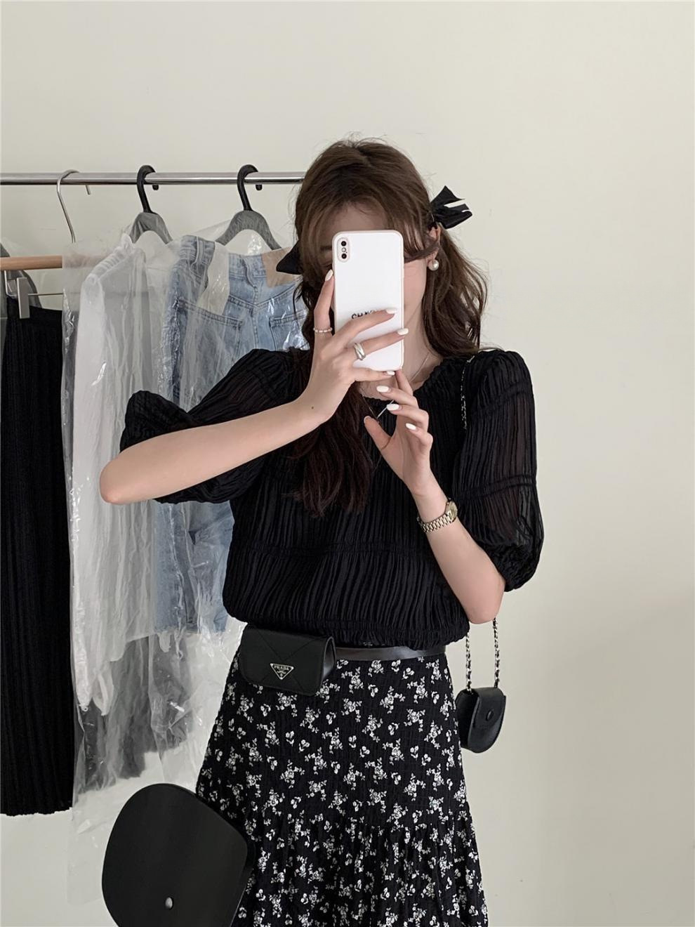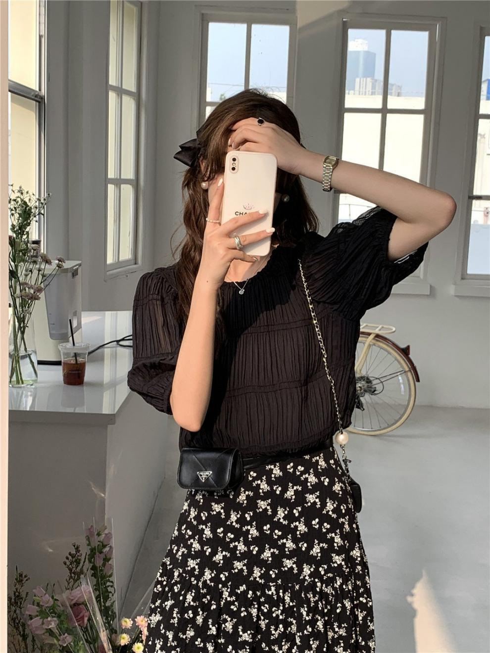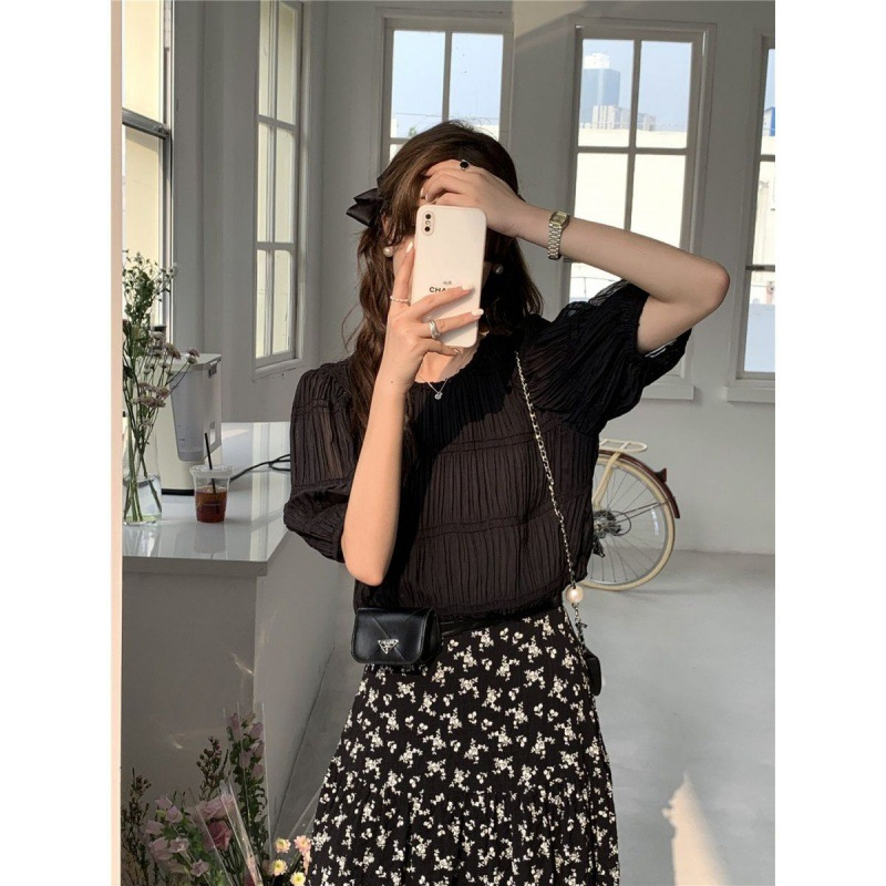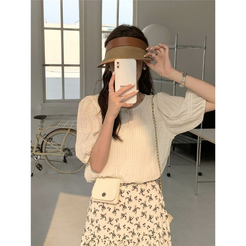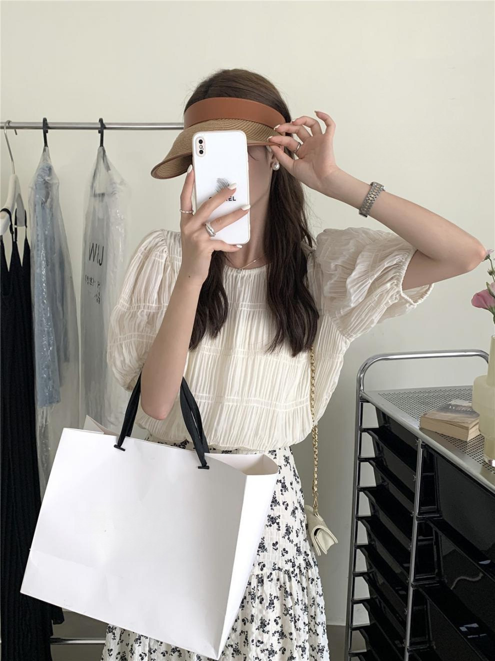 화이트 퍼프 슬리브 디자인 센스 반소매 셔츠 여성용 2023 여름 새로운 우아한 프랑스 시크 플리츠 쉬폰 셔츠스토어 가기