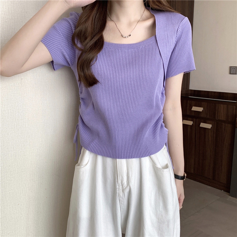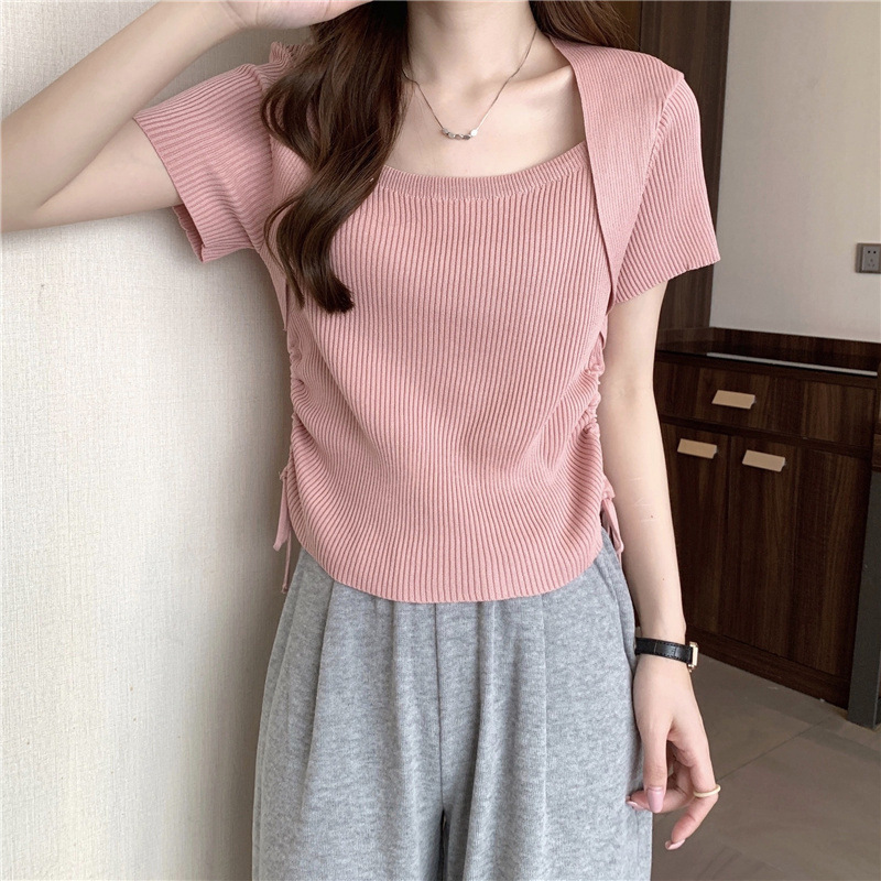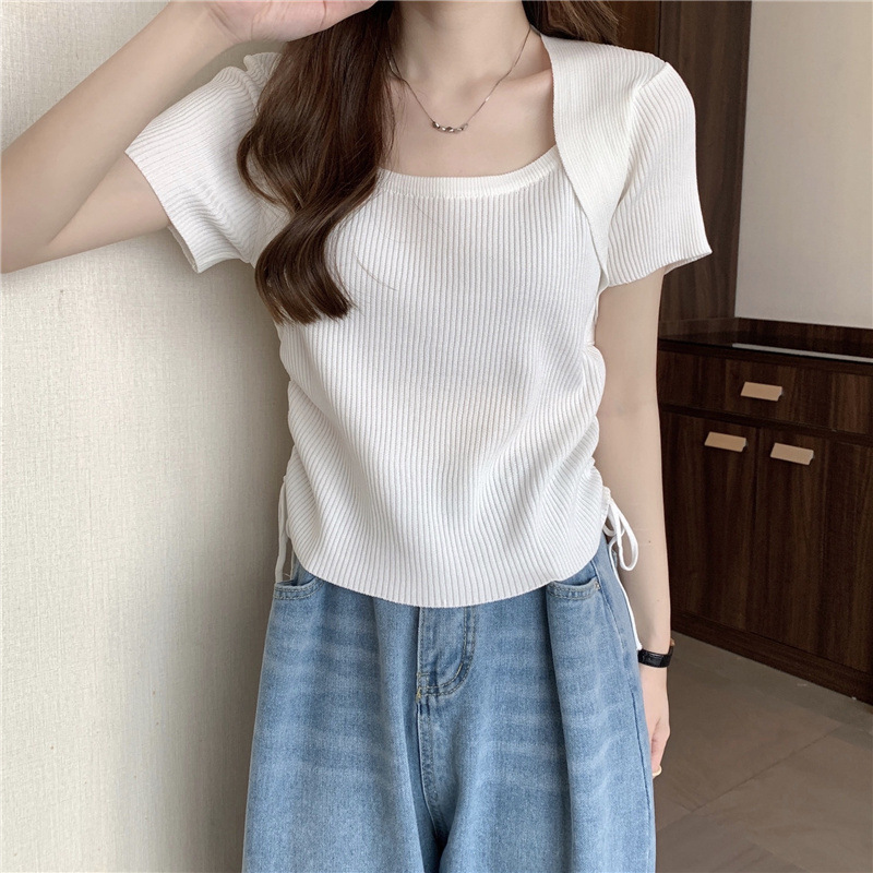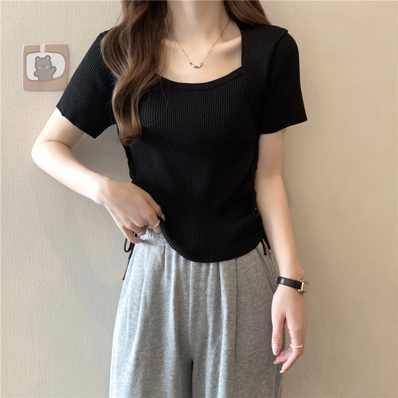 2023 여름 새로운 스트라이프 대비 컬러 숄 디자인 센스 드로스트링 니트 셔츠 슬림핏 반팔 티셔츠 베이스 탑 여성