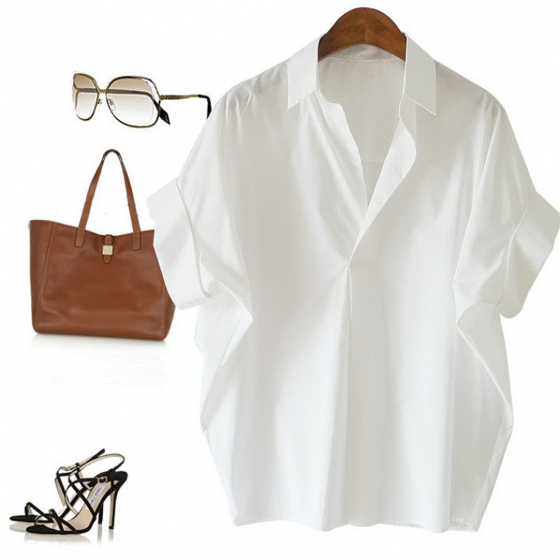 빈티지 홍콩 스타일 반팔 셔츠 여성의 여름 새로운 스타일 모든 매치 화이트 셔츠 느슨한 박쥐 소매 칼라 탑