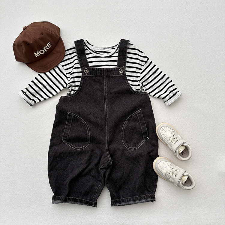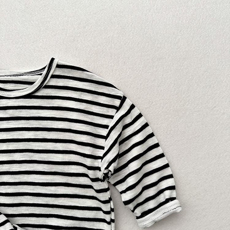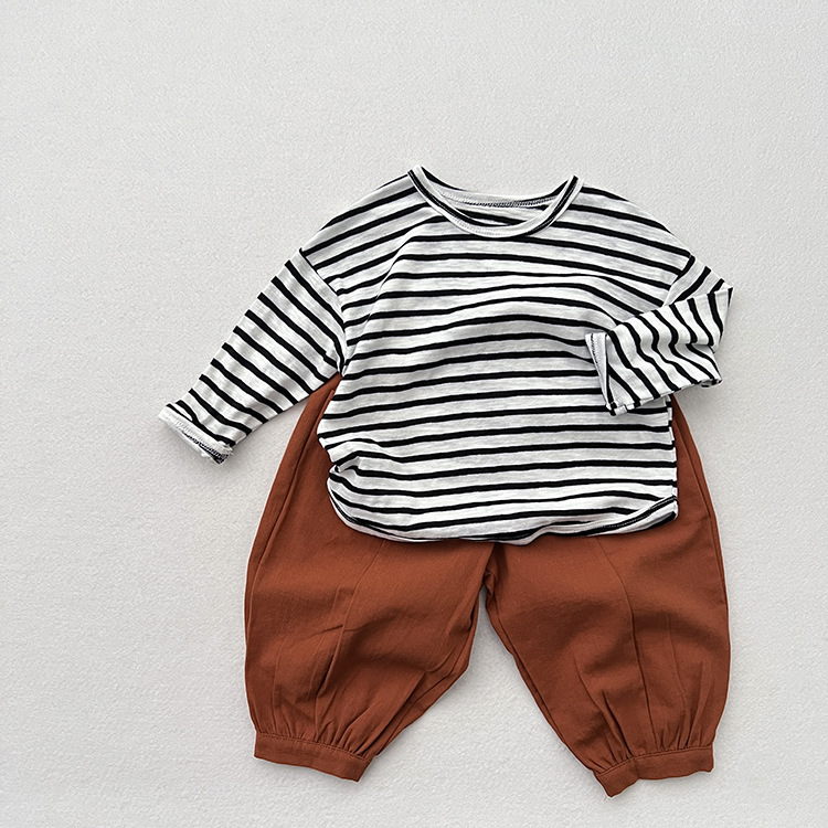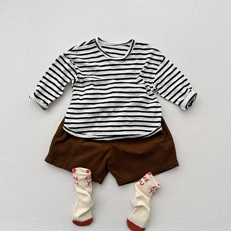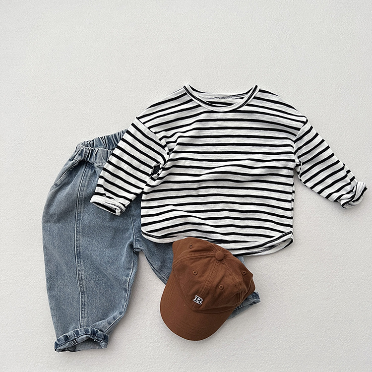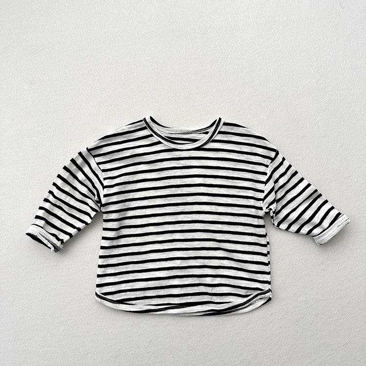 봄과 가을 신작 ~ 소년 소녀 심플 긴팔 대나무 면 베이스 셔츠 어린이 셔츠 모리 기본 스트라이프 크루넥 티셔츠