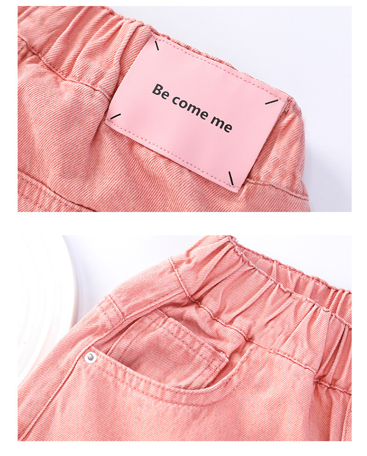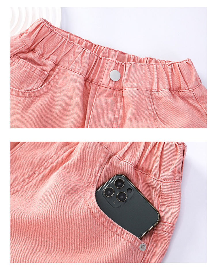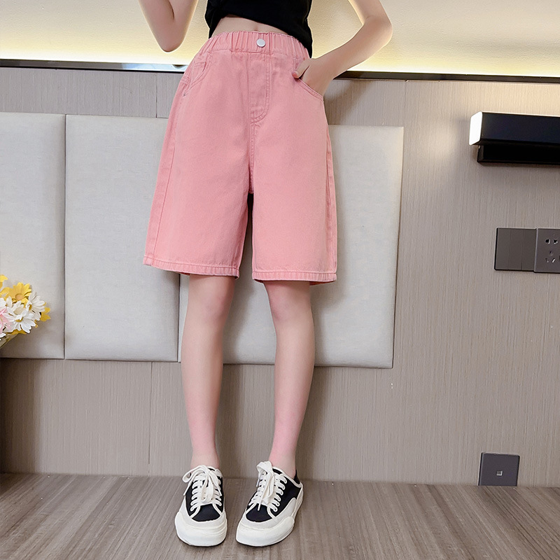 여아 핑크 반바지 여름 2023 새로운 스타일 중형 어린이 웨스턴 스타일 하이 웨이스트 중간 길이 바지 어린이 느슨한 면 5 길이 바지