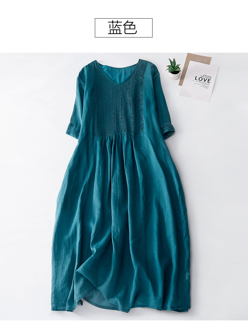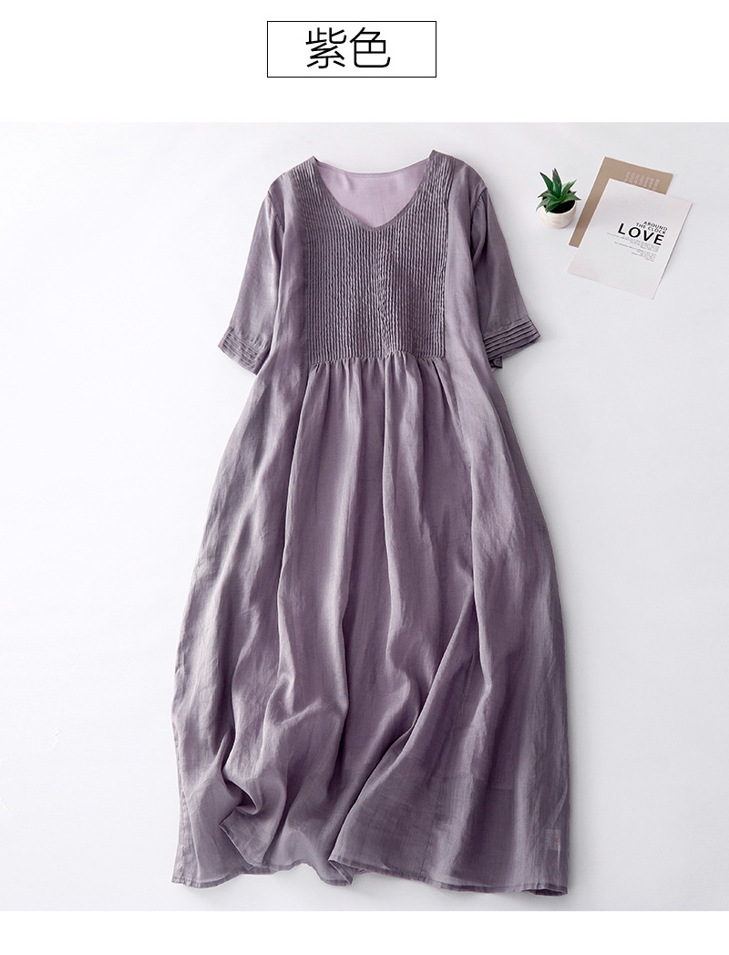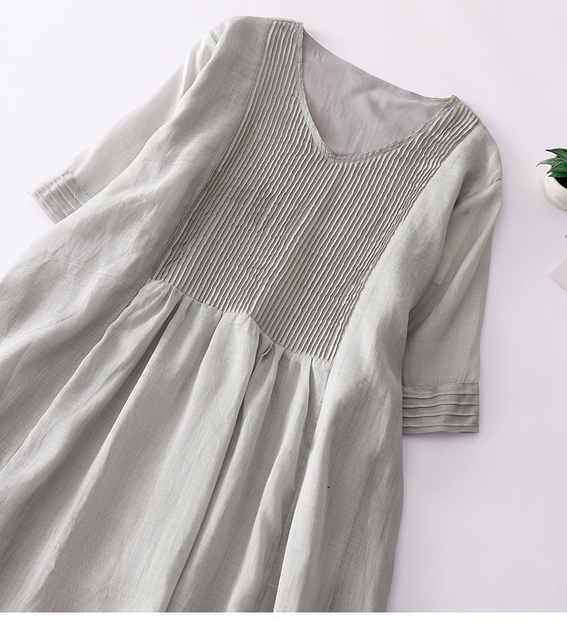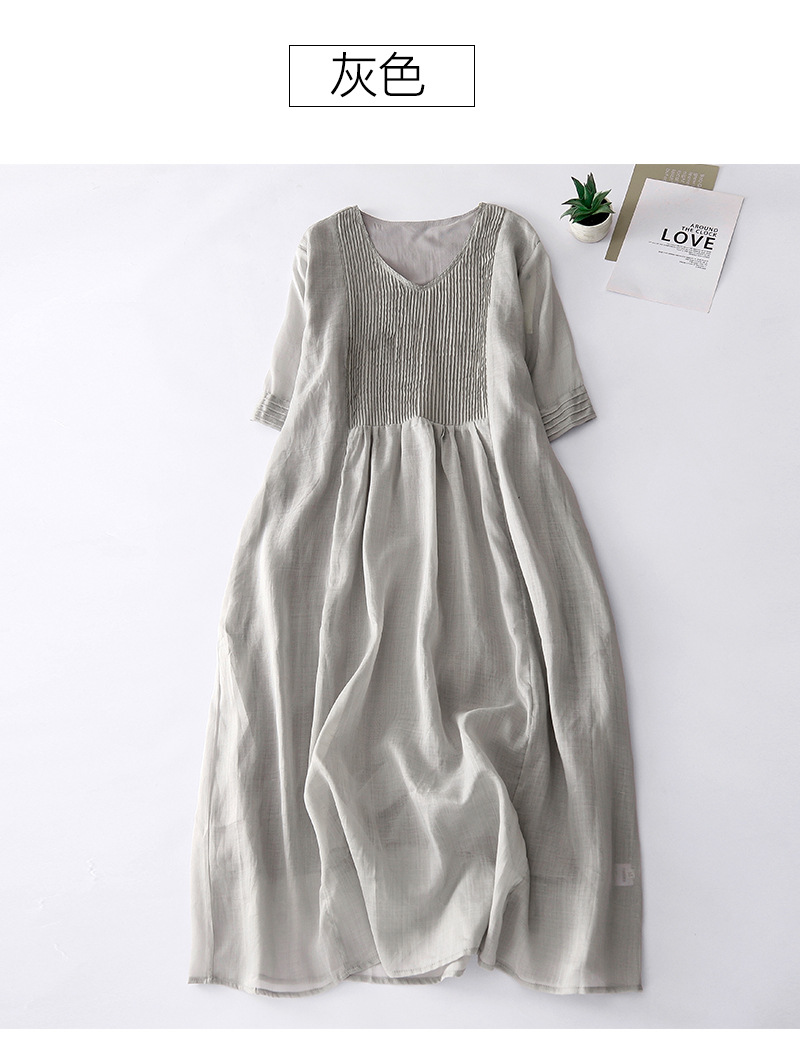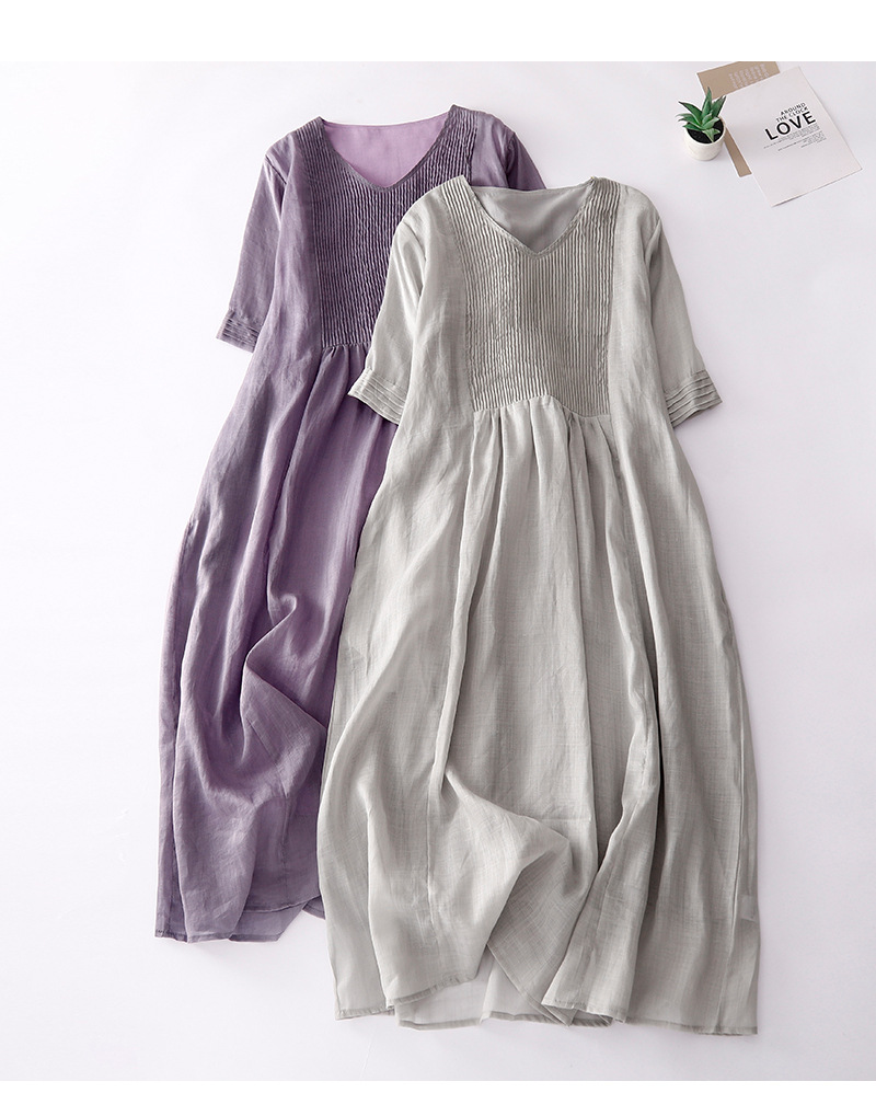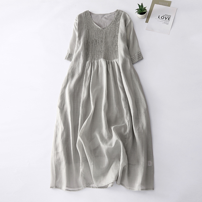 빈티지 디자인 감각 오르간 주름 원피스 예술적 단색 V-넥 라미 쿨 슬리밍 긴 원피스 여성용스토어 가기