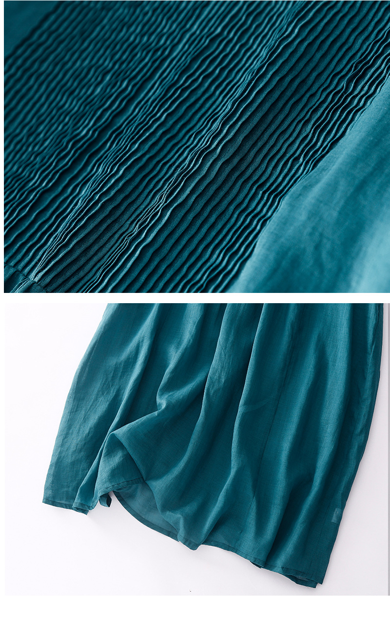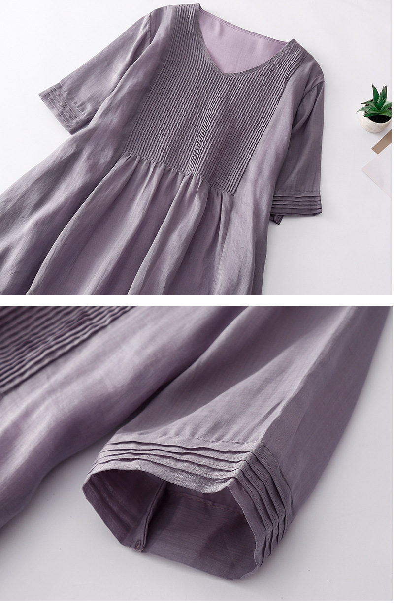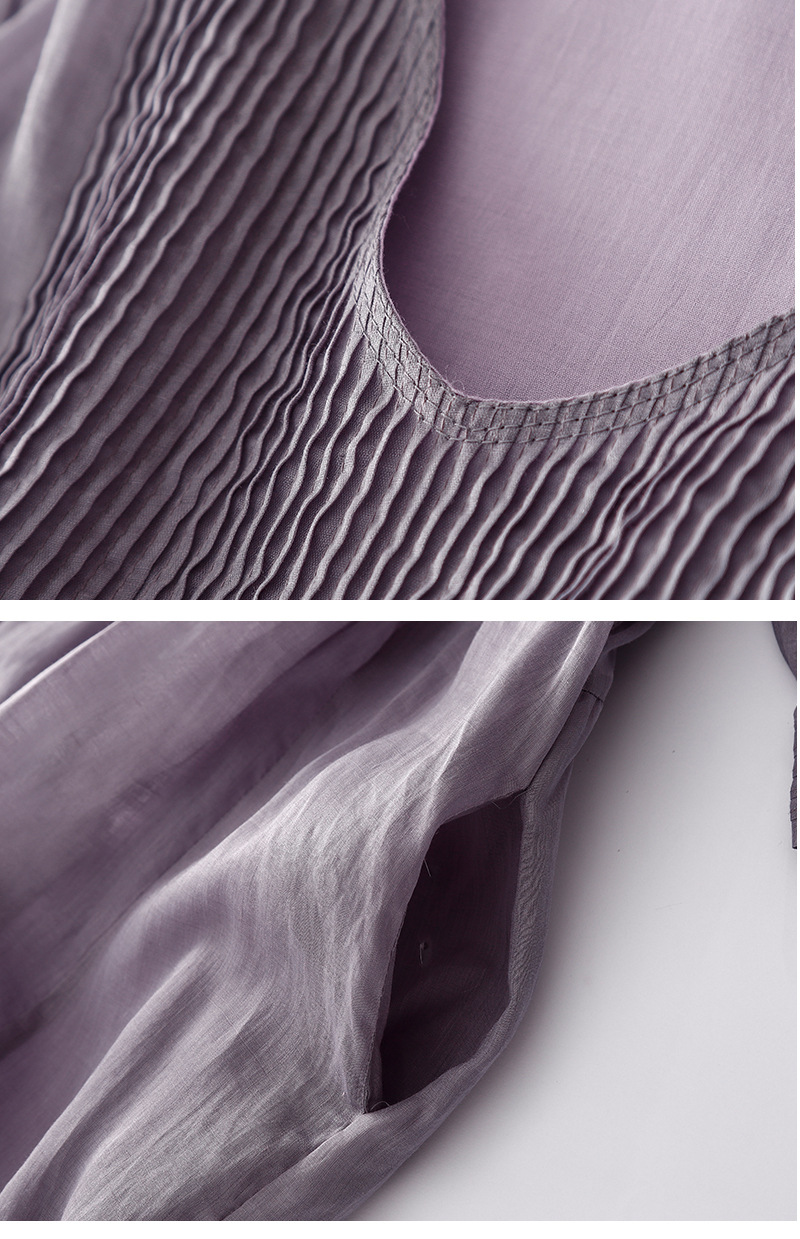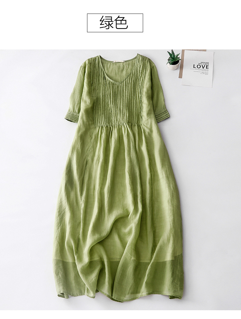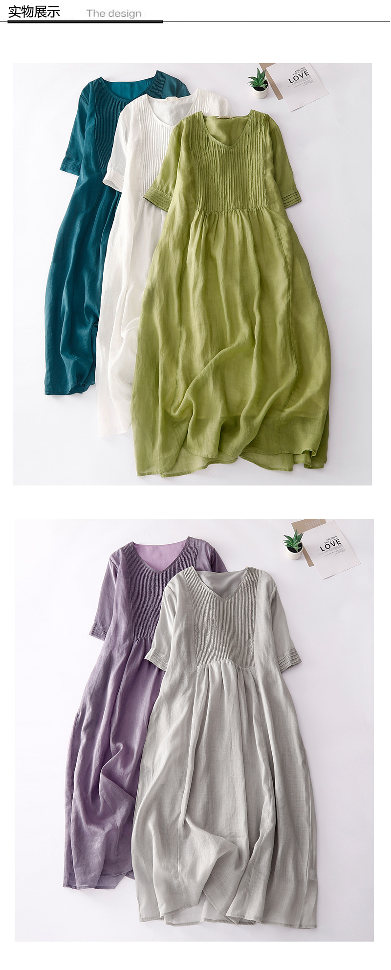 빈티지 디자인 감각 오르간 주름 원피스 예술적 단색 V-넥 라미 쿨 슬리밍 긴 원피스 여성용스토어 가기