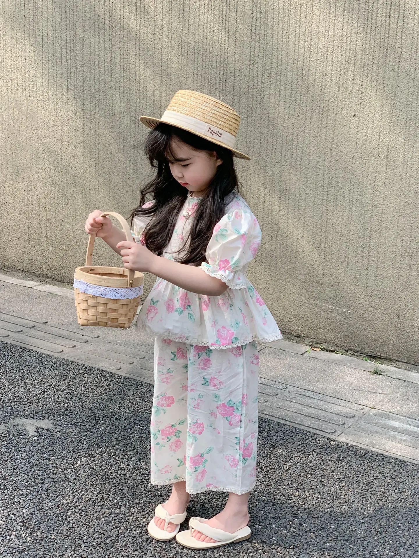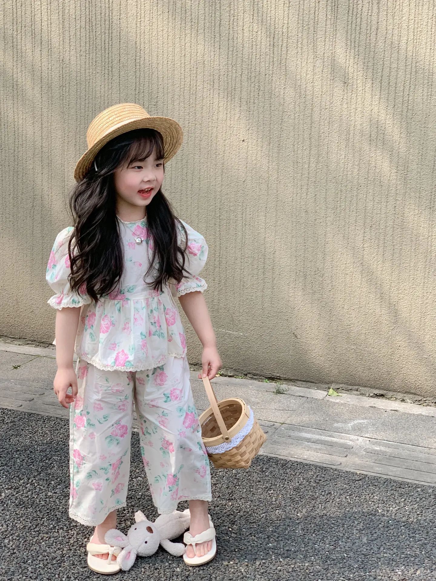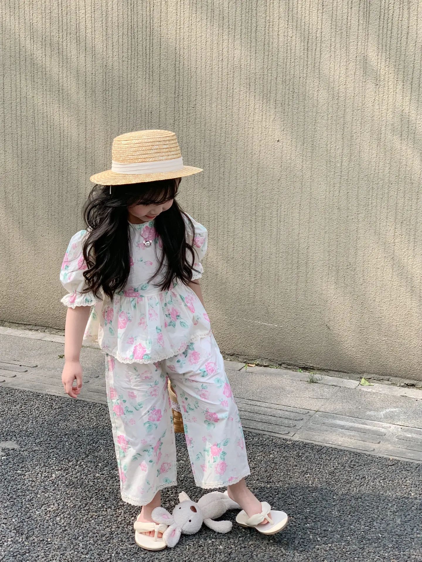 여아 여름 풀 프린트 레이스 에지 레이스업 웨이스트 버블 반팔 공주 인형 셔츠 + 루즈한 와이드 팬츠