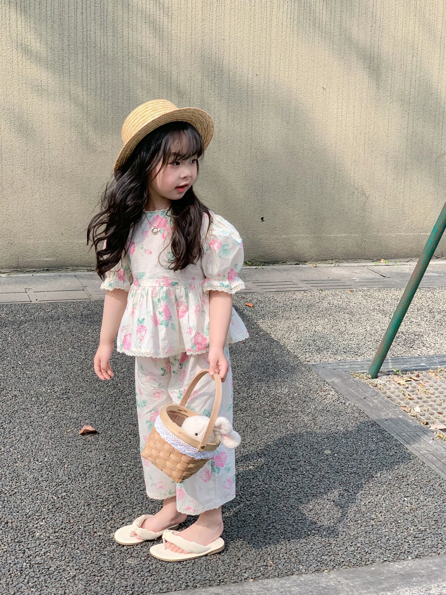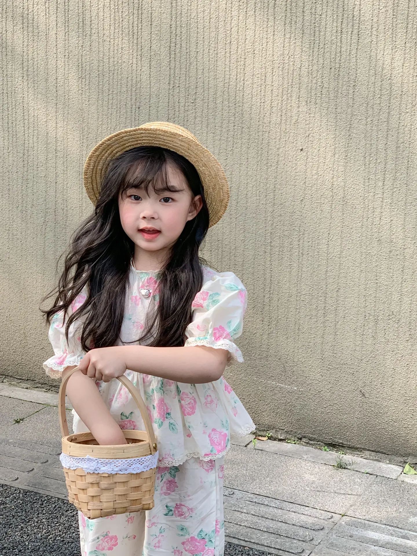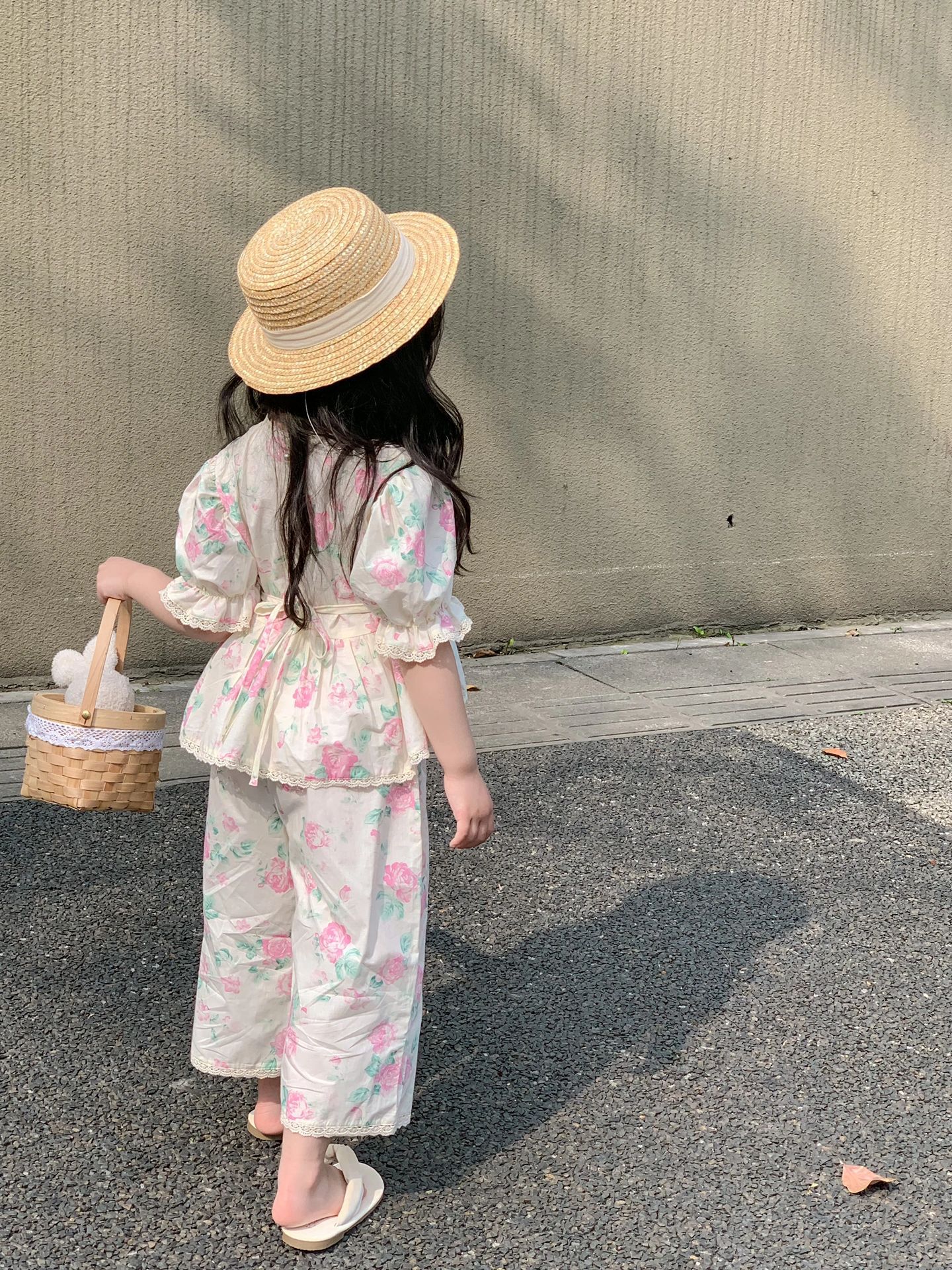 여아 여름 풀 프린트 레이스 에지 레이스업 웨이스트 버블 반팔 공주 인형 셔츠 + 루즈한 와이드 팬츠스토어 가기