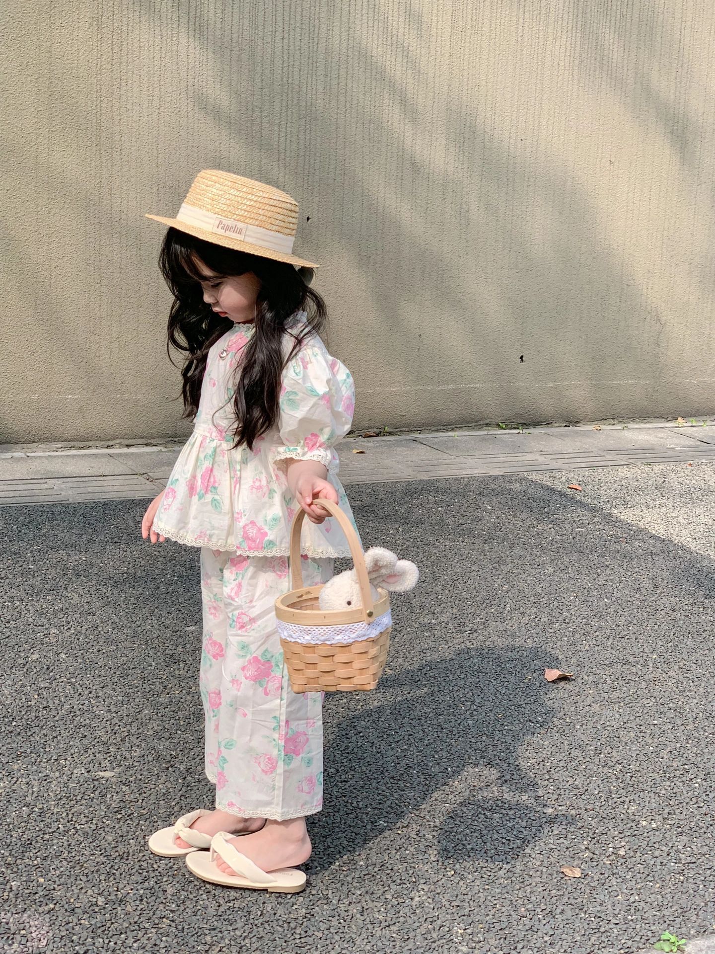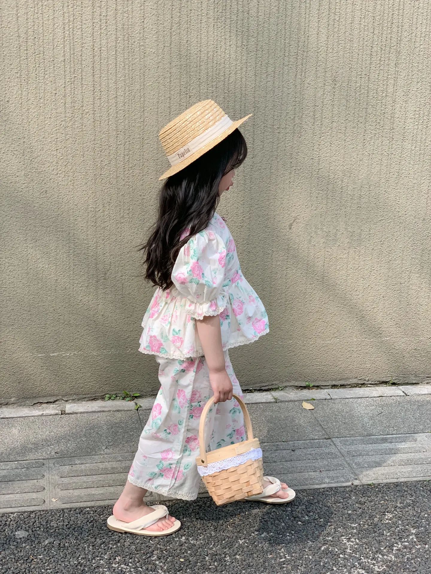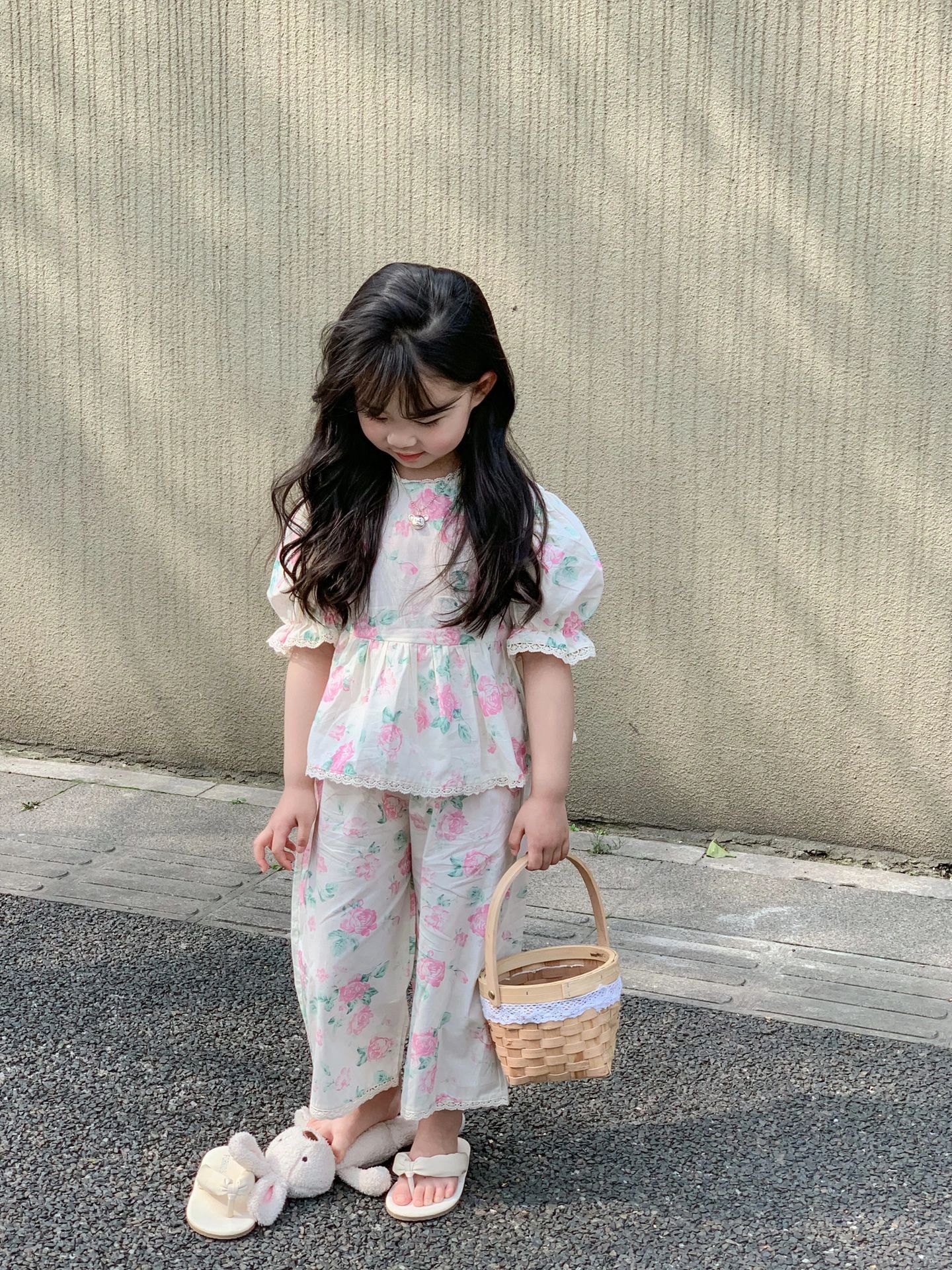여아 여름 풀 프린트 레이스 에지 레이스업 웨이스트 버블 반팔 공주 인형 셔츠 + 루즈한 와이드 팬츠스토어 가기