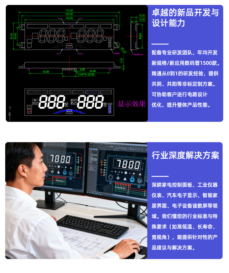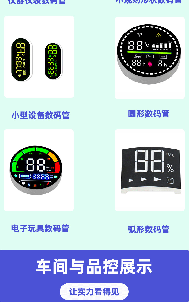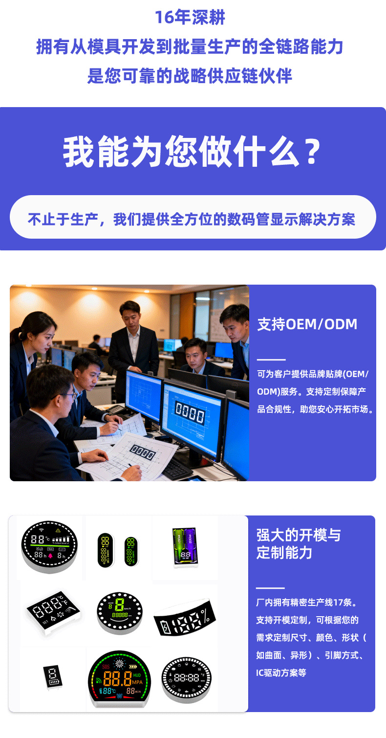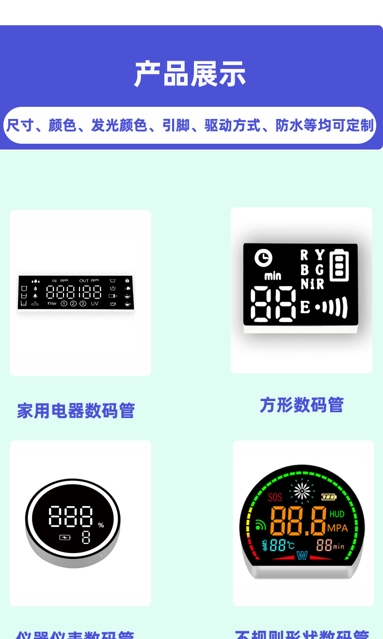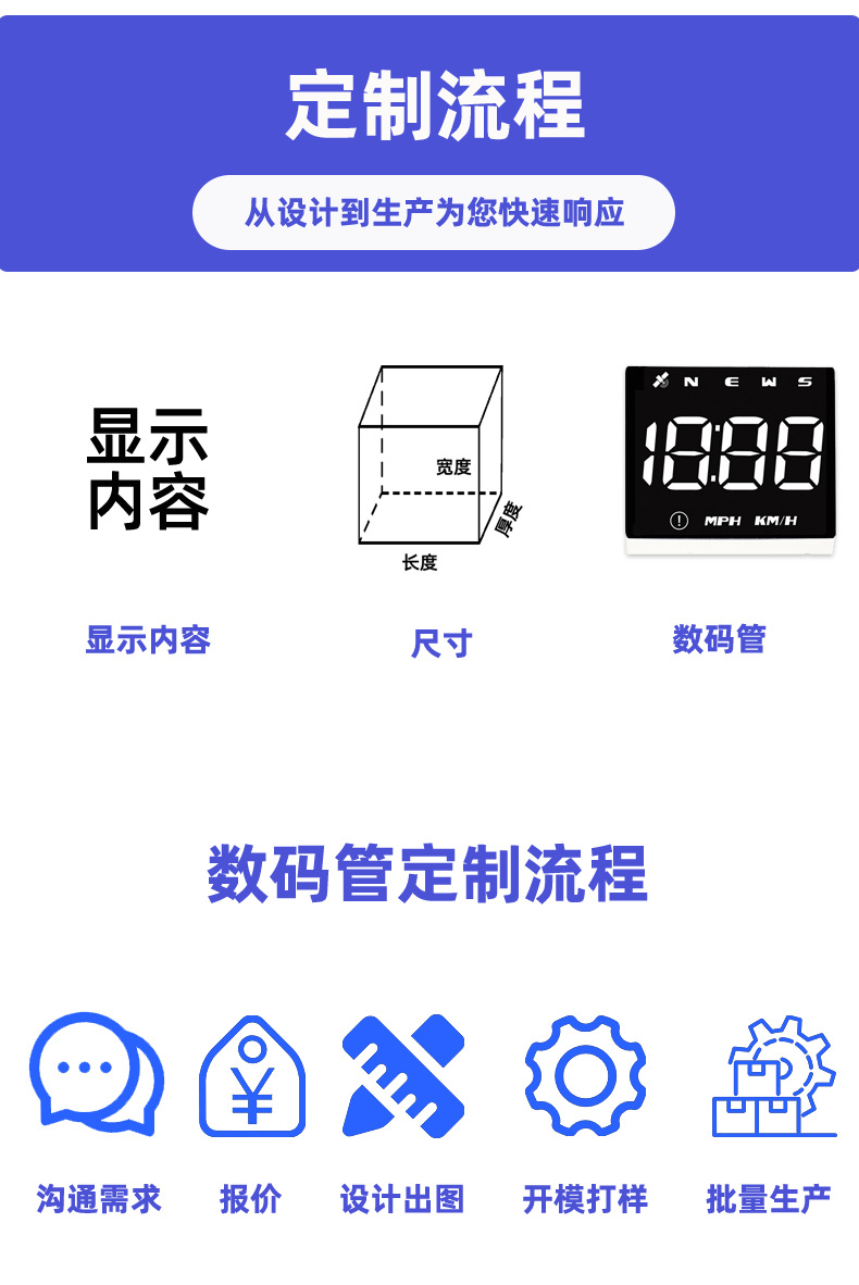 数码管为定制品,需开模定制,显示内容和尺寸都可以任意定制,批货单价需要根据所提供的尺寸和显示内容来计算,本链接展示的规格和价