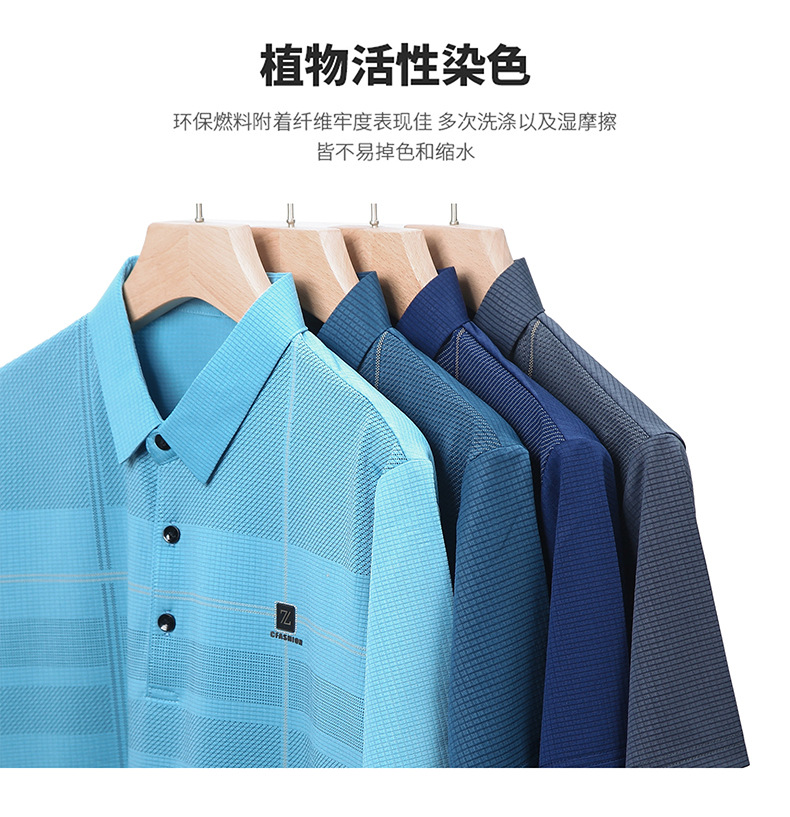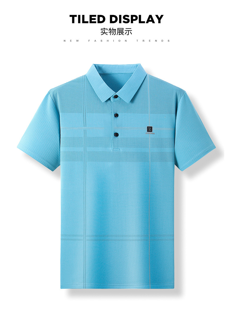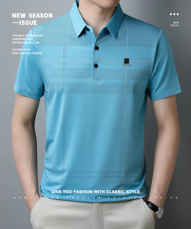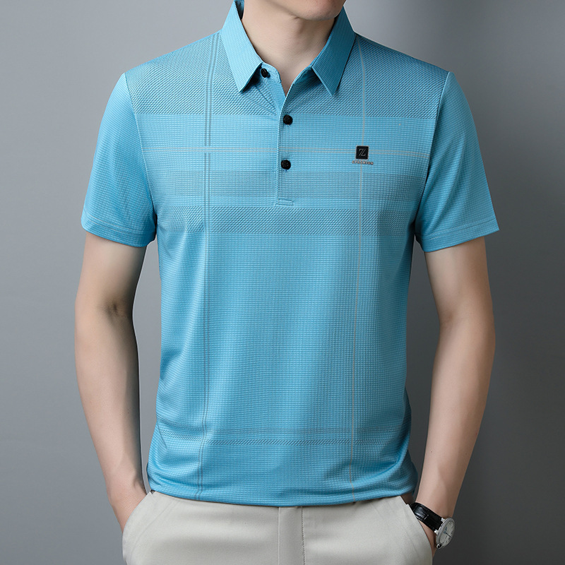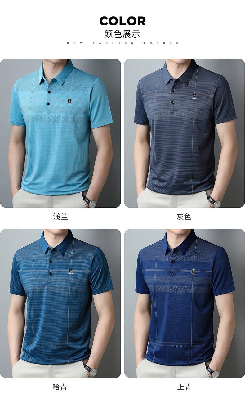2023 새로운 여름 남성용 아이스 실크 폴로 셔츠 중년 비즈니스 캐주얼 패션 트렌디 남성용 스트라이프 티셔츠