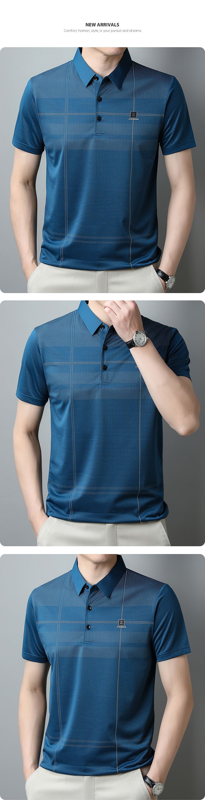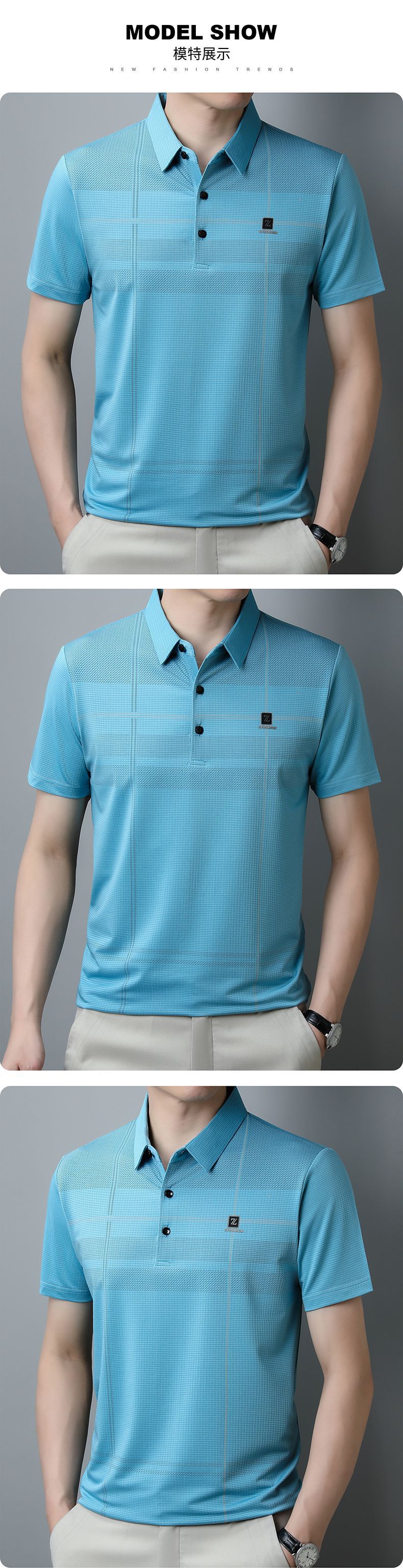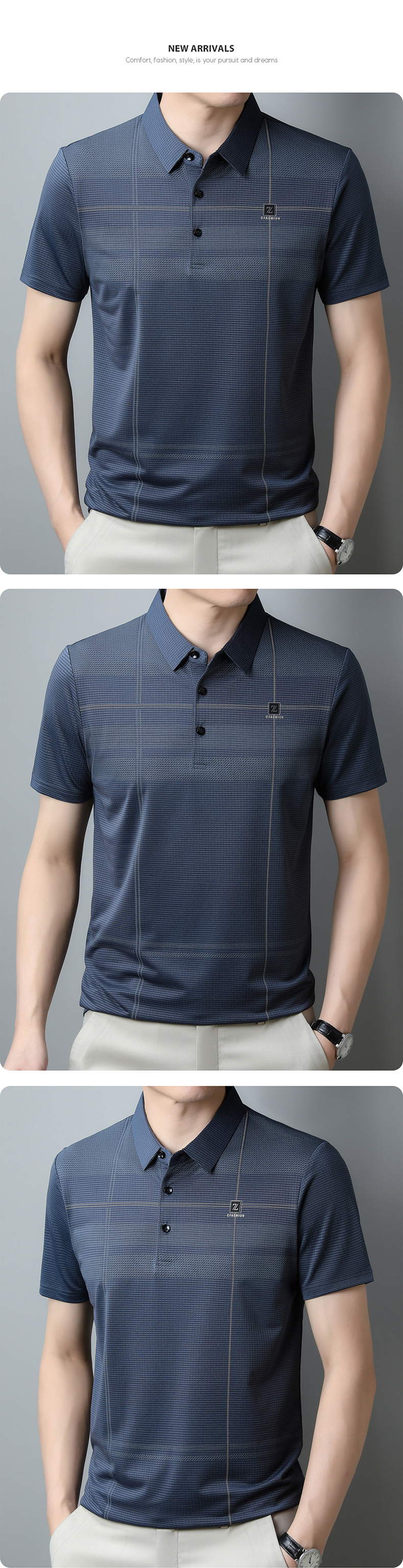2023 새로운 여름 남성용 아이스 실크 폴로 셔츠 중년 비즈니스 캐주얼 패션 트렌디 남성용 스트라이프 티셔츠스토어 가기