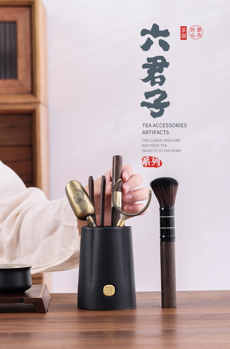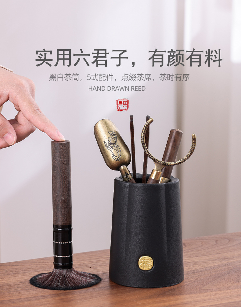 검은 도자기 다도 여섯 신사 세트 황동 흑단 쿵푸 차 세트 다도 예술 액세서리 차 홀더 차 숟가락 차 칼