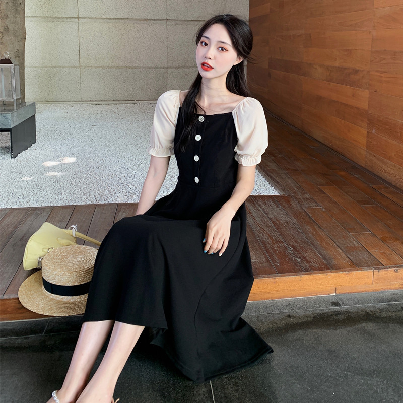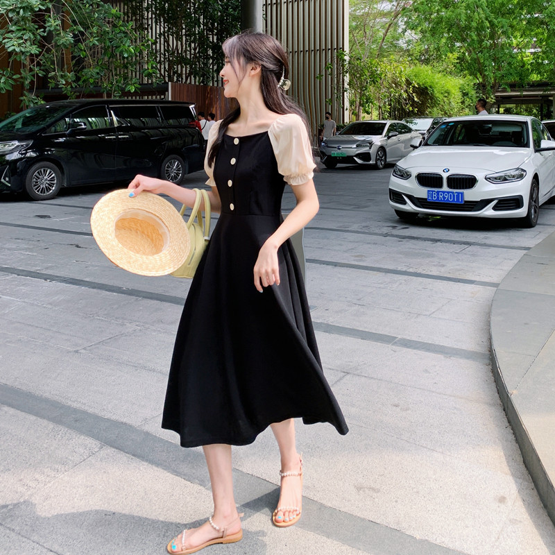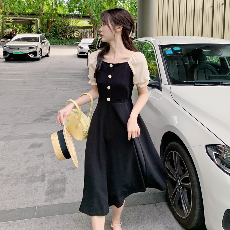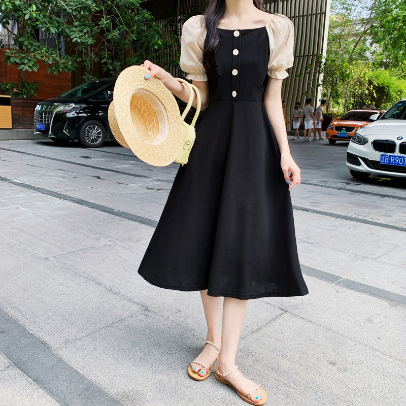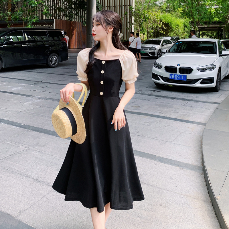 프랑스 복고풍 햅번 스타일 작은 블랙 원피스 긴 원피스 꽉 허리 슬리밍 우아한 작은 원피스 Platycodon Grandiflorum 차 휴식 원피스 여자의 여름스토어 가기