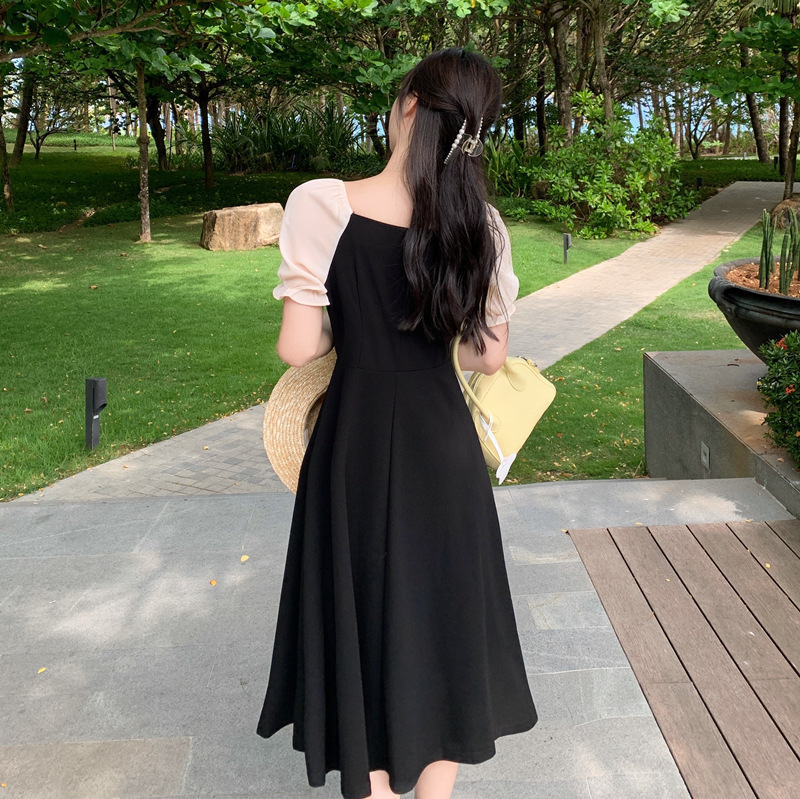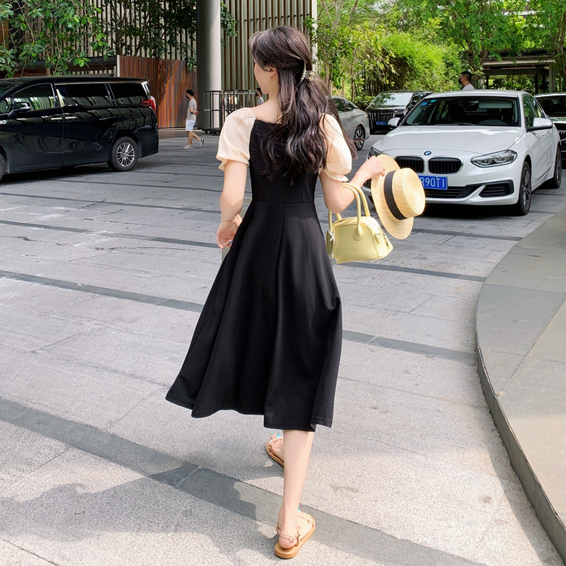 프랑스 복고풍 햅번 스타일 작은 블랙 원피스 긴 원피스 꽉 허리 슬리밍 우아한 작은 원피스 Platycodon Grandiflorum 차 휴식 원피스 여자의 여름