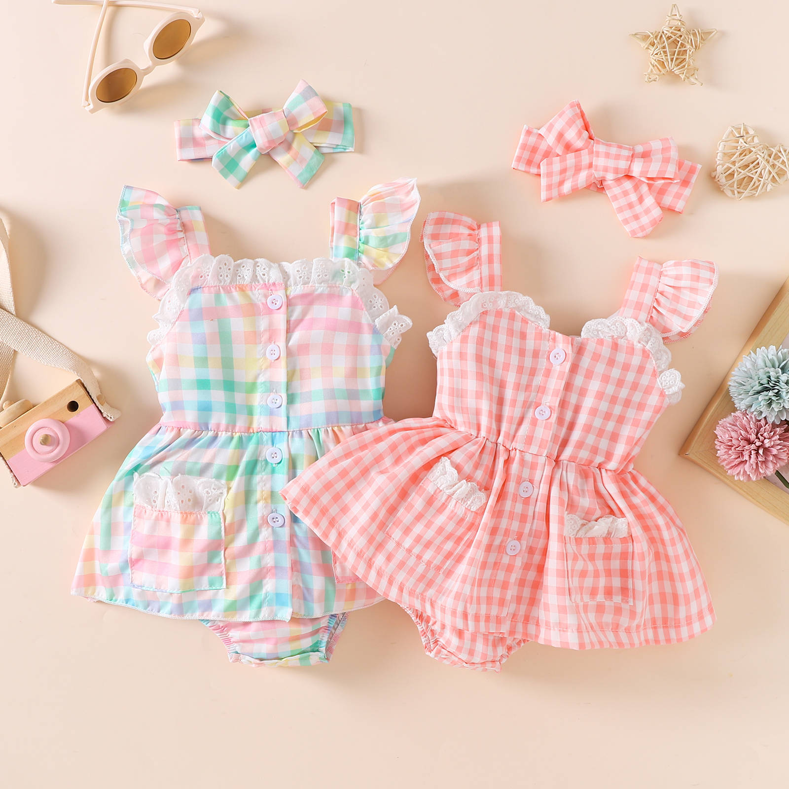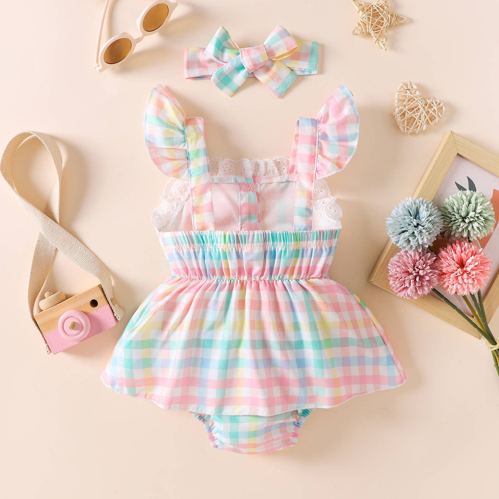 Baopin 아동복 한국식 아기와 유아의 귀여운 무지개 격자 무늬 스트랩 플라잉 슬리브 레이스 스커트 아기 소녀 삼각형 학원스토어 가기