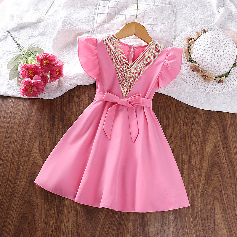 아마존 유럽과 미국의 소녀 원피스 2024 여름 새로운 비행 슬리브 레이스 V-Neck 공주 원피스 국경 아동복스토어 가기