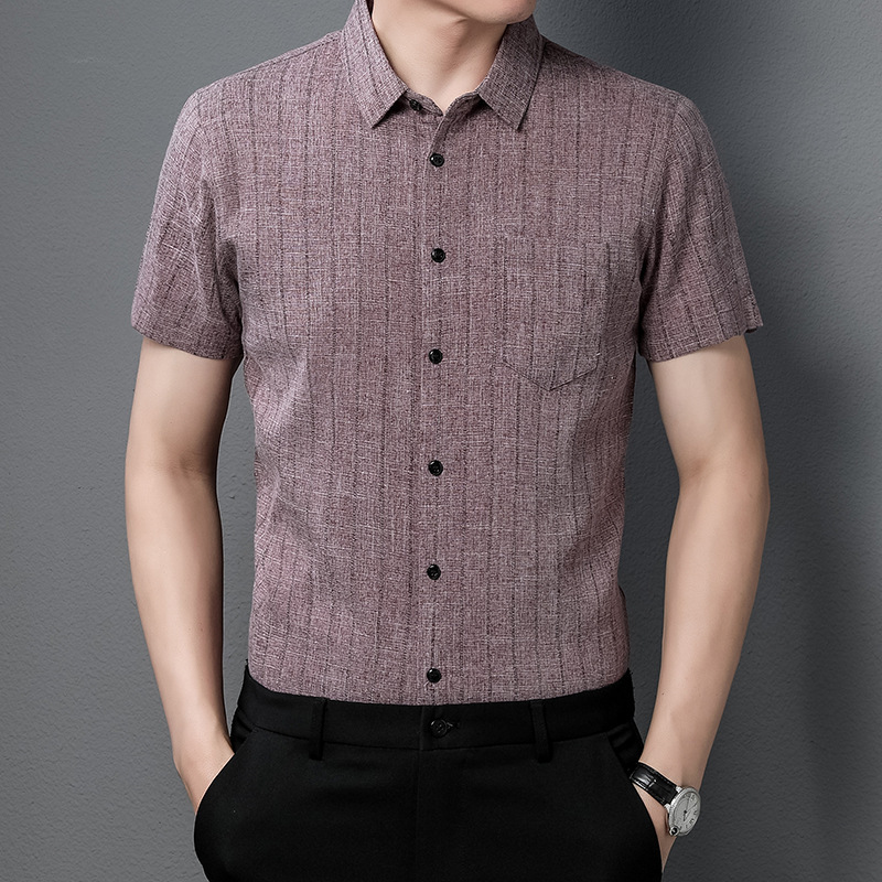 남자 여름 반팔 중년 여름 린넨 얇은 캐주얼 면 단색 녹색 라펠 핏 셔츠스토어 가기