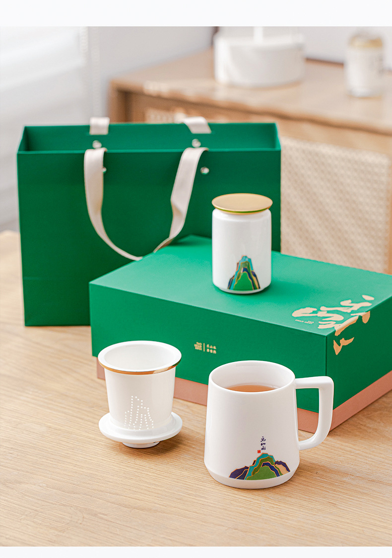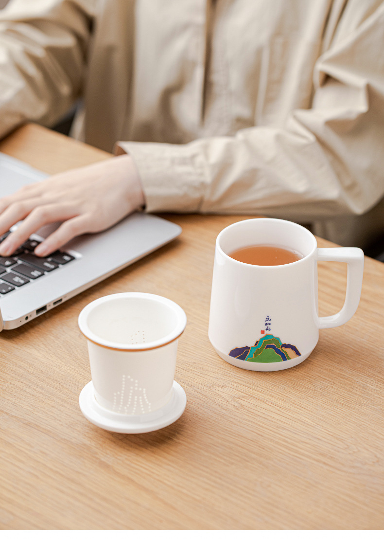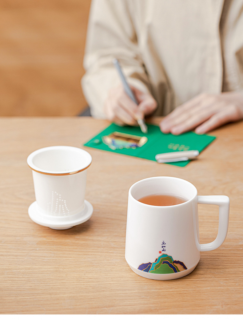 데화아 화이트 도자기 천 마일 장산 찻잔 뚜껑 필터 차 동반 선물 사무실 컵 세라믹 물 컵 세트 로고