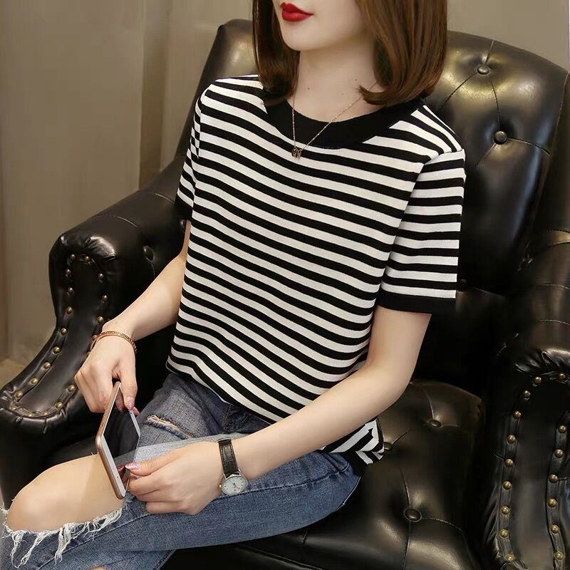 Ge의 새로운 2024 봄 여름 라운드 넥 느슨한 스트라이프 아이스 실크 스웨터와 반팔 티셔츠 여성 클래식 탑스토어 가기