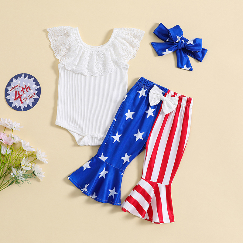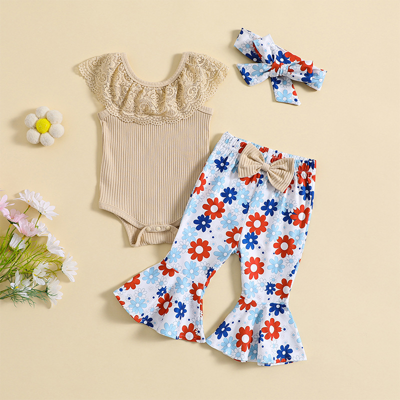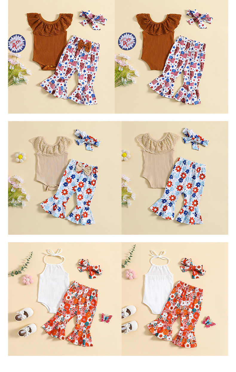 대외 무역 아동 의류 도매 2023 새로운 여자 여름 가방 방귀 의류 아기 로터스 칼라 플레어 바지 여자 세트