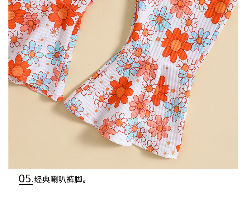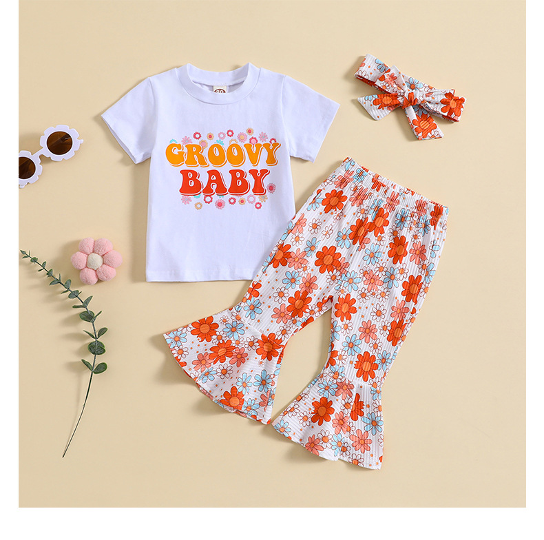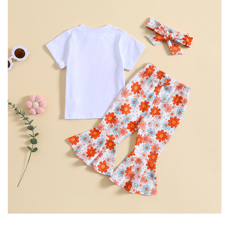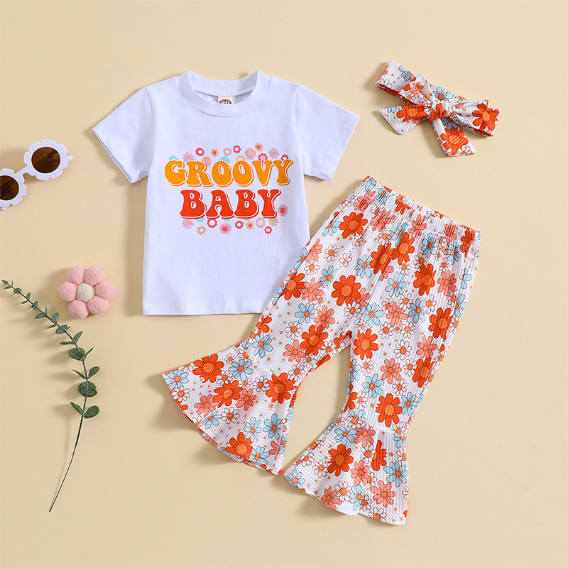 아동 의류 기본 소스 2023 새로운 반팔 인쇄 소녀 여름 아기 3 피스 플레어 팬츠 소녀 세트