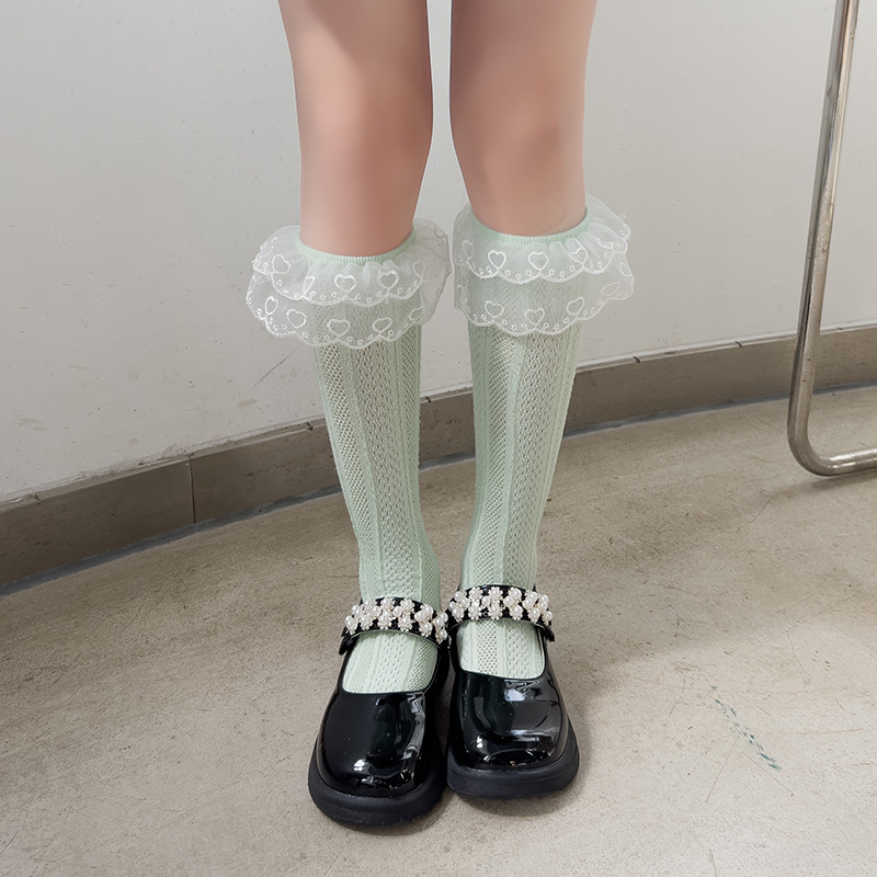 더블 레이스 세로 커프 양말 여자 통기성 메쉬 양말 아기 단색 높은 양말 어린이 양말 봄과 여름