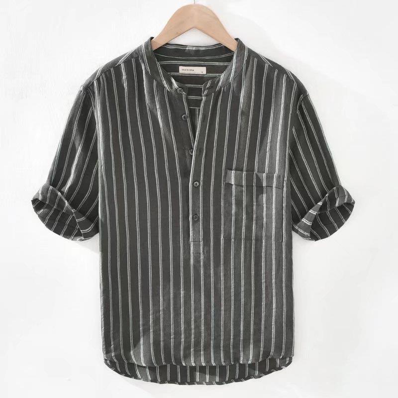 일본 스트라이프 반팔 셔츠 남자의 유행 여름 느슨한 얇은 세로 칼라 반 소매 셔츠 패션 코트 탑