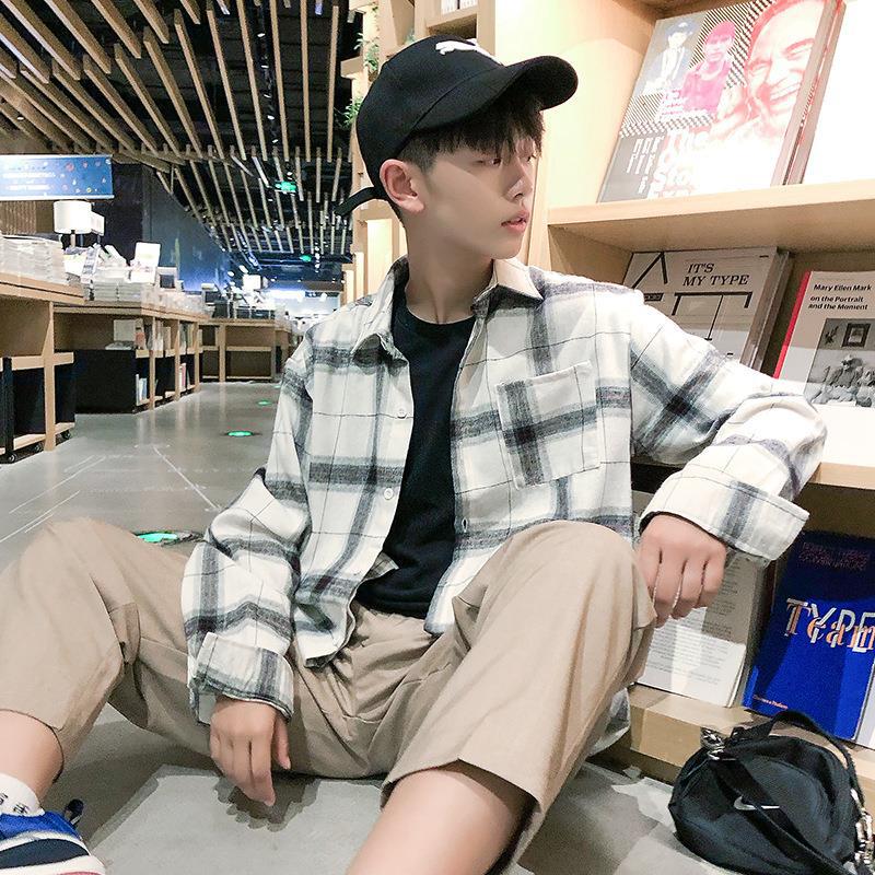 남성 셔츠 긴 소매 세대의 가을 청소년 느슨한 옷깃의 새로운 한국어 버전 격자 무늬 캐주얼 셔츠스토어 가기
