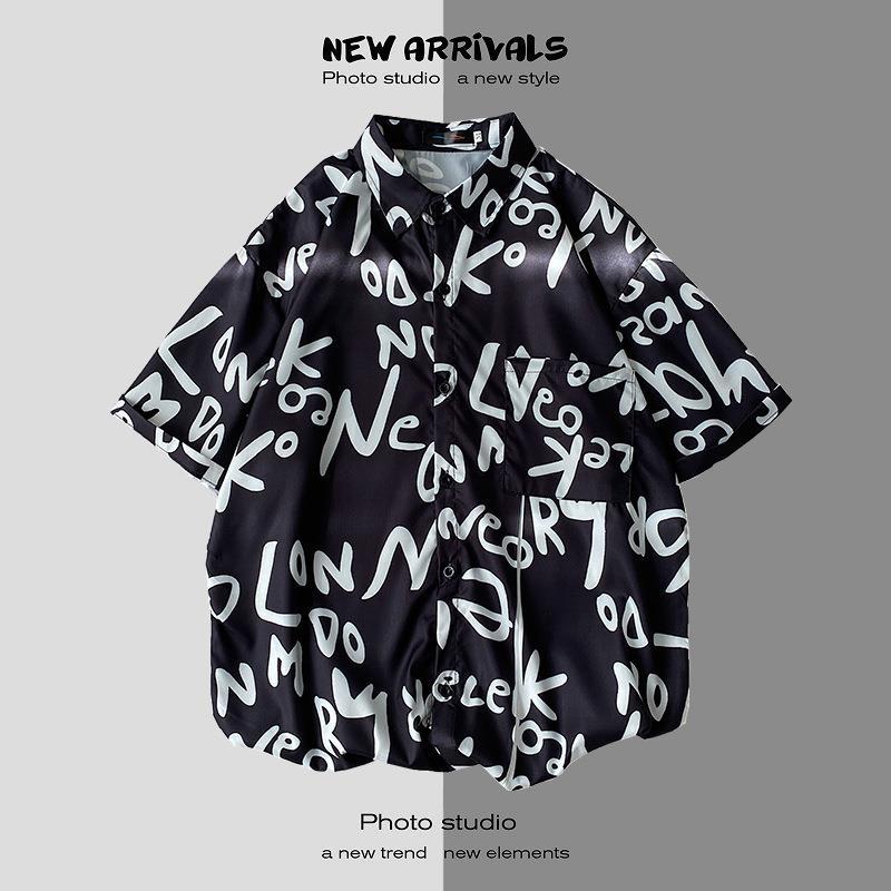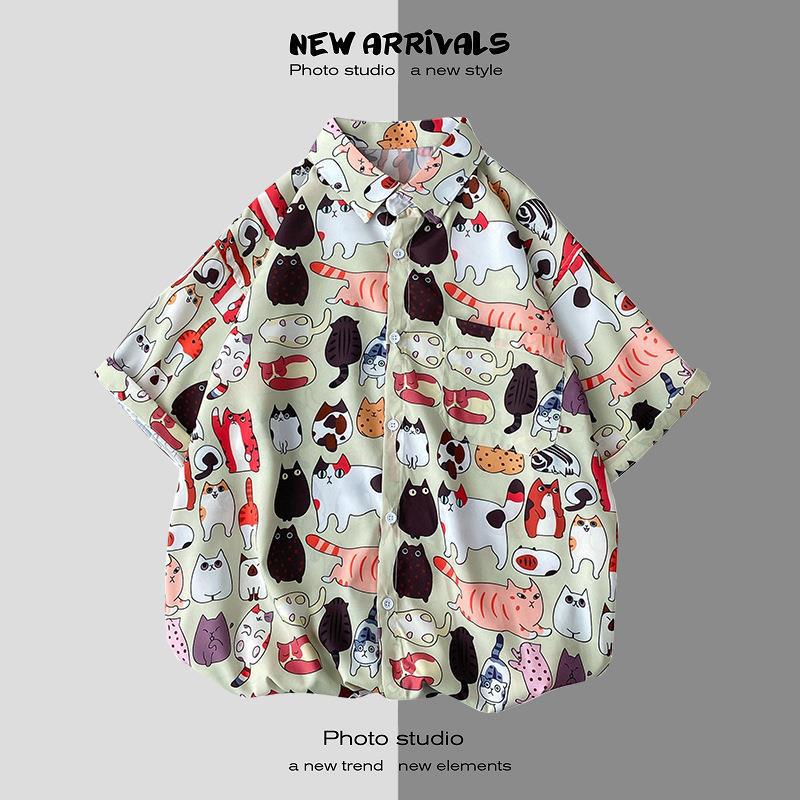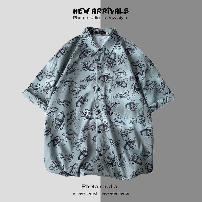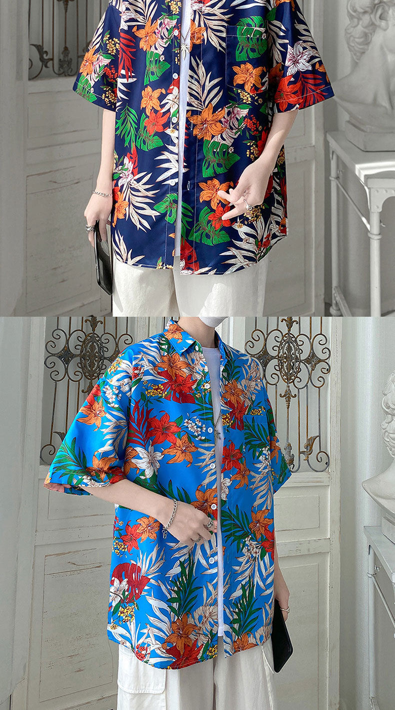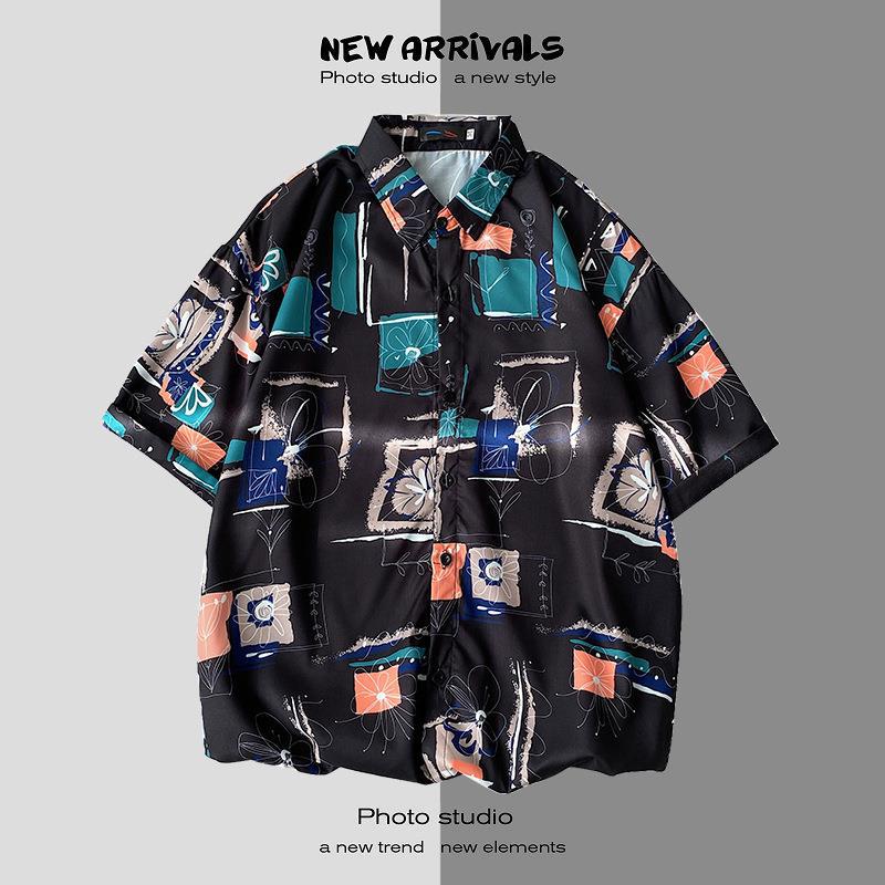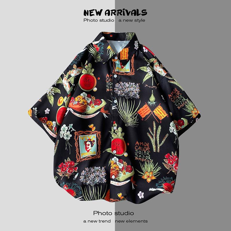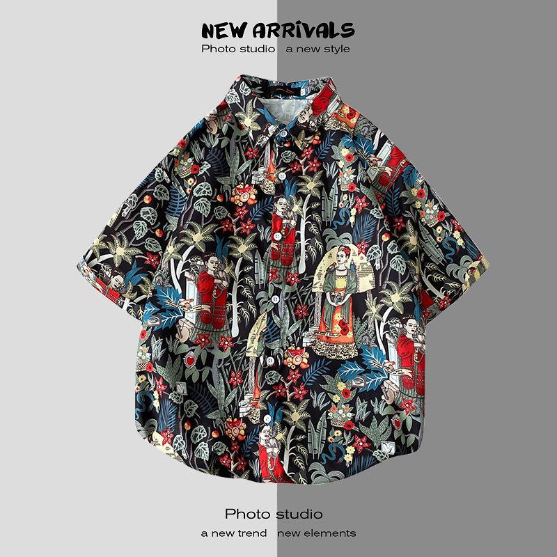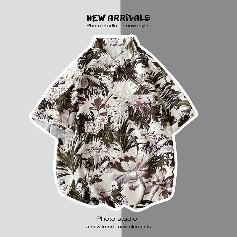 港风vintage碎花衬衫男宽松潮流沙滩夏季慵懒风情侣短袖衬衣外套