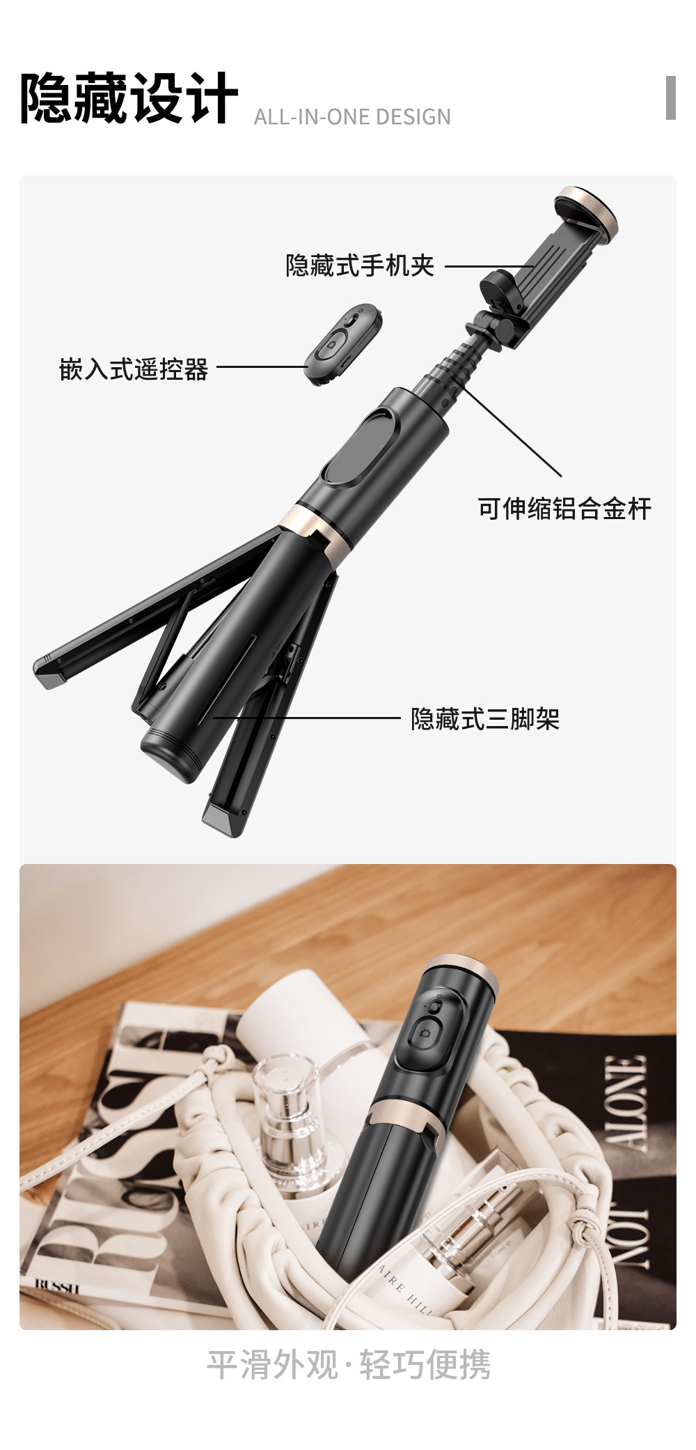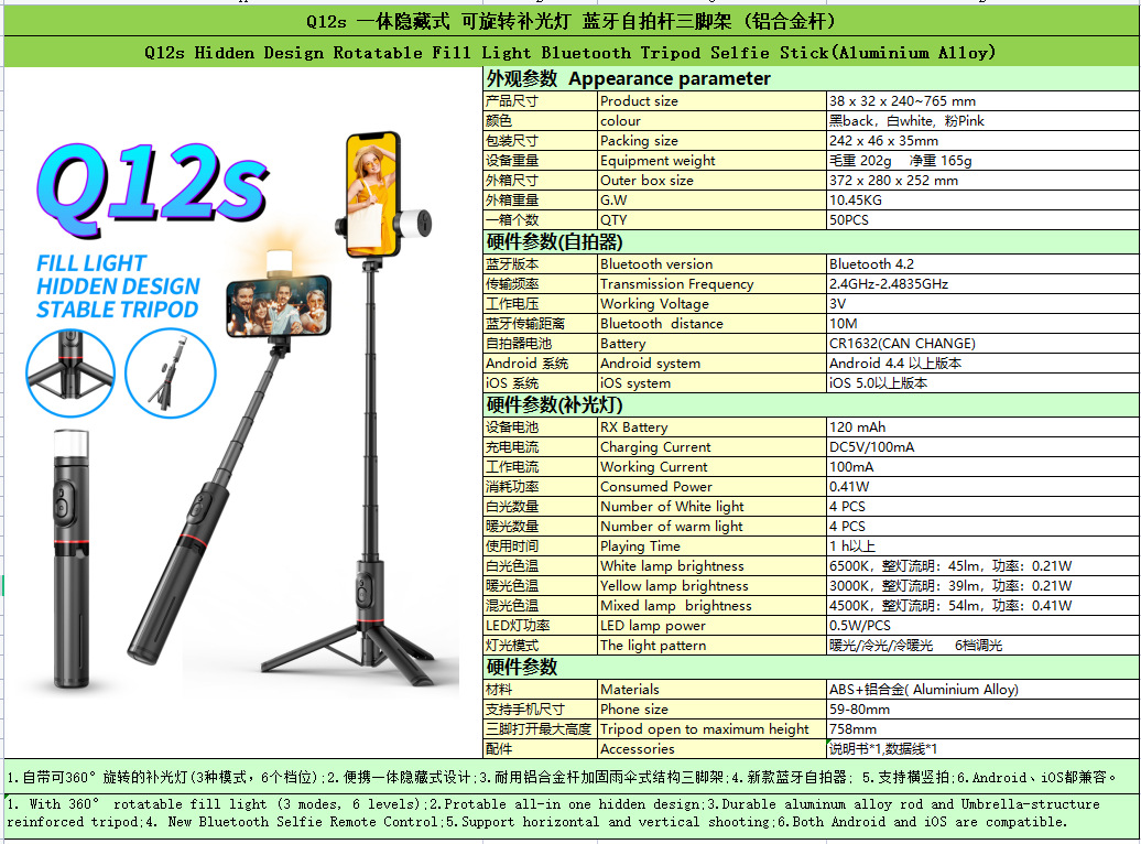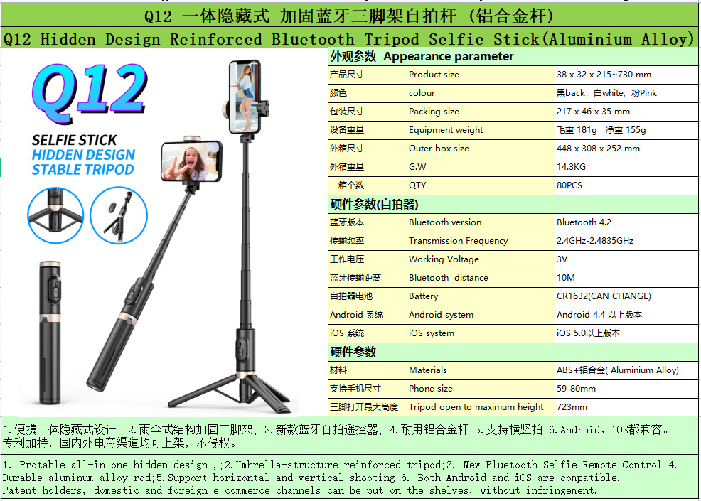 새로운 휴대 전화 블루투스 셀카 스틱 Q12S 가벼운 휴대용 통합 스탠드 원격 사진 데스크탑 삼각대