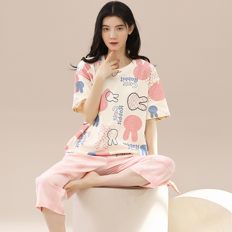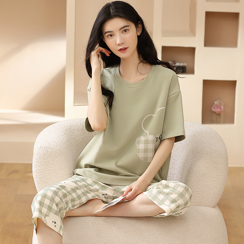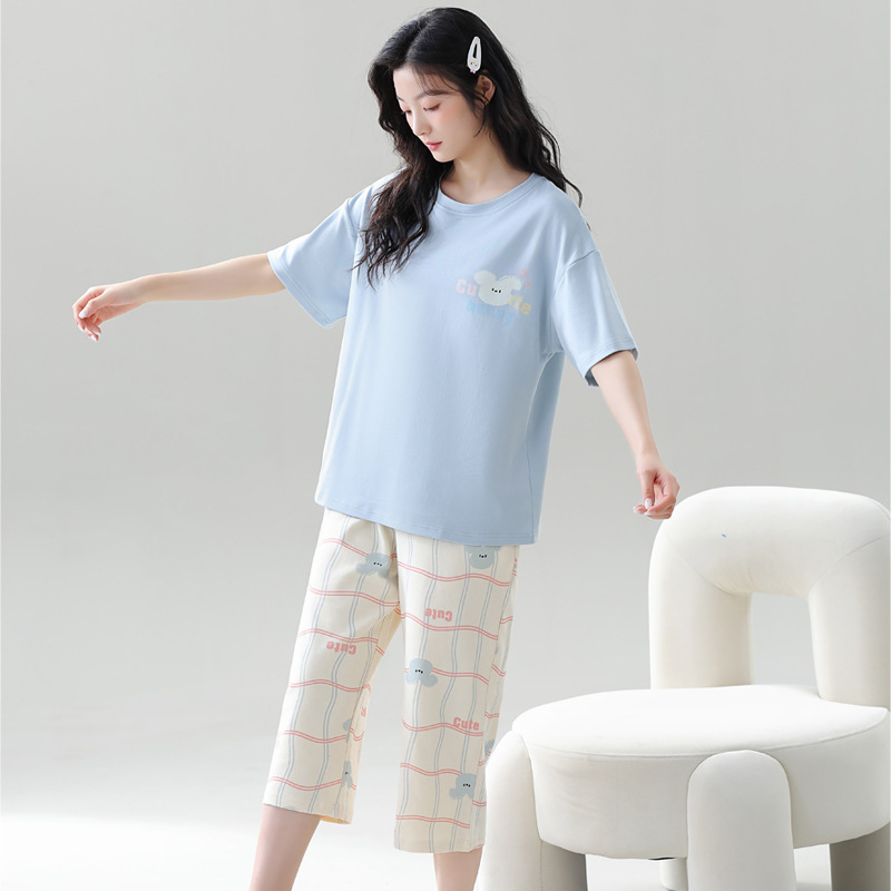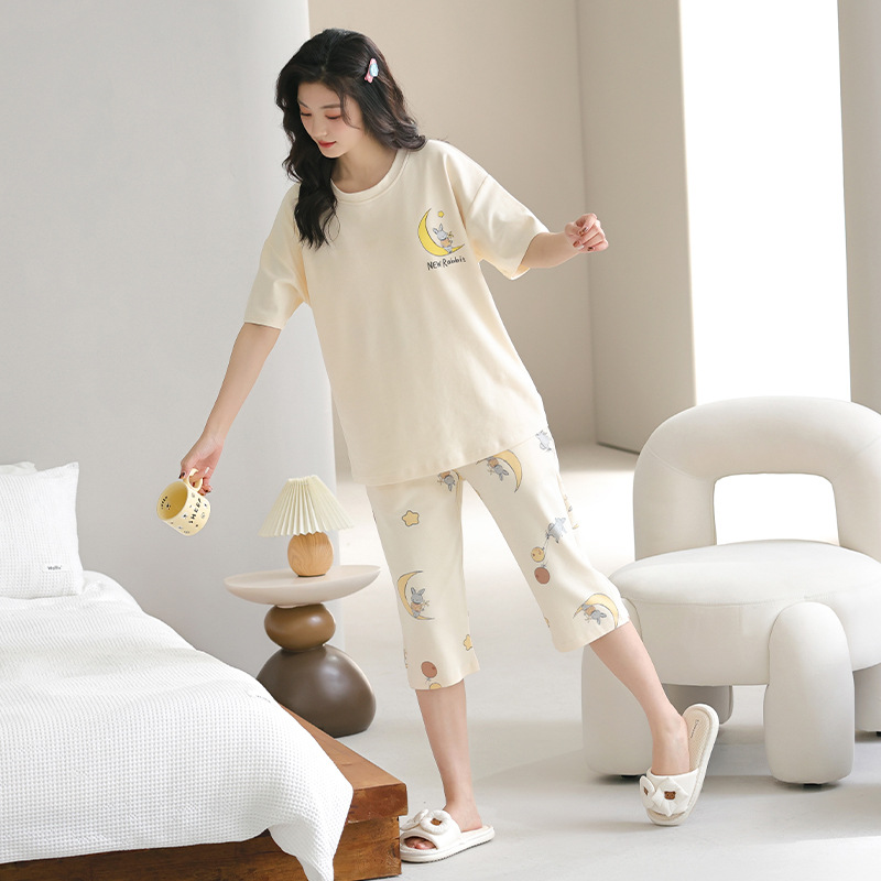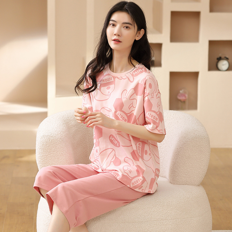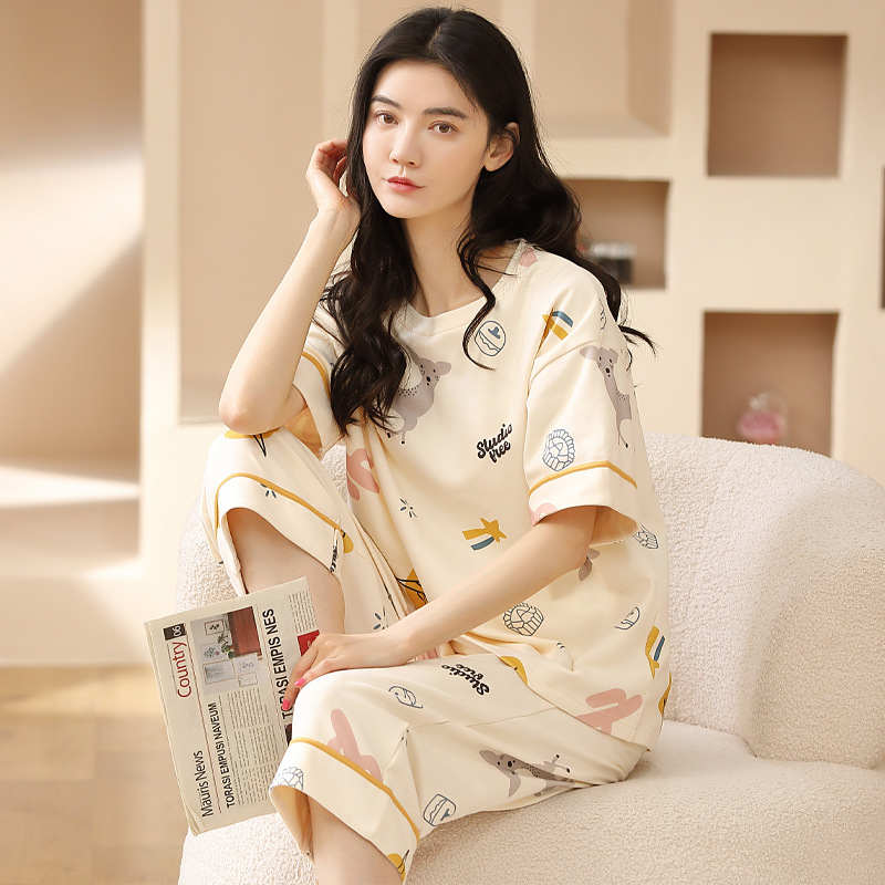 풀오버 반팔 카프리 바지 순수한면 여름 잠옷 여성 세트 봄과 가을 귀여운 만화 캐주얼 의류스토어 가기
