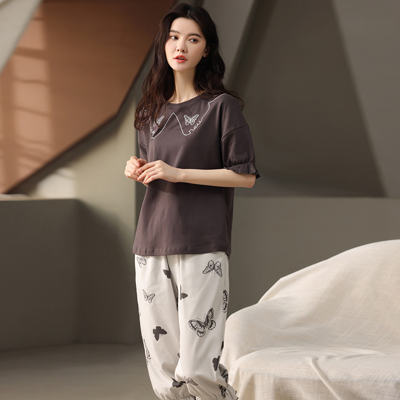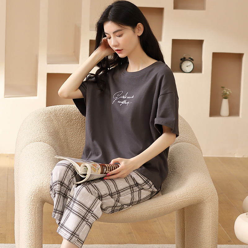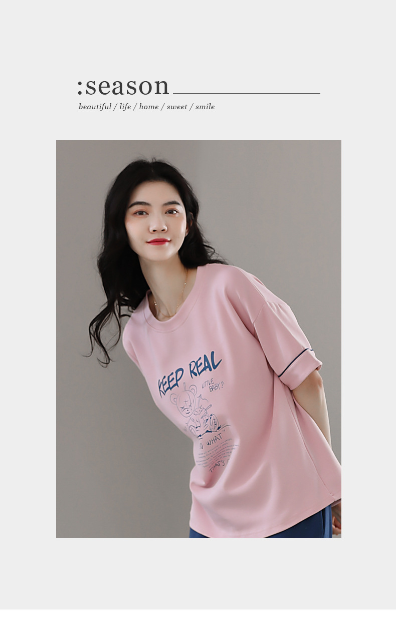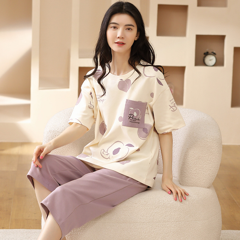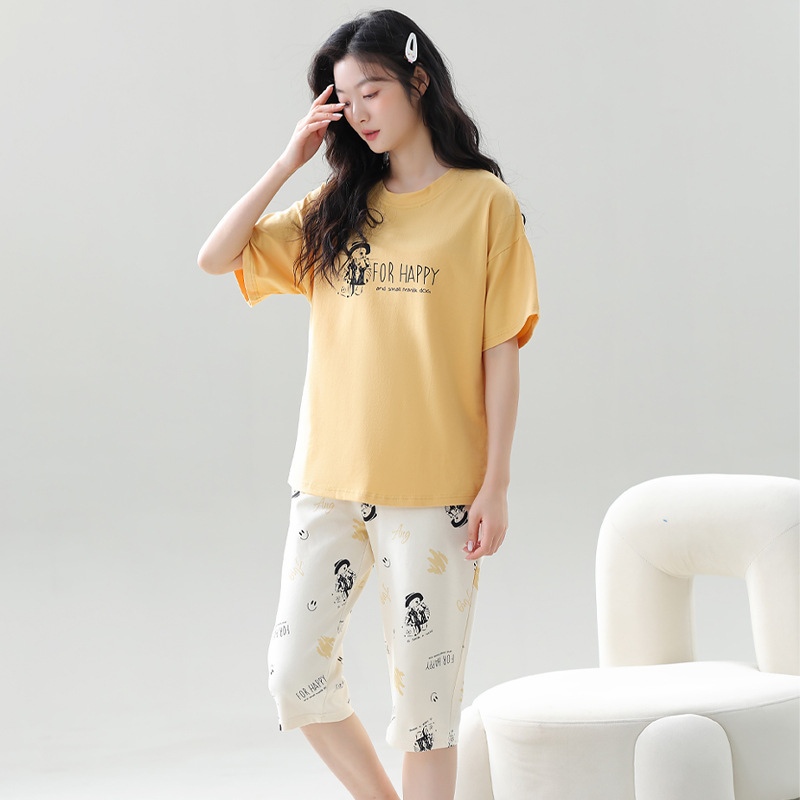 풀오버 반팔 카프리 바지 순수한면 여름 잠옷 여성 세트 봄과 가을 귀여운 만화 캐주얼 의류스토어 가기
