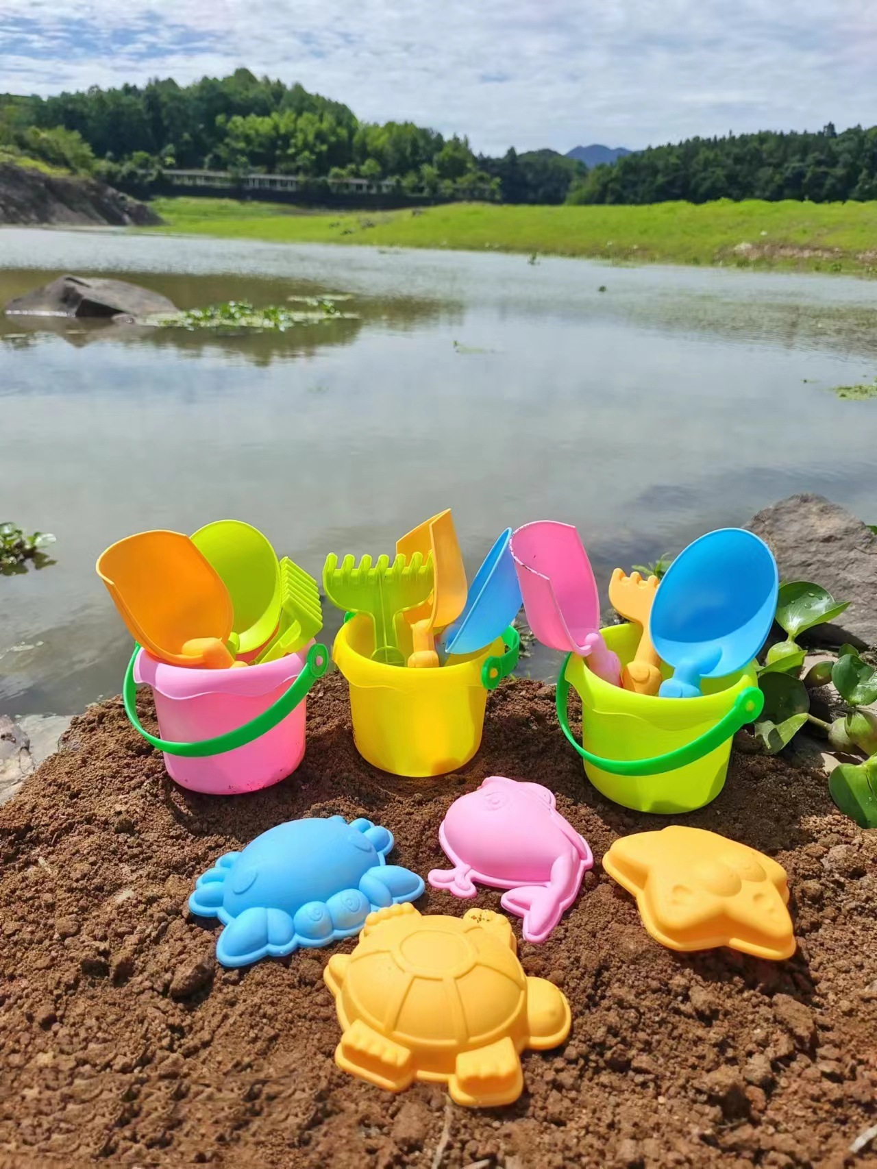 어린이 해변 장난감 세트 작은 양동이 아기 모래 파는 도구 삽 작은 갈퀴 목욕 물 부드러운 접착제