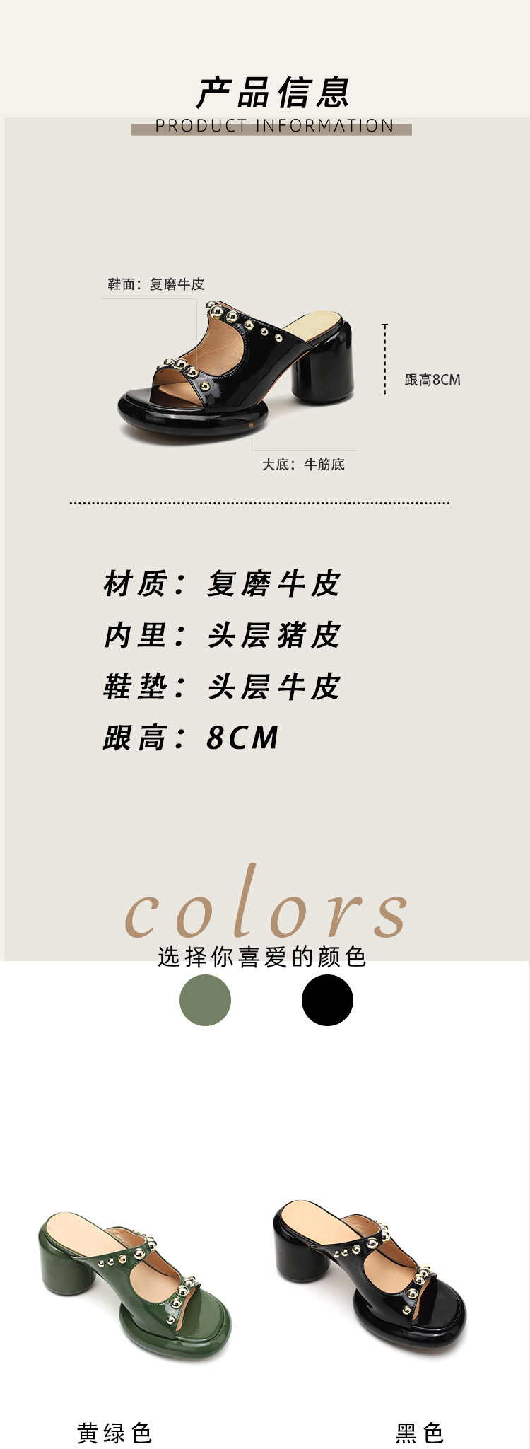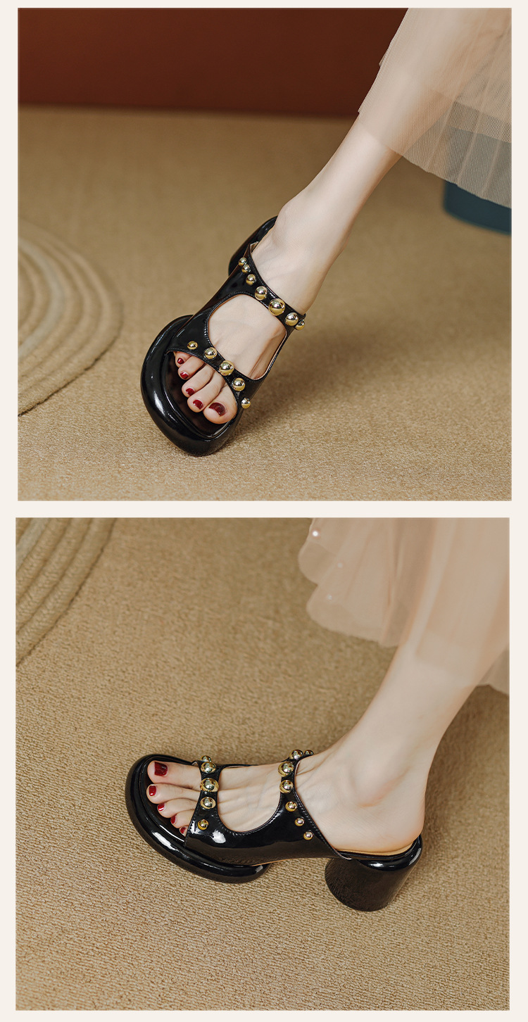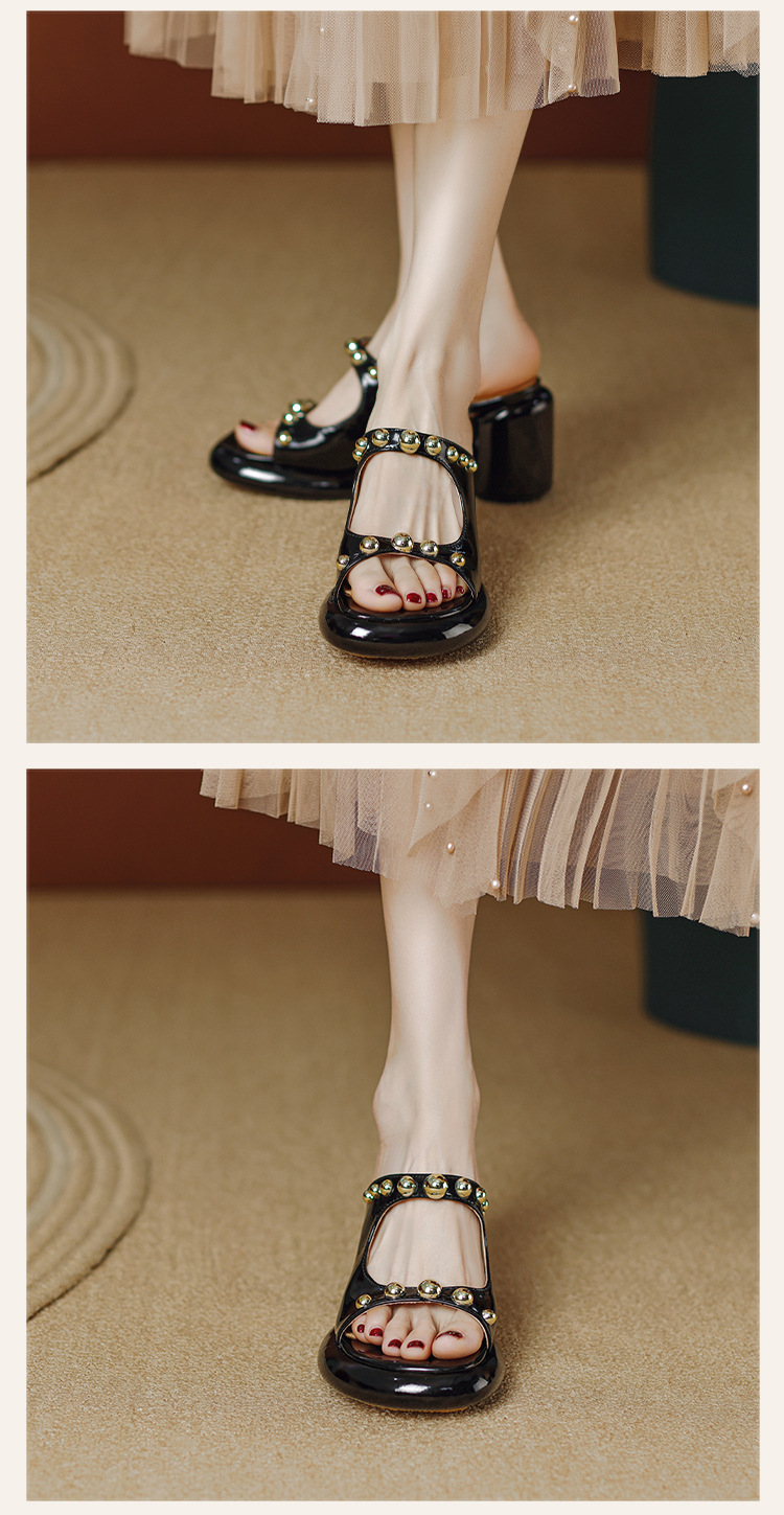 오픈 토 블록 힐 아우터 슬리퍼 여성용 모든 매치 페어리 슬라이드 2023 새로운 여름 리벳 하이힐 패션 샌들