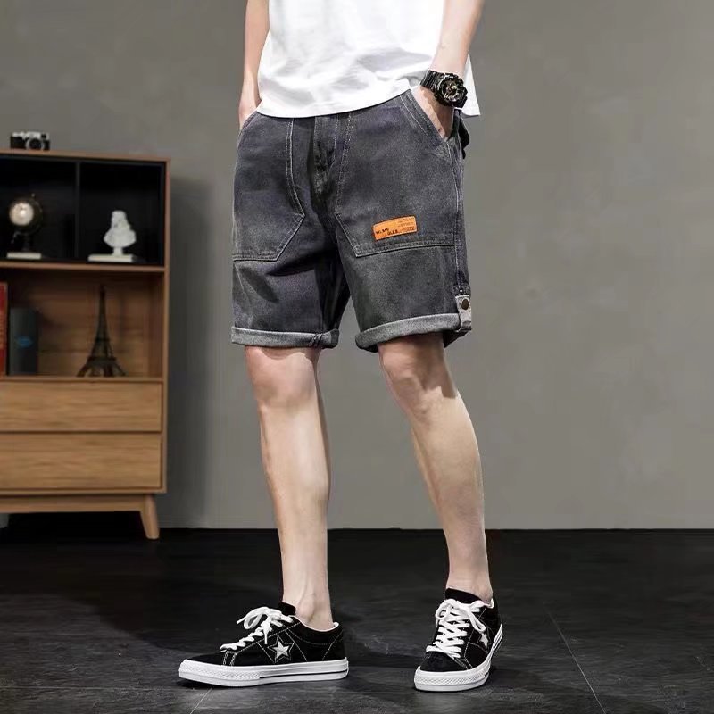 데님 반바지 남성용 트렌디한 루즈한 5 점 바지 캐주얼 플러스 사이즈 스트레치 허리 찢어진 한국식 겉옷 미디엄 팬츠 흐름스토어 가기