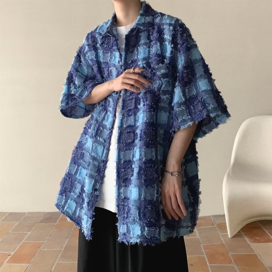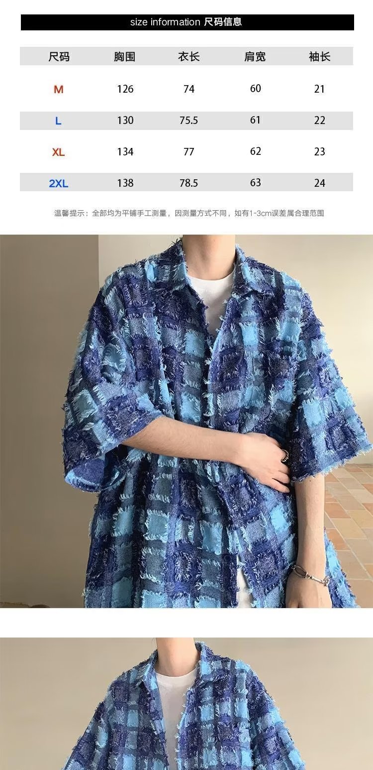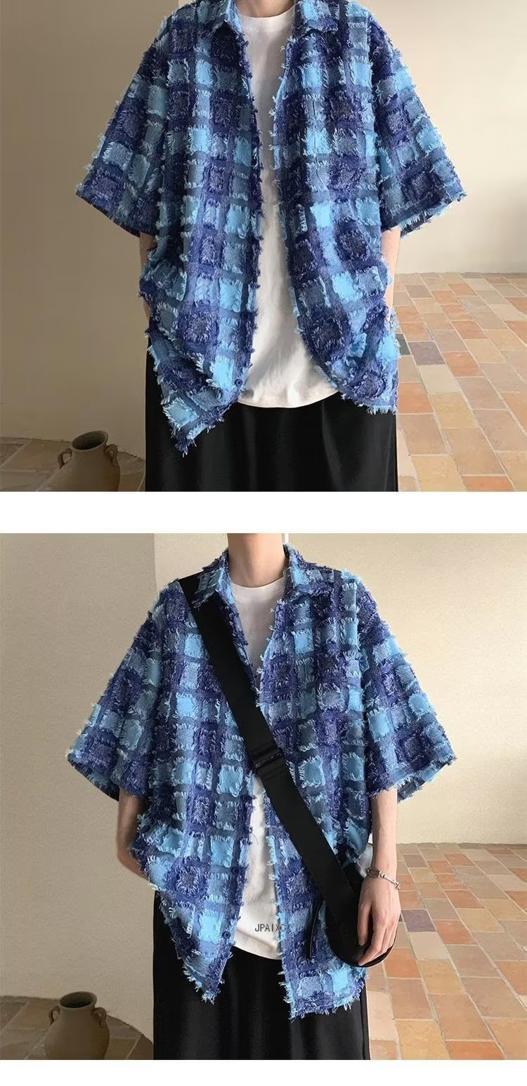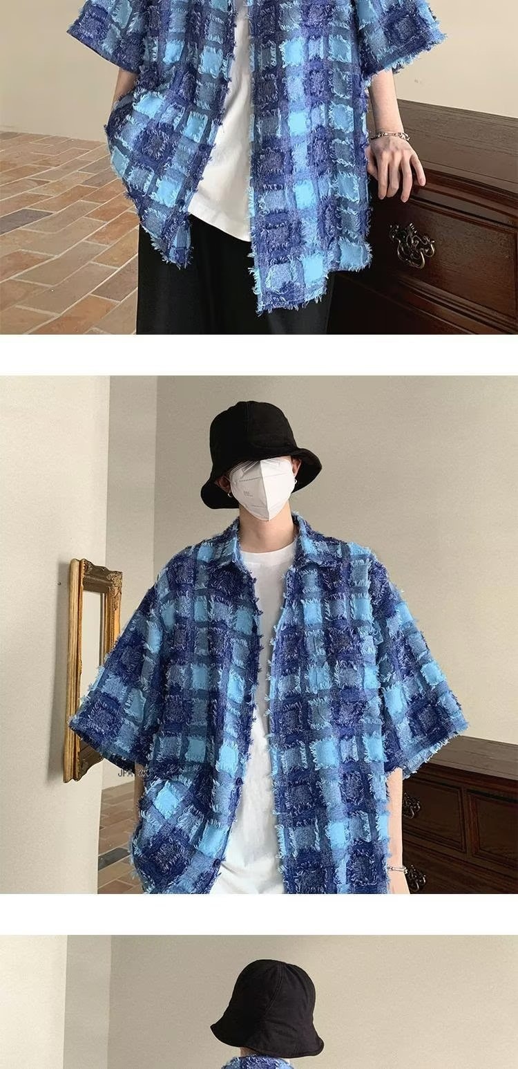 프릴 체크 무늬 컬러 차단 반팔 타이 염색 숄 익스테리어 셔츠 남성용 술 반팔 분위기 스타일 슈페리어 셔츠스토어 가기