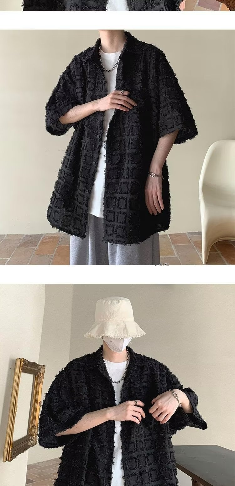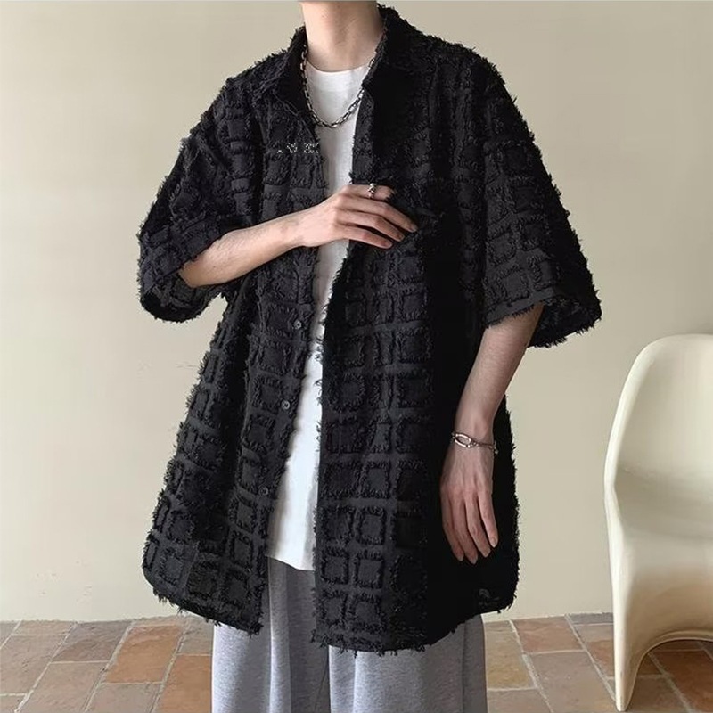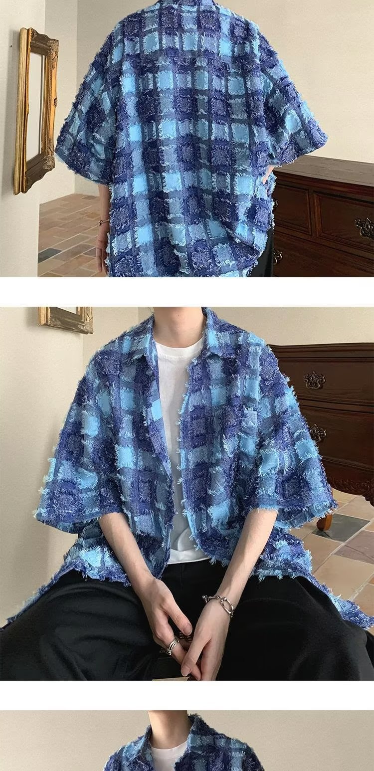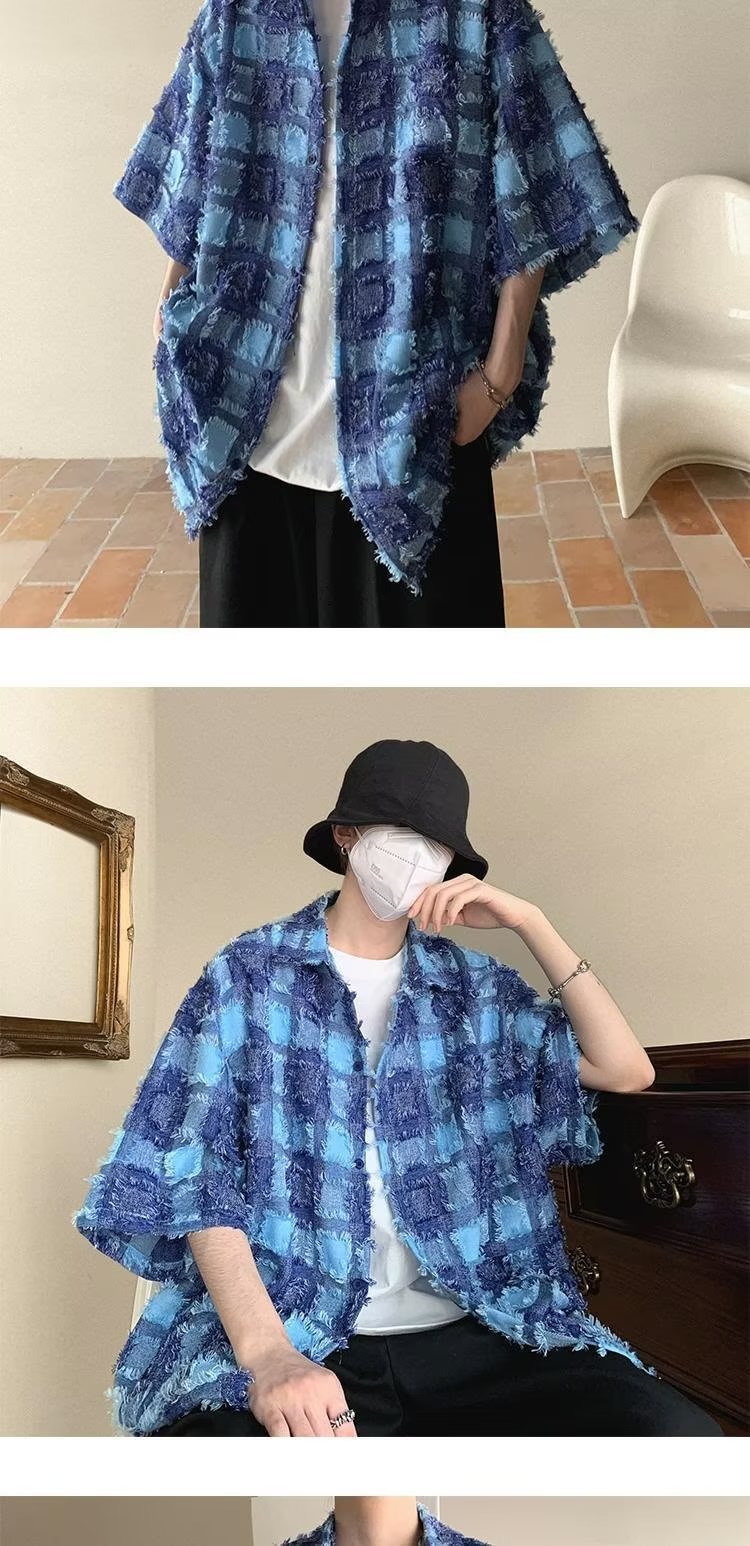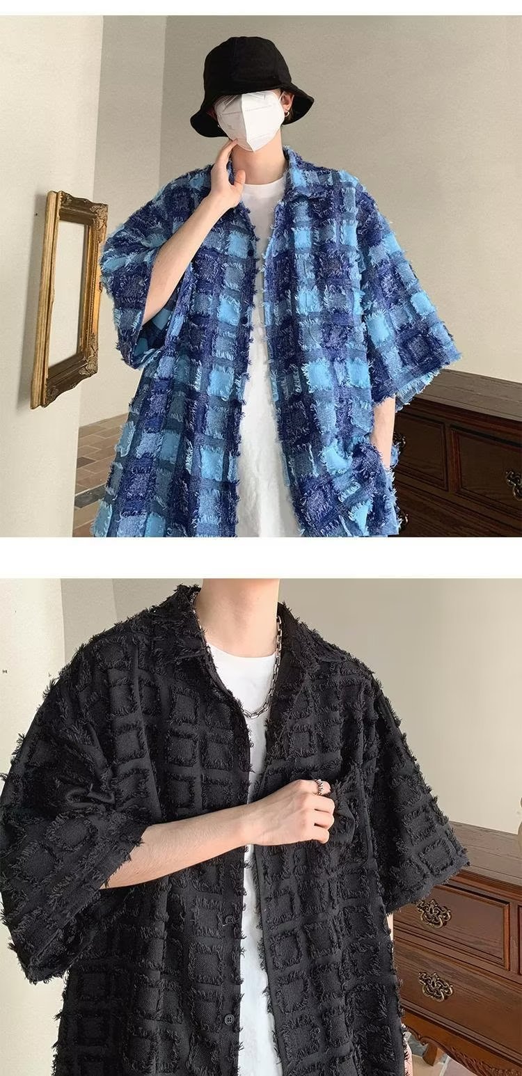 프릴 체크 무늬 컬러 차단 반팔 타이 염색 숄 익스테리어 셔츠 남성용 술 반팔 분위기 스타일 슈페리어 셔츠스토어 가기