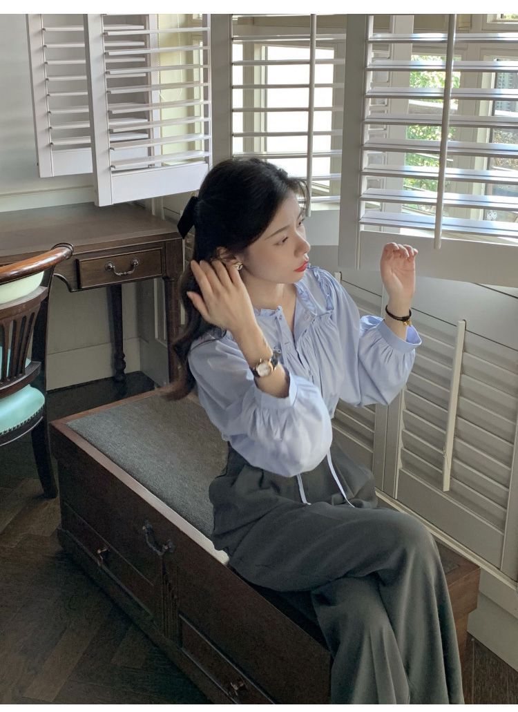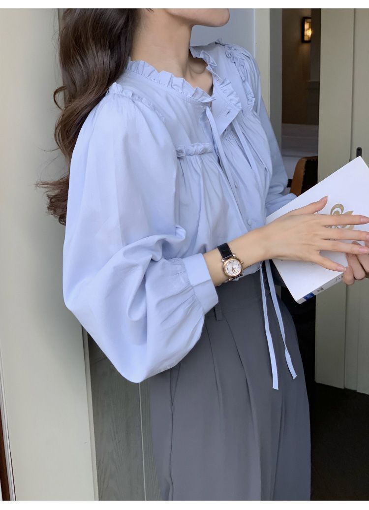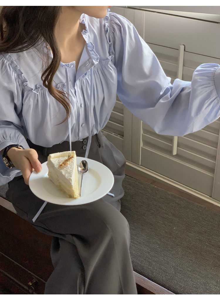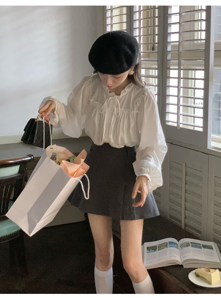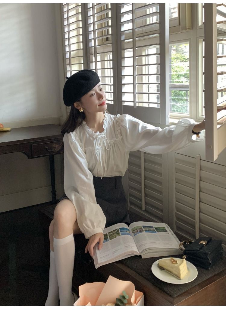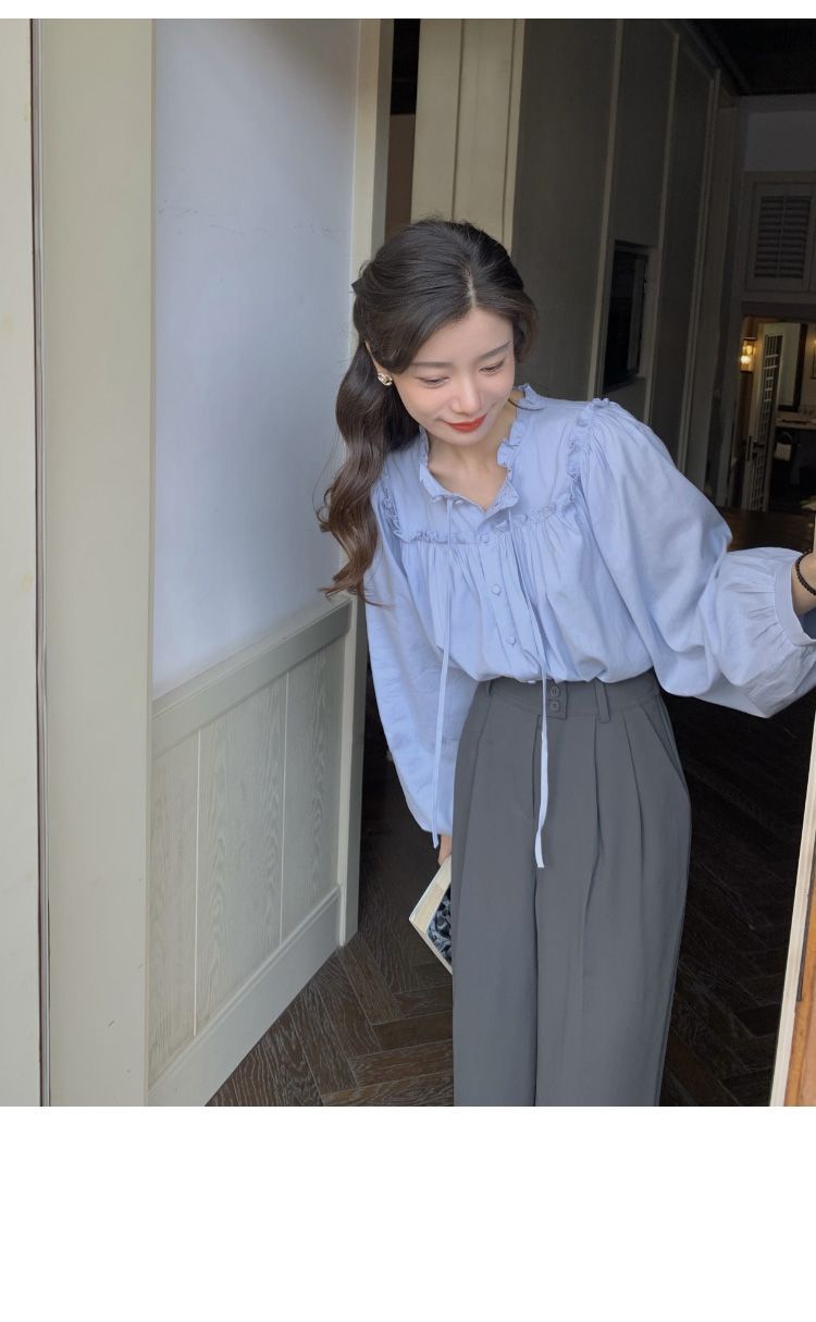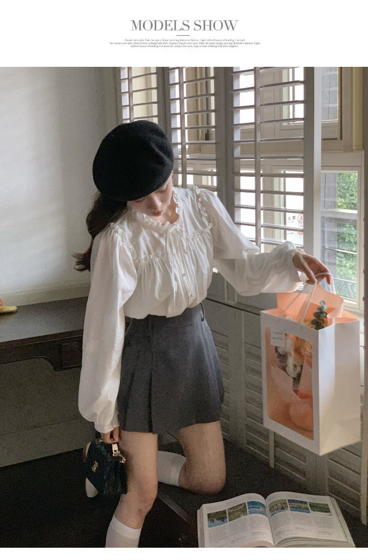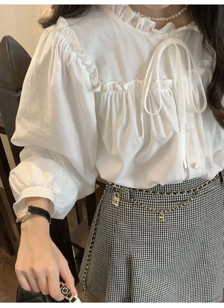 프랑스 긴팔 셔츠 여성 느슨한 2025 봄, 가을 새로운 디자인 레이스 업 탑 복고풍 곰팡이 가장자리 셔츠스토어 가기