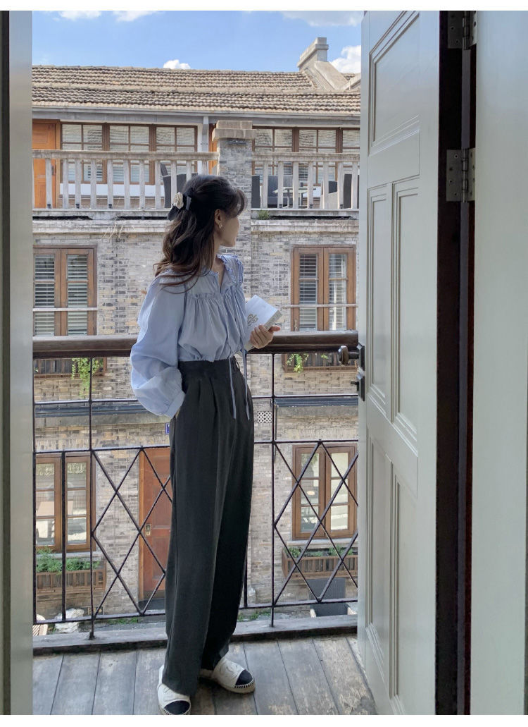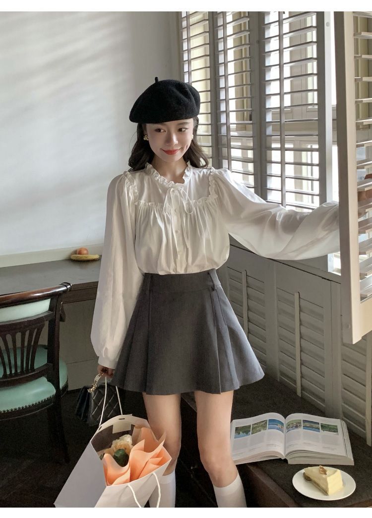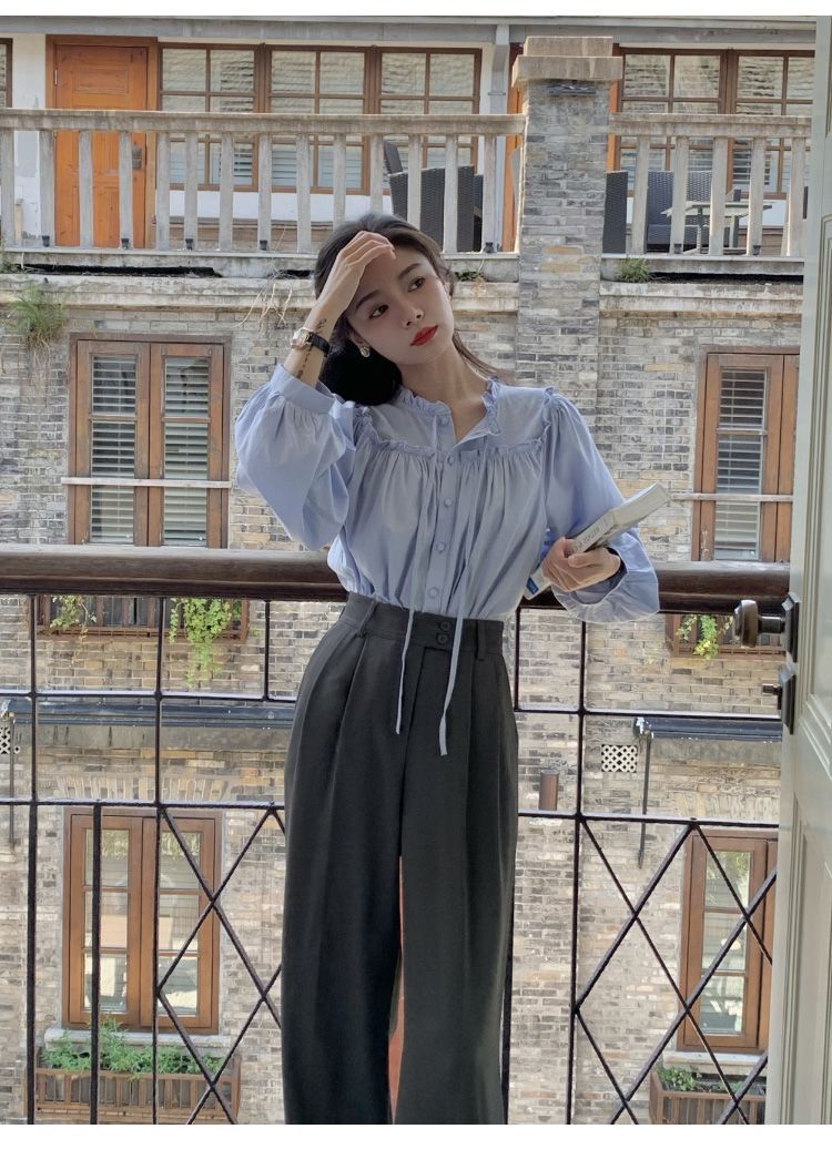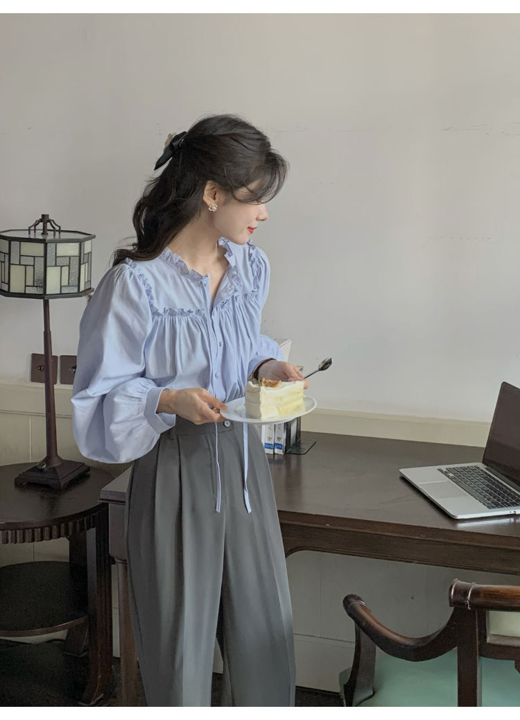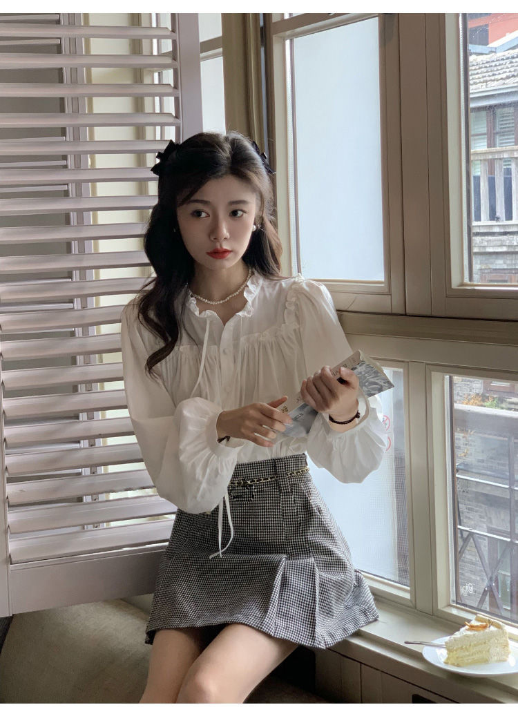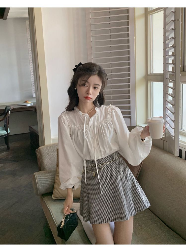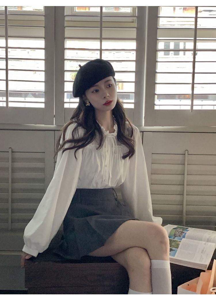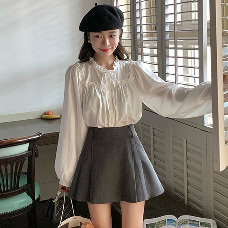 프랑스 긴팔 셔츠 여성 느슨한 2025 봄, 가을 새로운 디자인 레이스 업 탑 복고풍 곰팡이 가장자리 셔츠스토어 가기