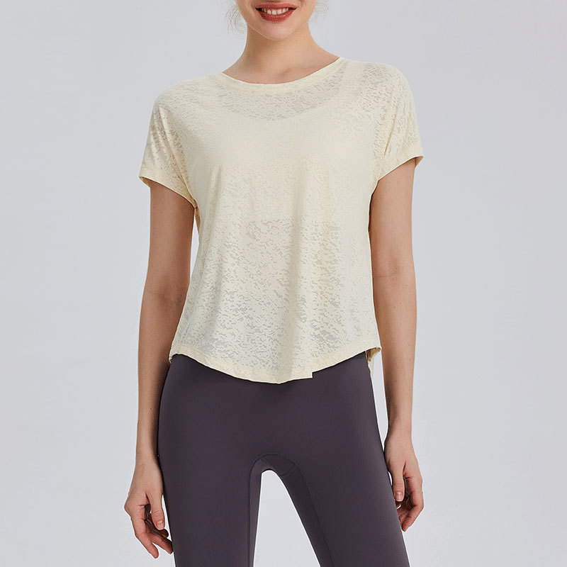 요가 의류 여성용 느슨한 스포츠 반팔 경량 통기성 블라우스 여름 아름다운 백 탑 스플릿 자카드 피트니스 티셔츠