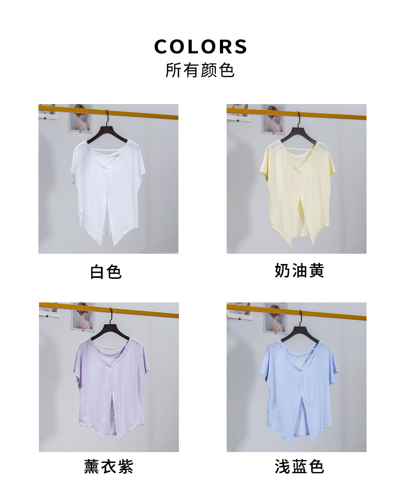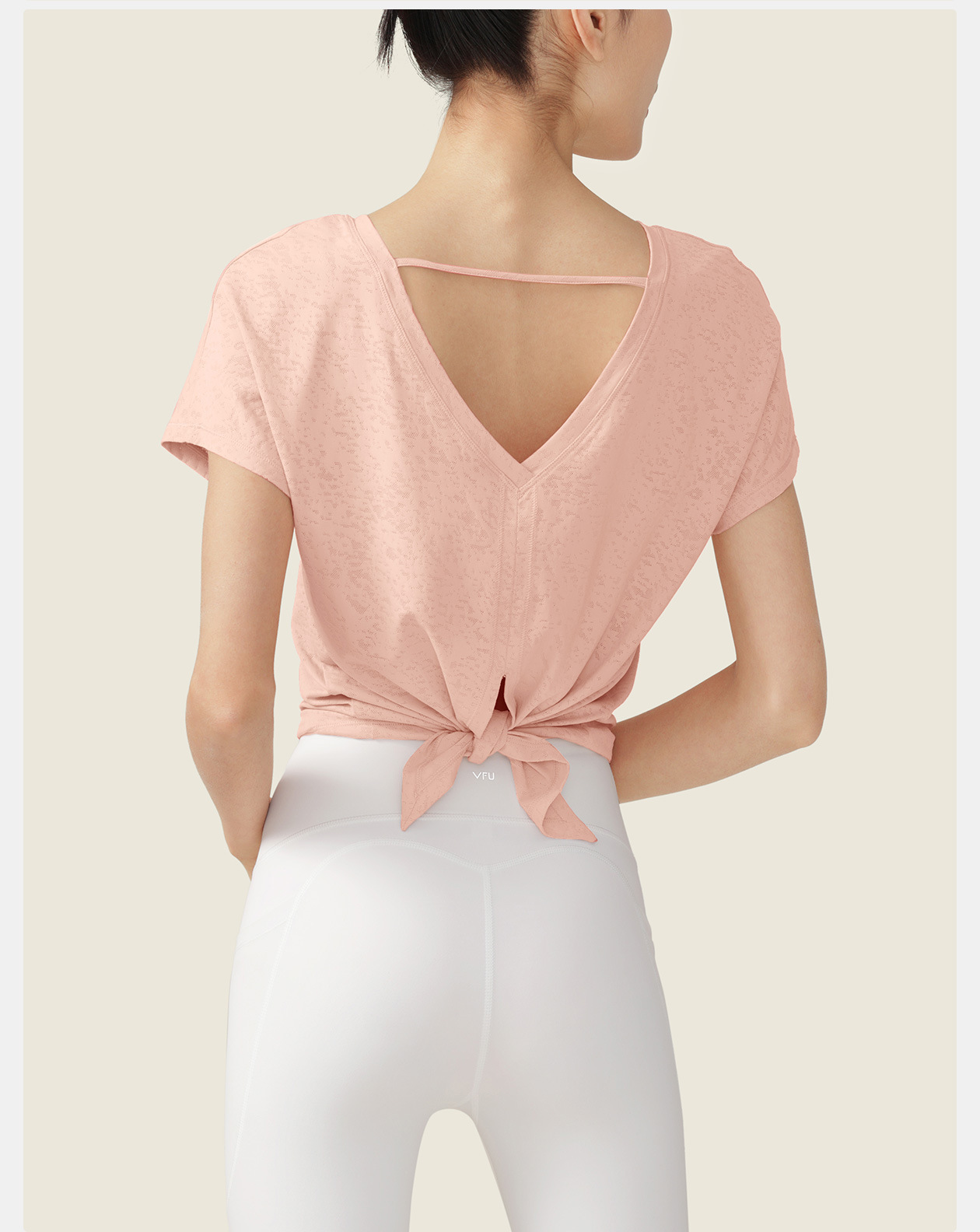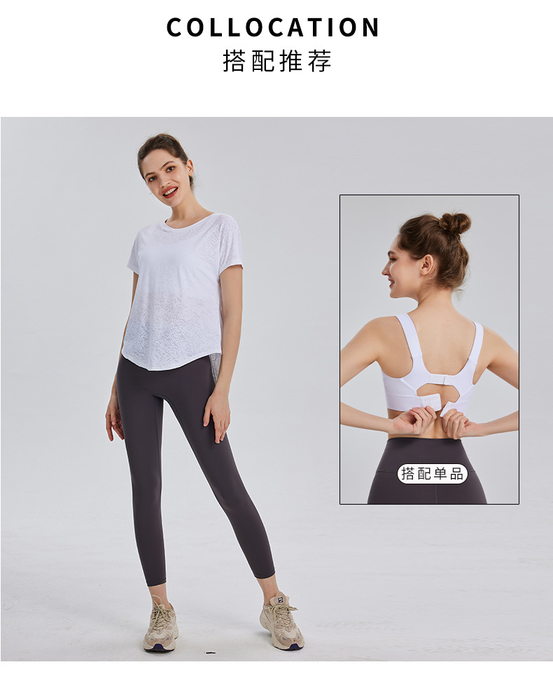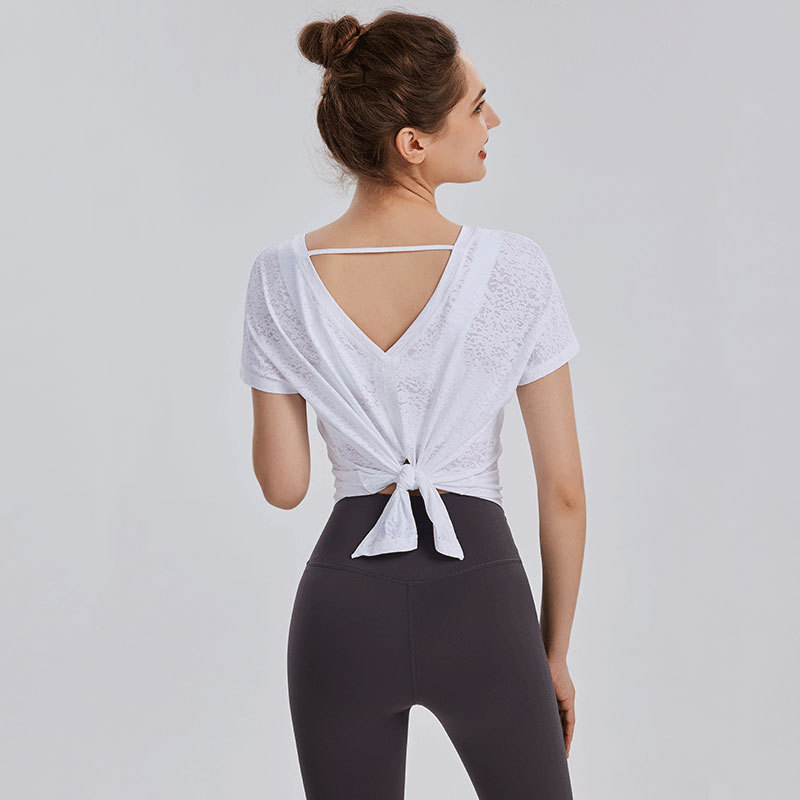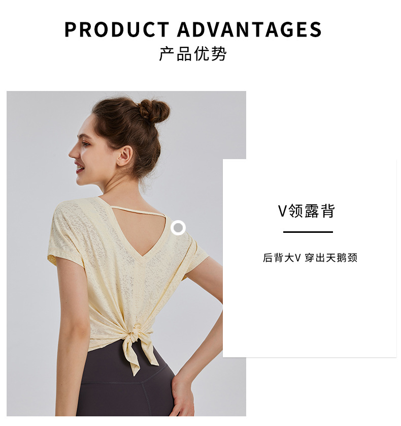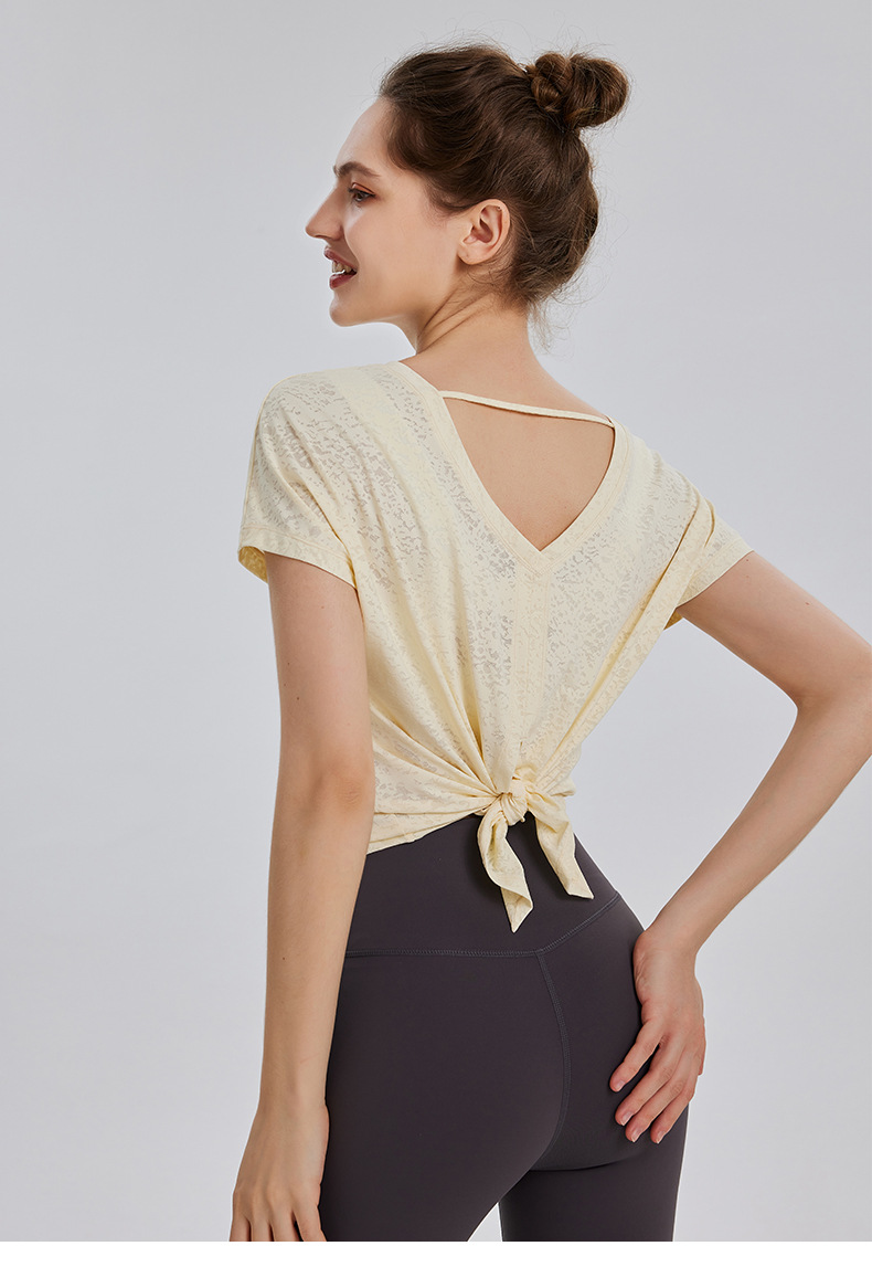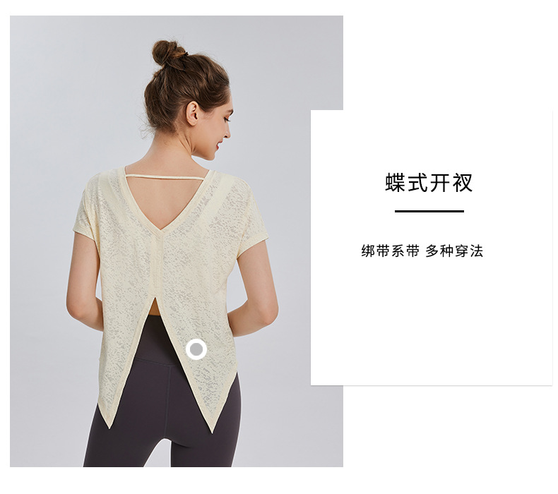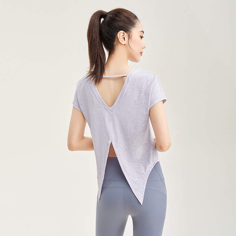 요가 의류 여성용 느슨한 스포츠 반팔 경량 통기성 블라우스 여름 아름다운 백 탑 스플릿 자카드 피트니스 티셔츠스토어 가기