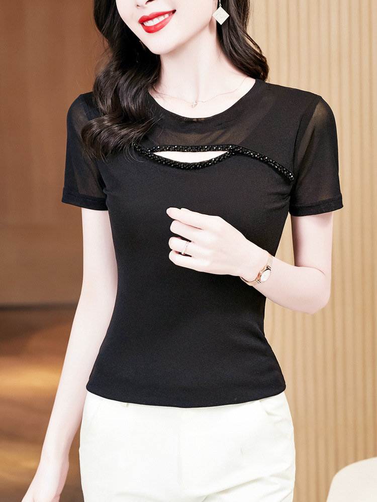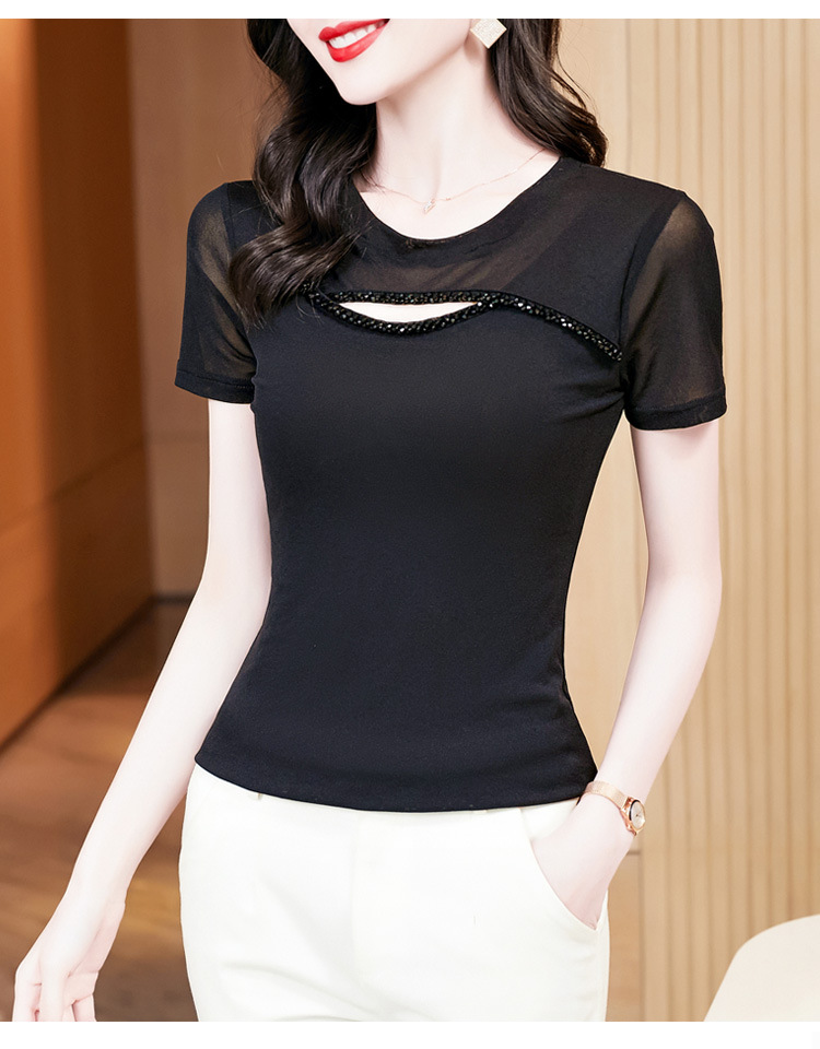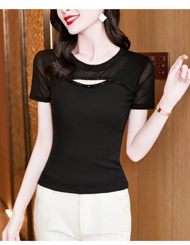 여름 2023 새로운 스타일 웨스턴 스타일 올매치 라운드 넥 중공 비드 메쉬 반팔 베이스 셔츠 티셔츠 슬림핏 슬리밍 탑