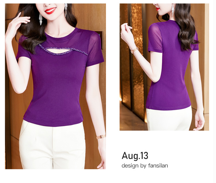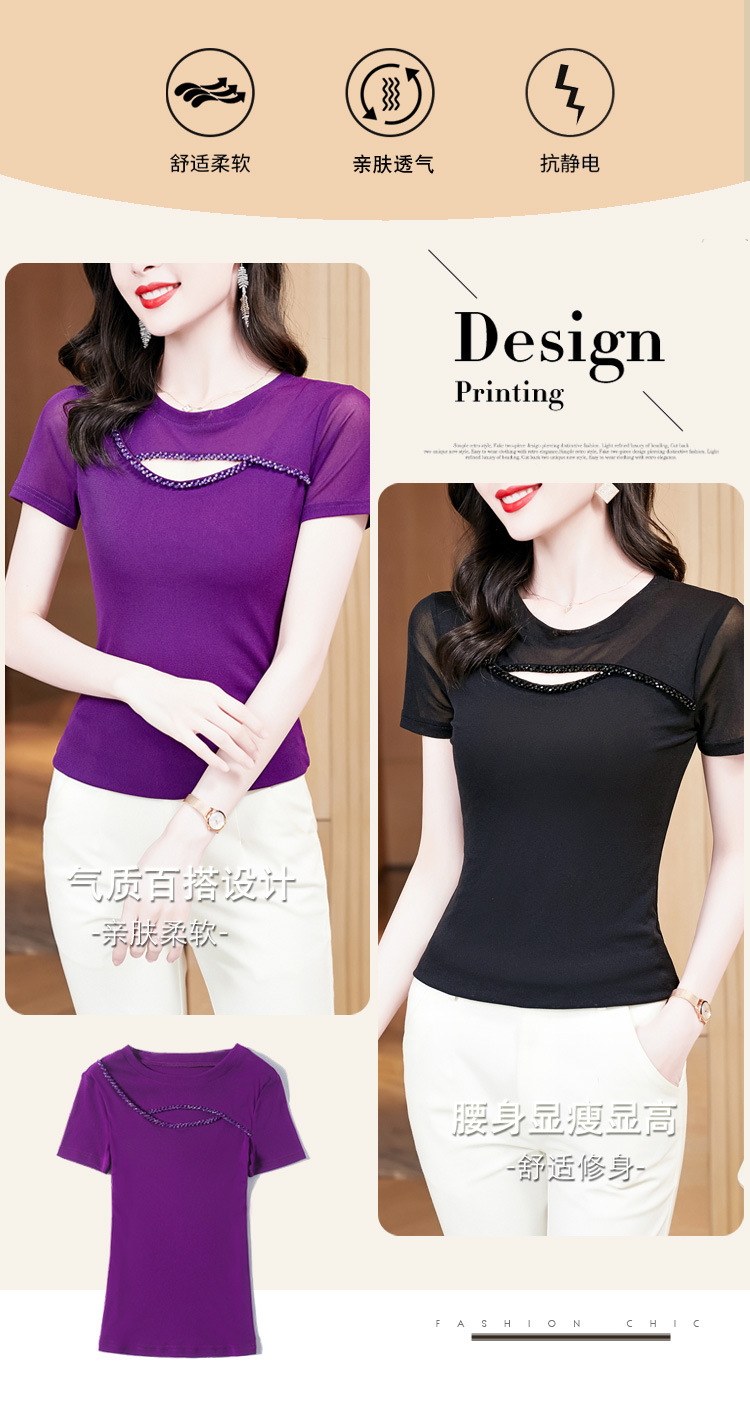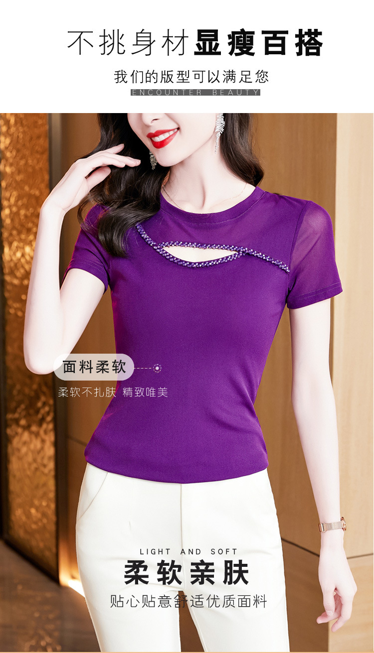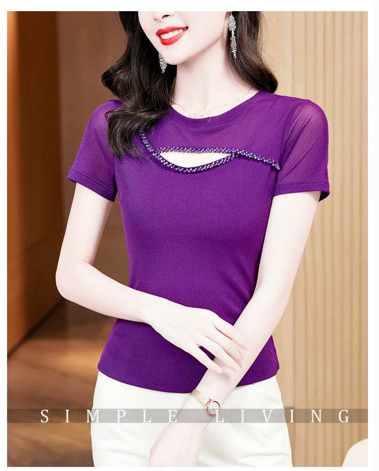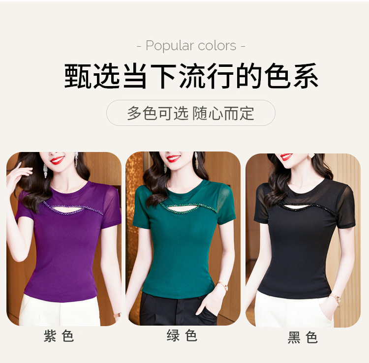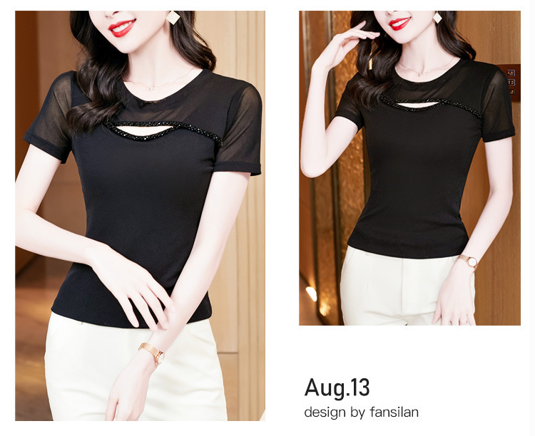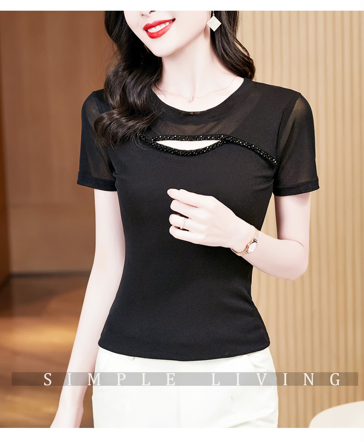 여름 2023 새로운 스타일 웨스턴 스타일 올매치 라운드 넥 중공 비드 메쉬 반팔 베이스 셔츠 티셔츠 슬림핏 슬리밍 탑스토어 가기