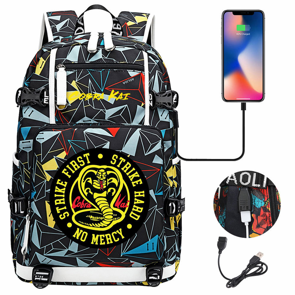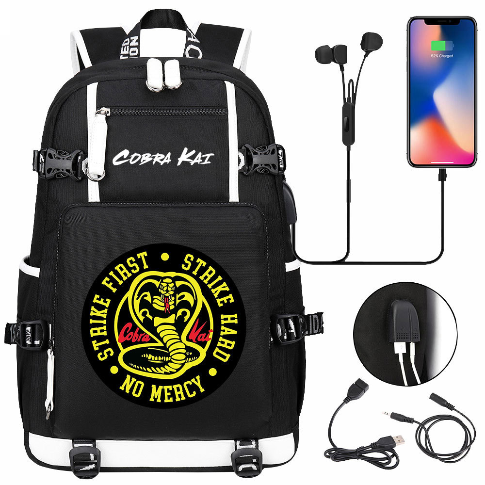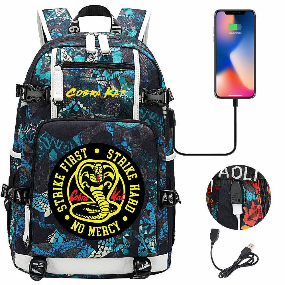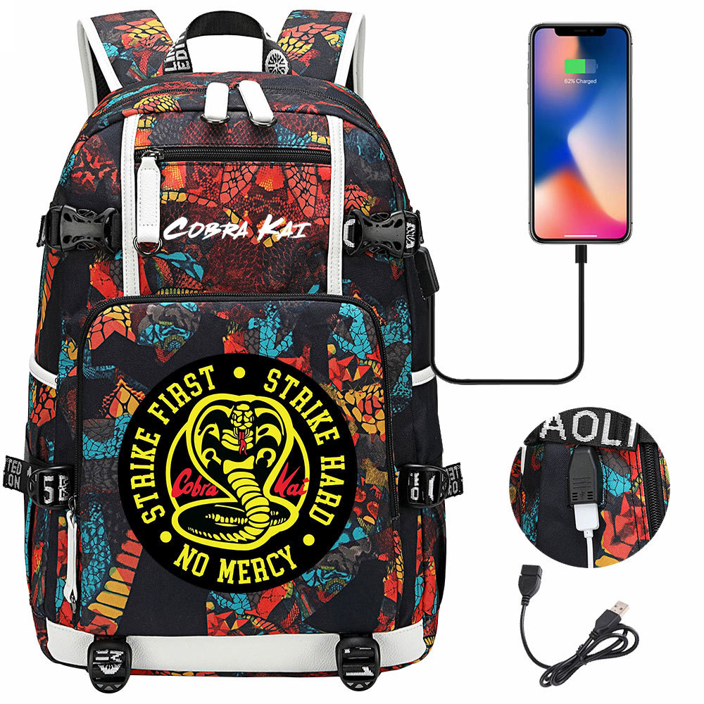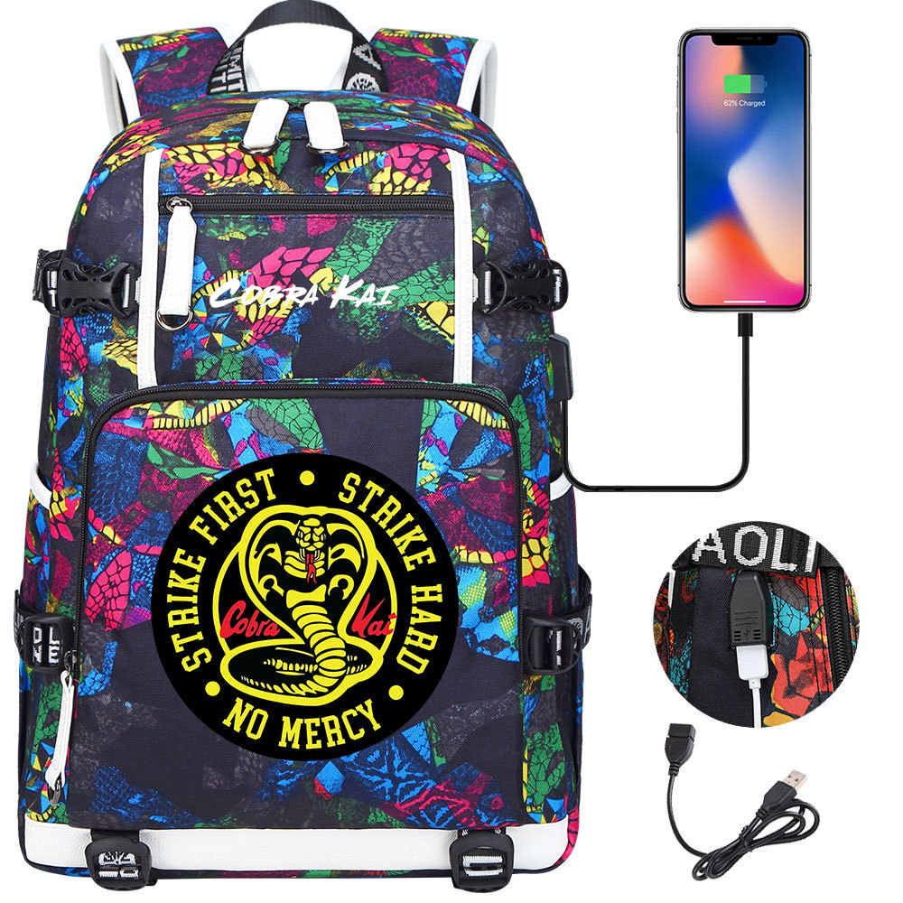 초등 및 중등 학생을위한 새로운 영화 코브라 프린트 USB 십대 책가방 남녀 공용 레저 여행 배낭스토어 가기