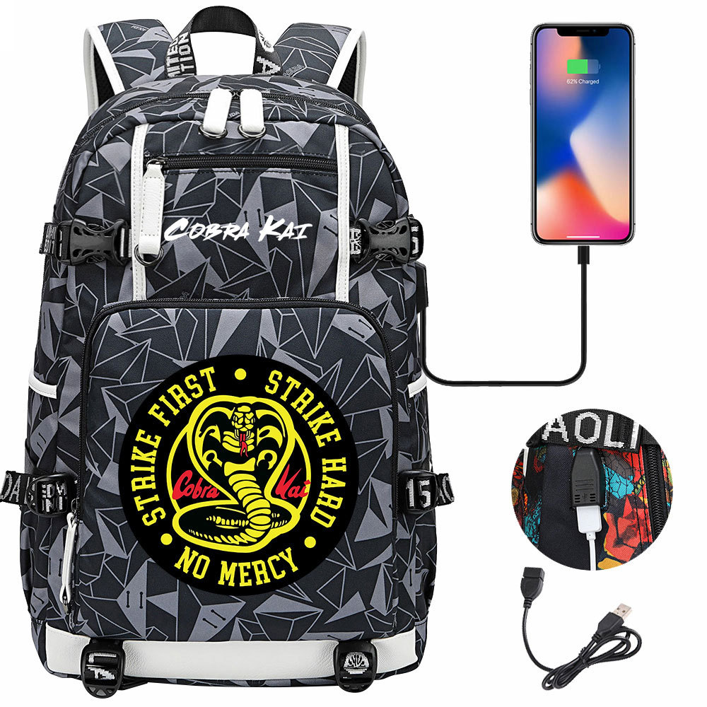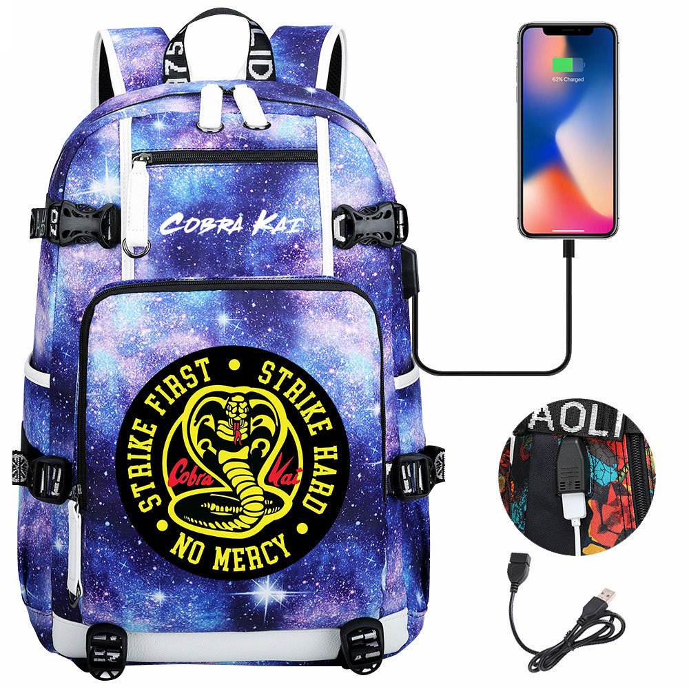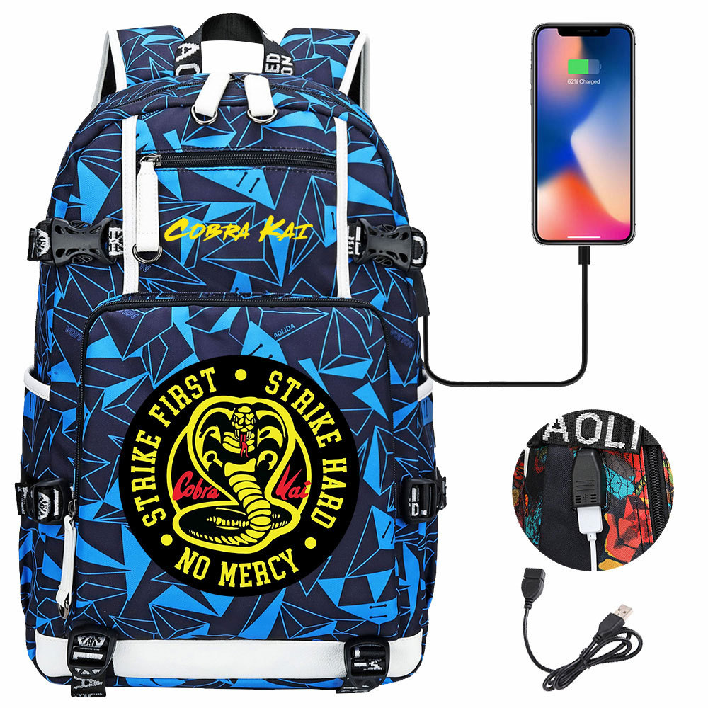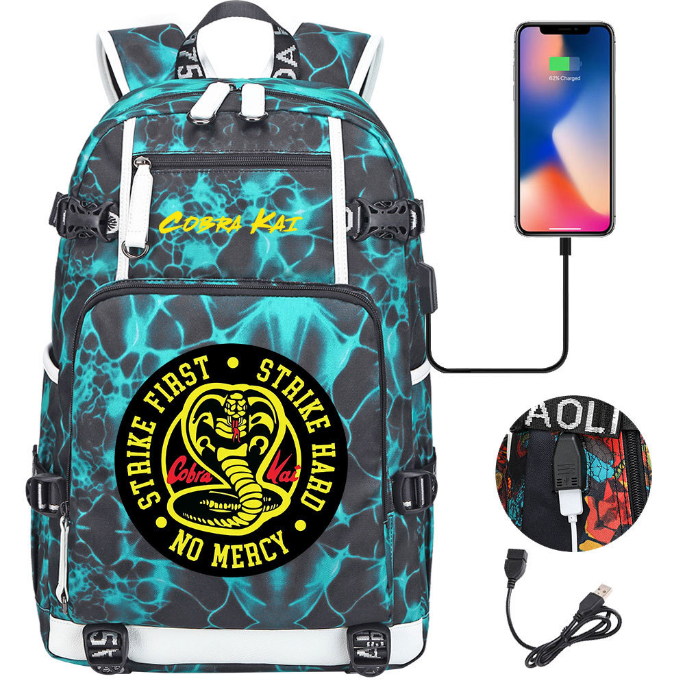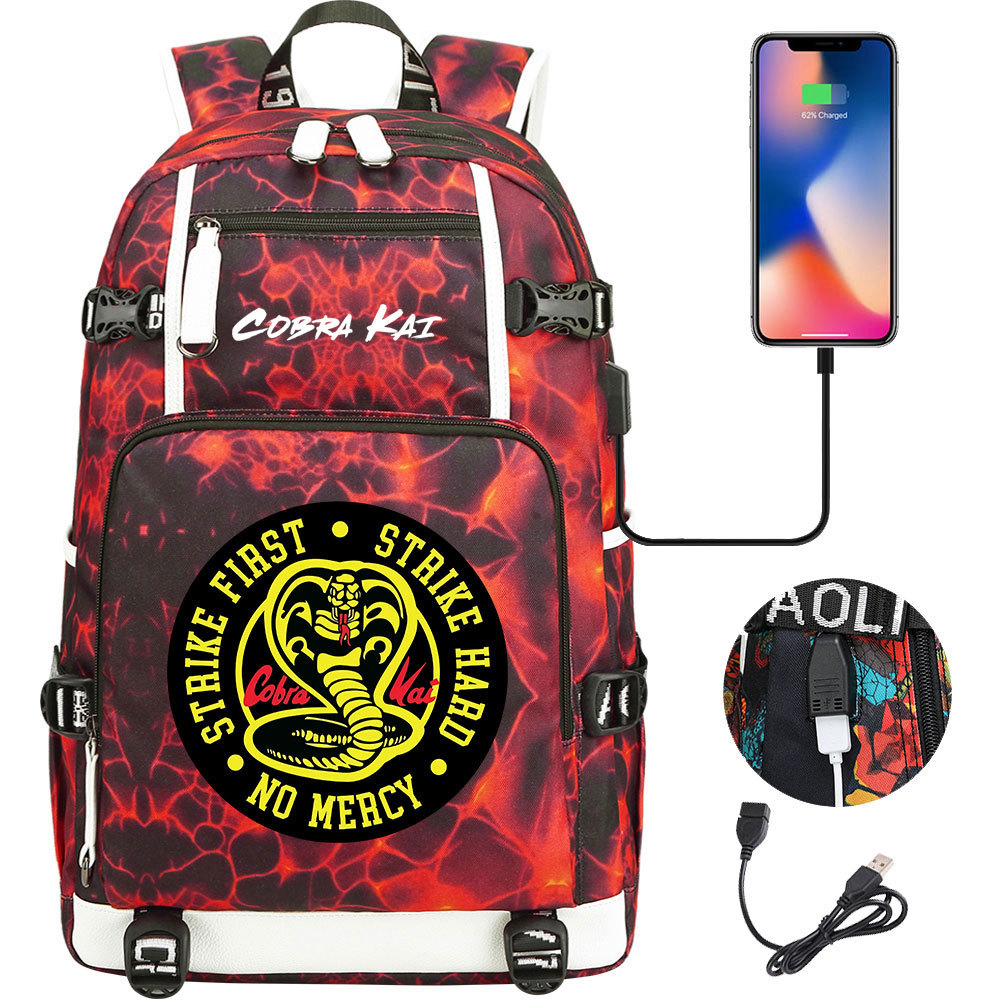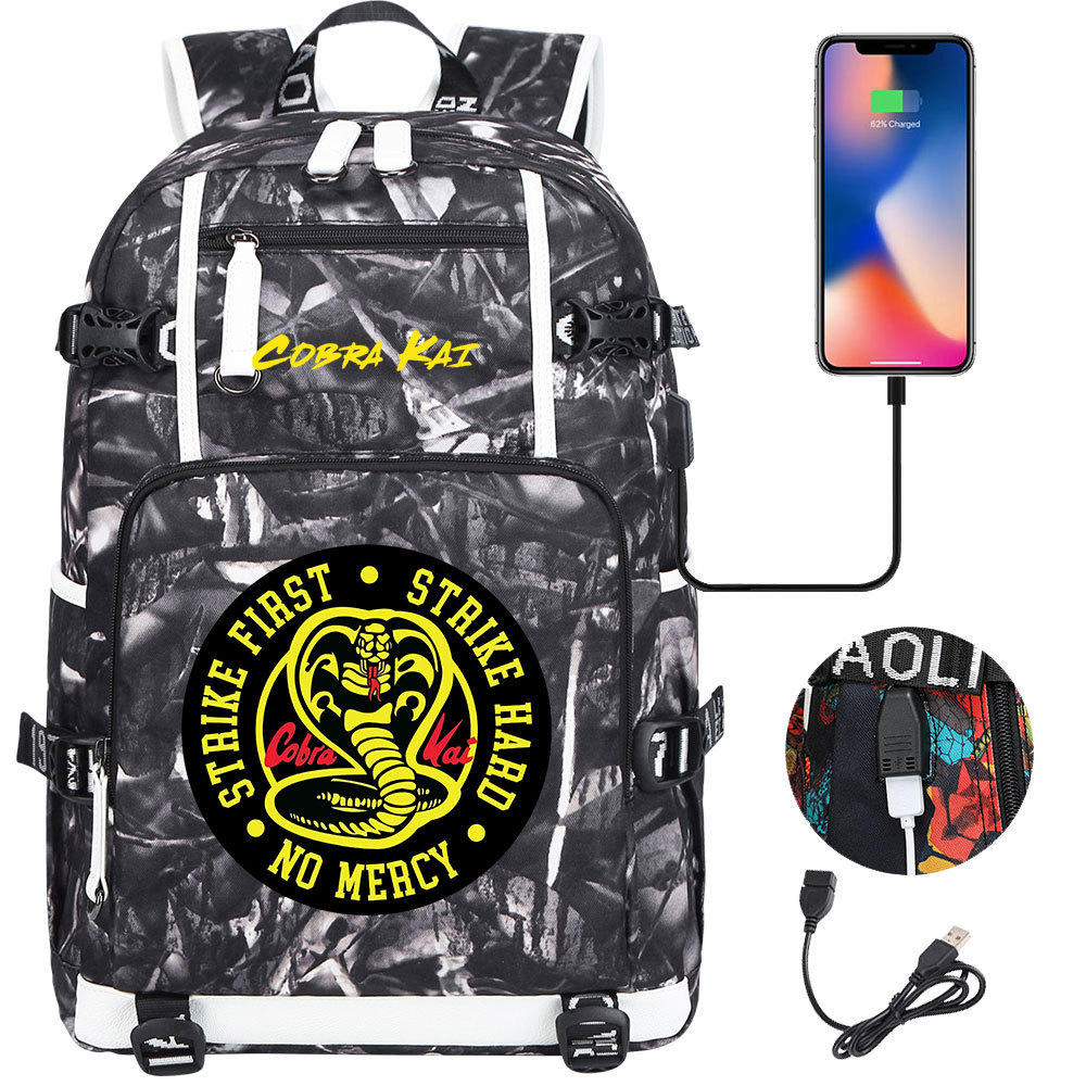 초등 및 중등 학생을위한 새로운 영화 코브라 프린트 USB 십대 책가방 남녀 공용 레저 여행 배낭스토어 가기
