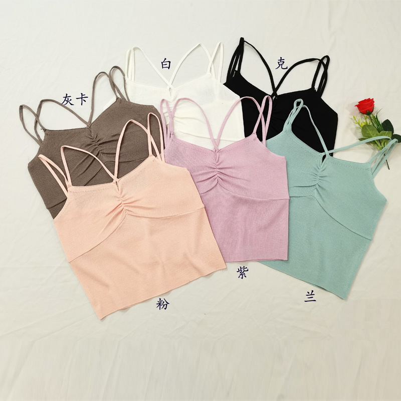 스파이스 걸 새로운 니트 아이스 실크 프론트 크로스 여성을위한 섹시한 주름 목선 슬링베이스 조끼와 아름다운 백 탑스토어 가기