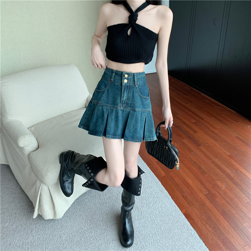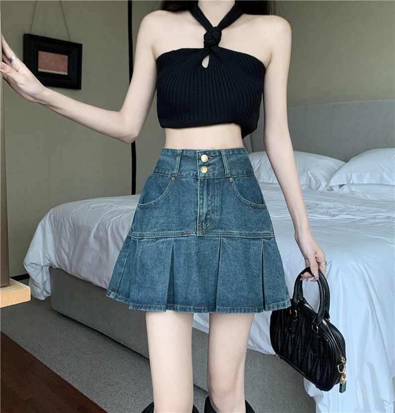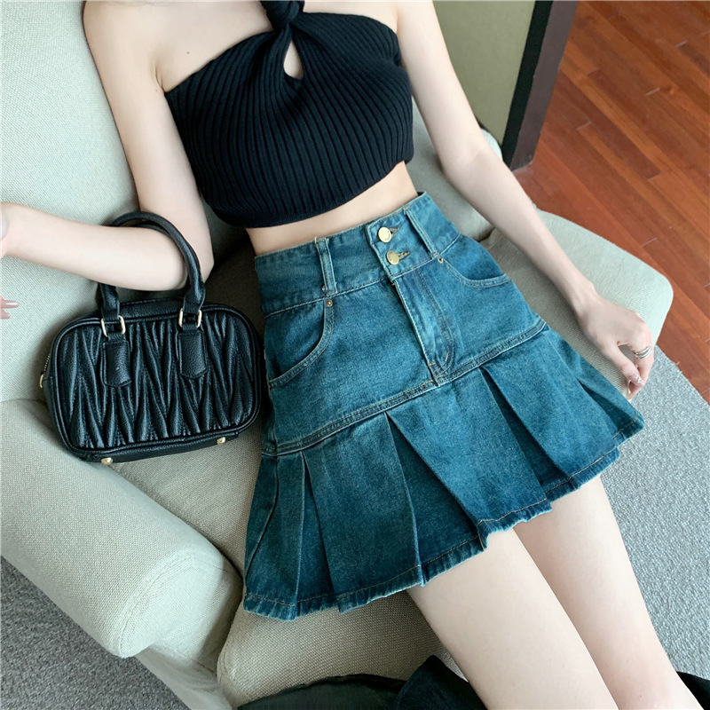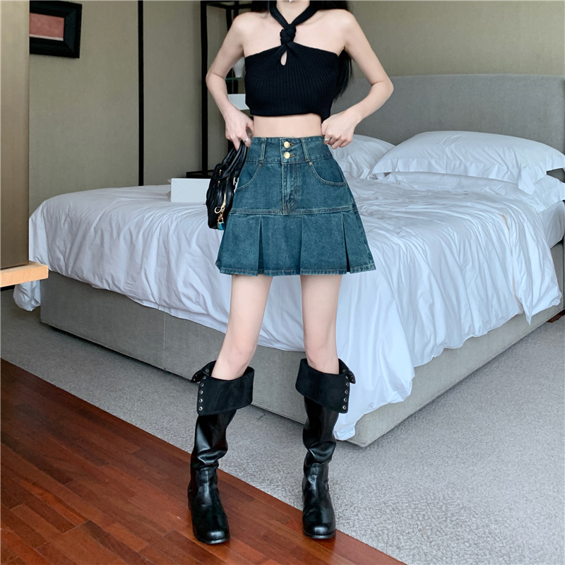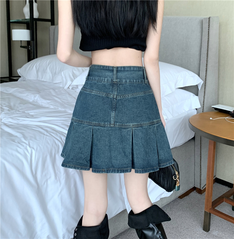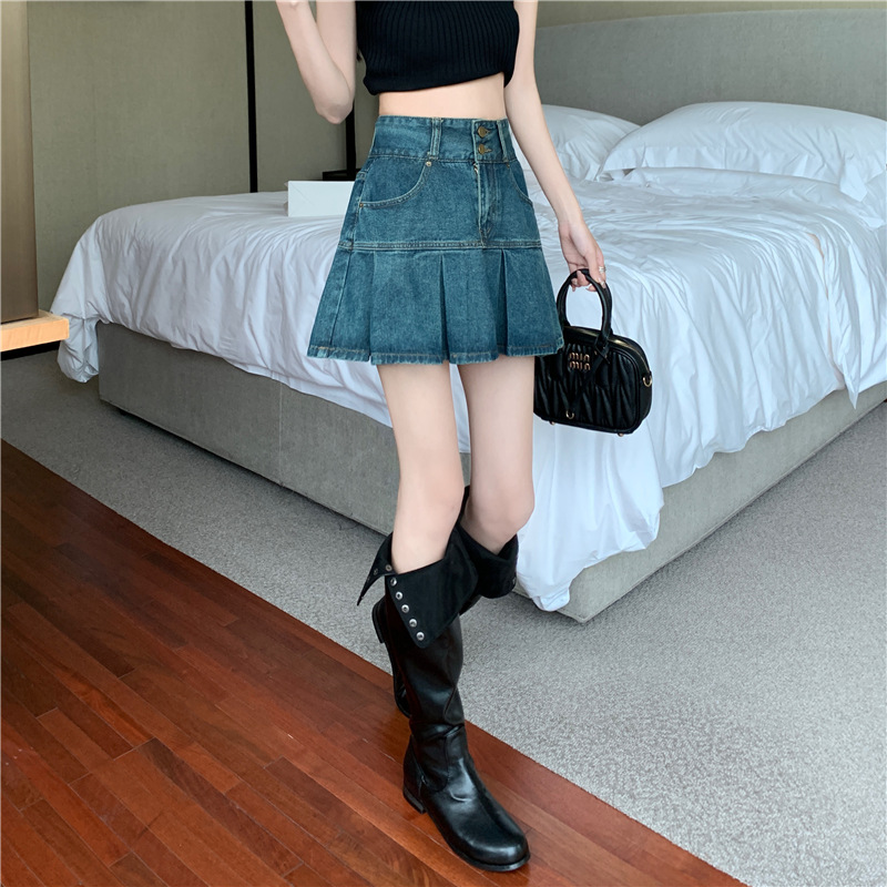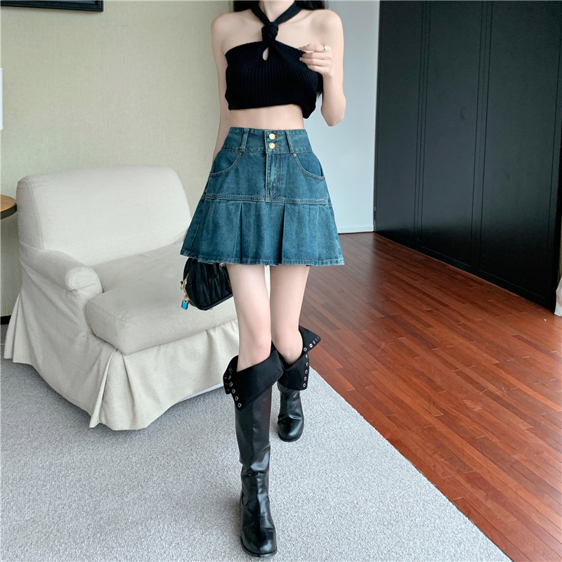 2023 여름 새로운 하이 웨이스트 데님 스커트 여자의 슬림 플러스 사이즈 엉덩이 커버 A 라인 엉덩이 반 주름 치마스토어 가기