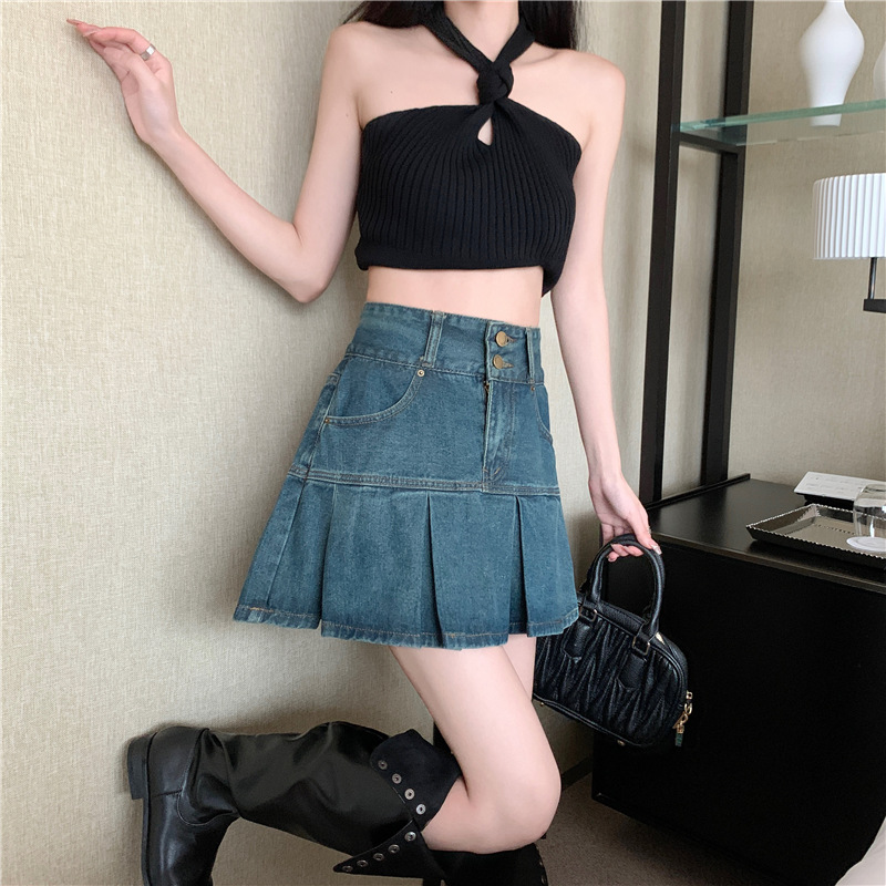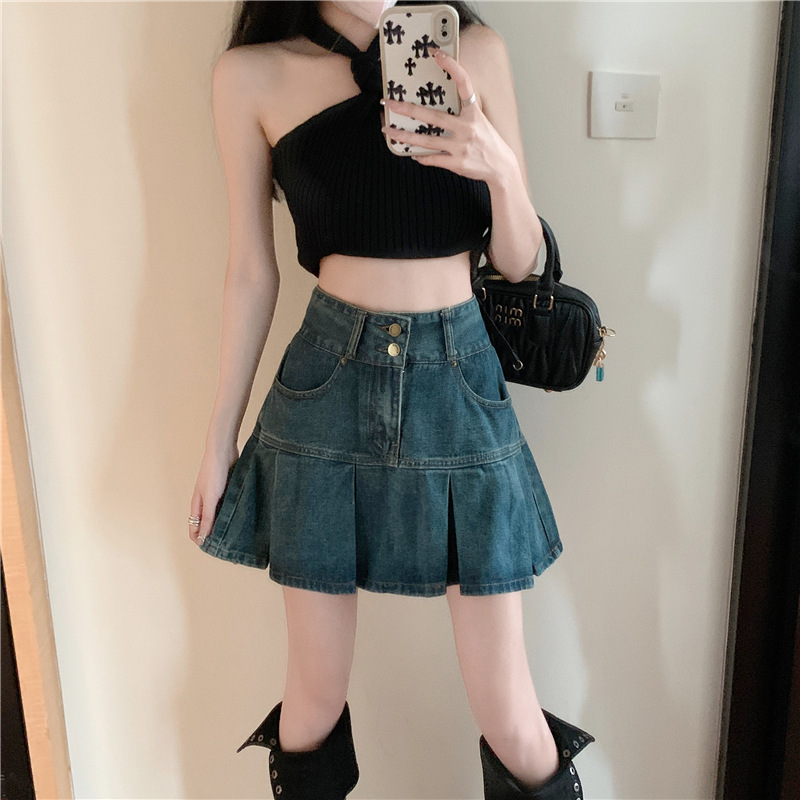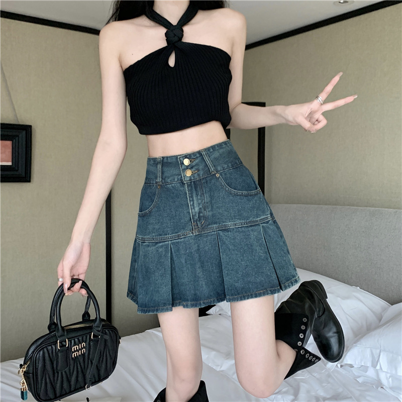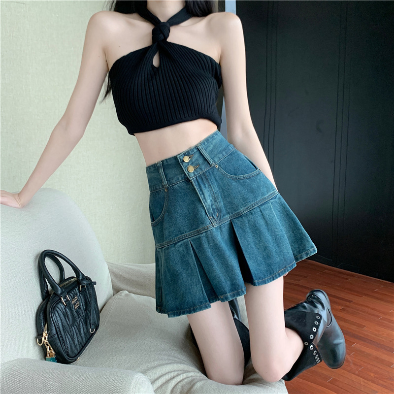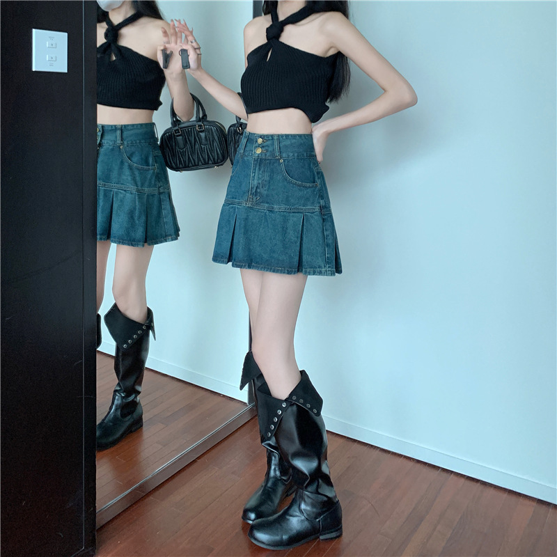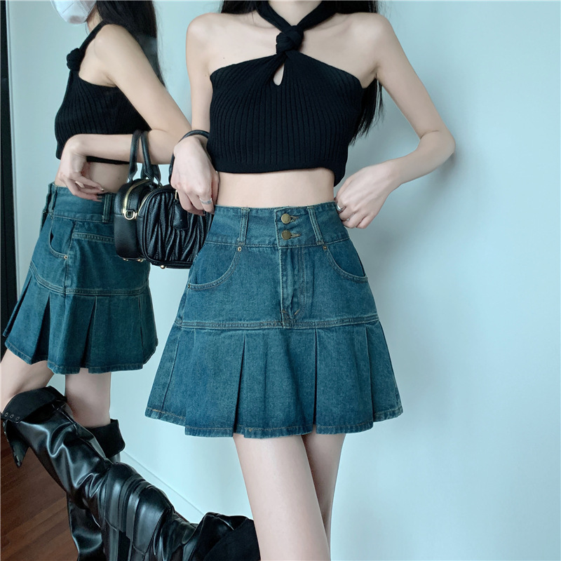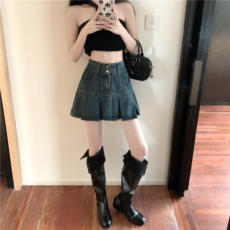 2023 여름 새로운 하이 웨이스트 데님 스커트 여자의 슬림 플러스 사이즈 엉덩이 커버 A 라인 엉덩이 반 주름 치마스토어 가기