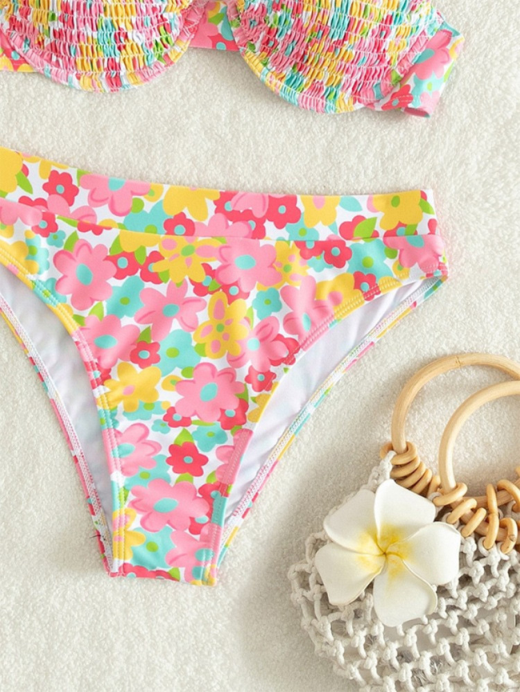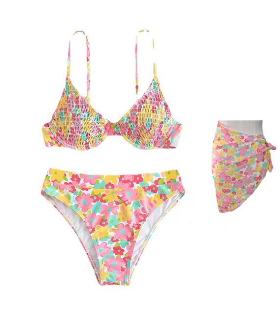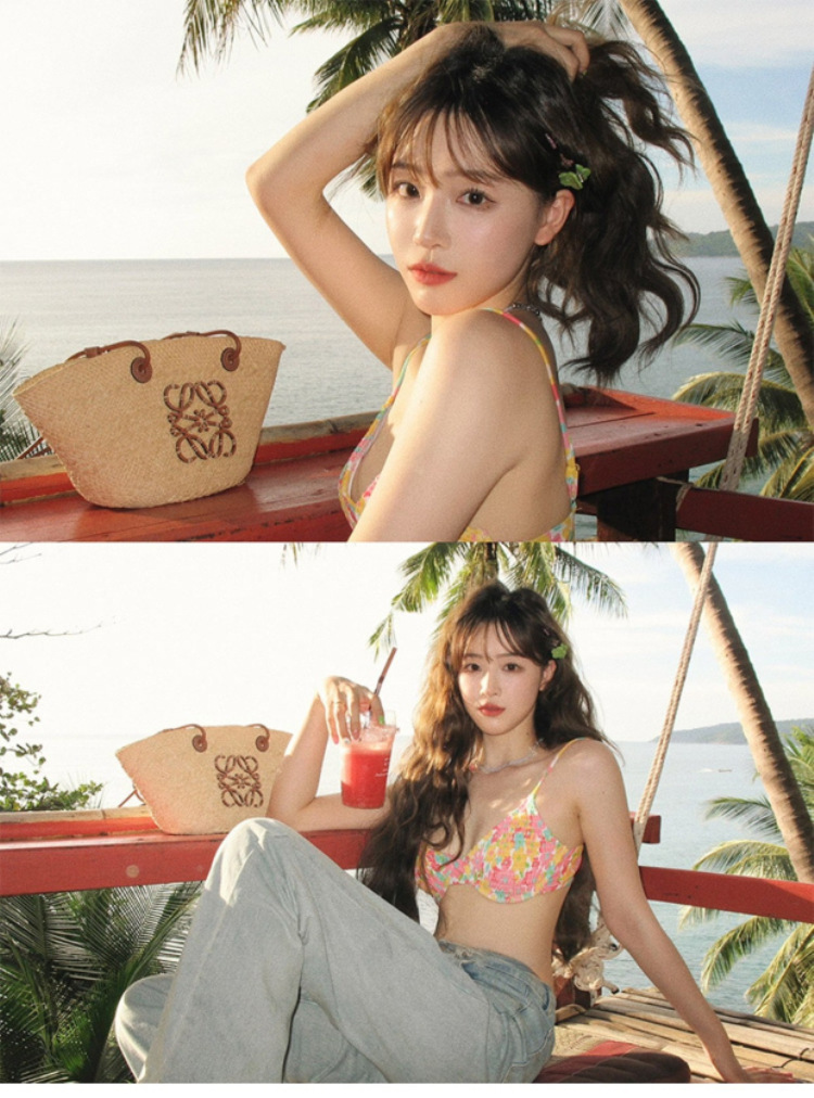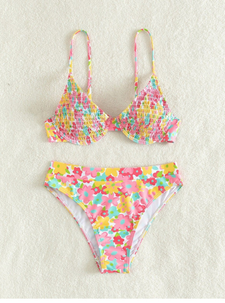 수영복 여성용 2023 뉴 컬러 프린트 플리츠 비키니 스틸 지원 작은 가슴 푸시 업 스플릿 인 온천 휴가